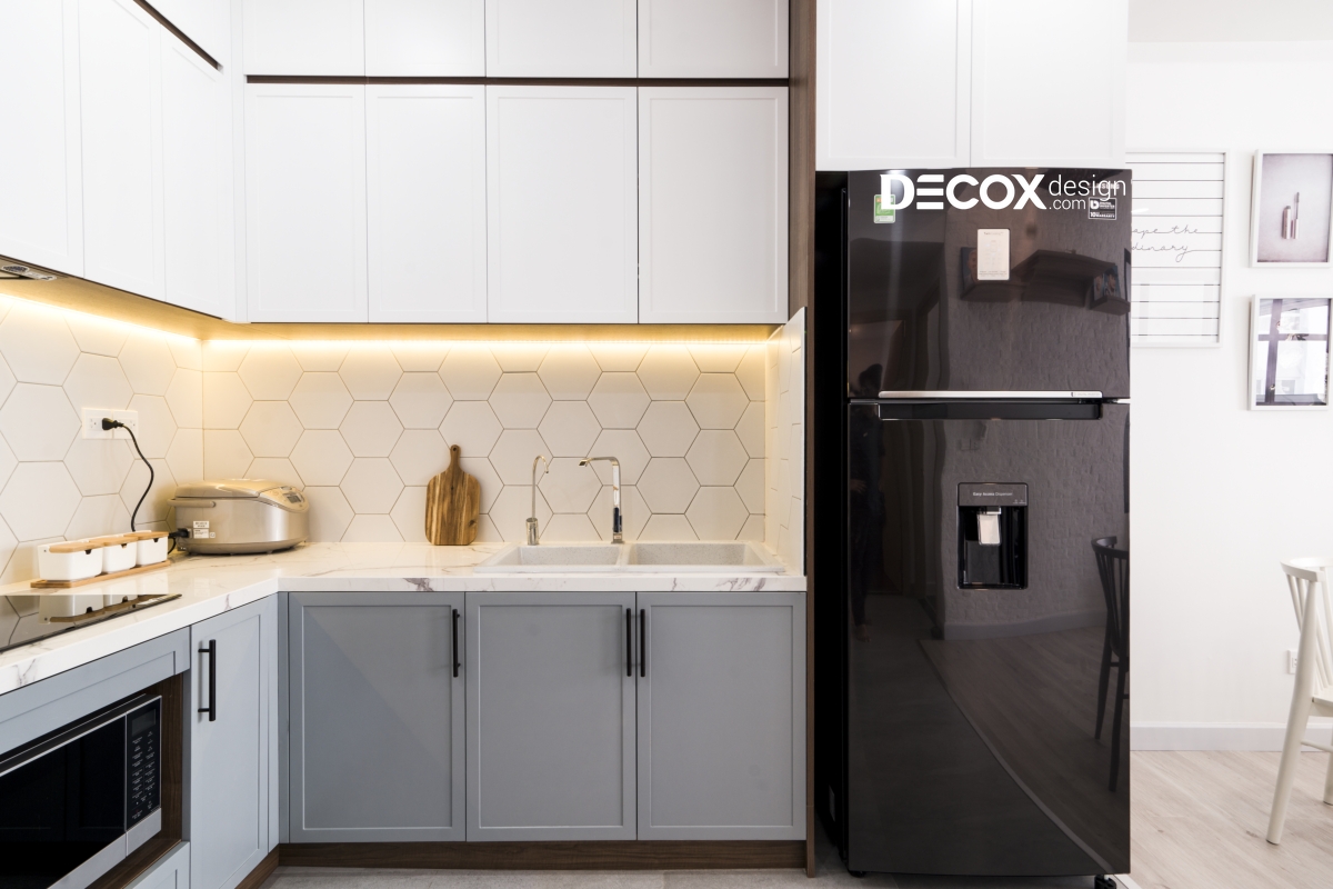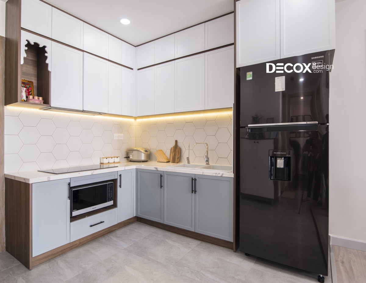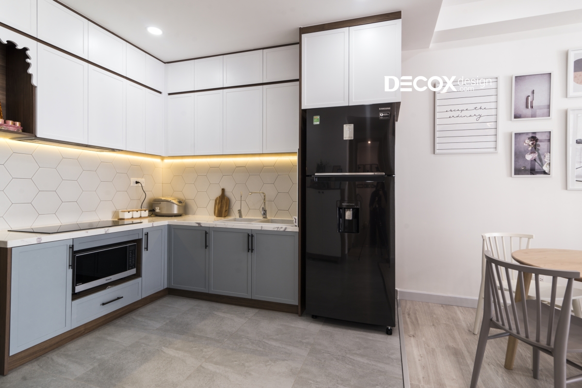 Bếp được ví như trái tim của cả ngôi nhà vì nó là nơi giữ lửa cho tổ ấm. Với diện tích không quá rộng như căn hộ này, kiểu bếp chữ L là lựa chọn thông minh. Mỗi góc bếp lần lượt được trang bị bếp điện âm và bồn rửa bát, khoảng trống ở giữa thuận tiện cho bà nội trợ nấu nướng.