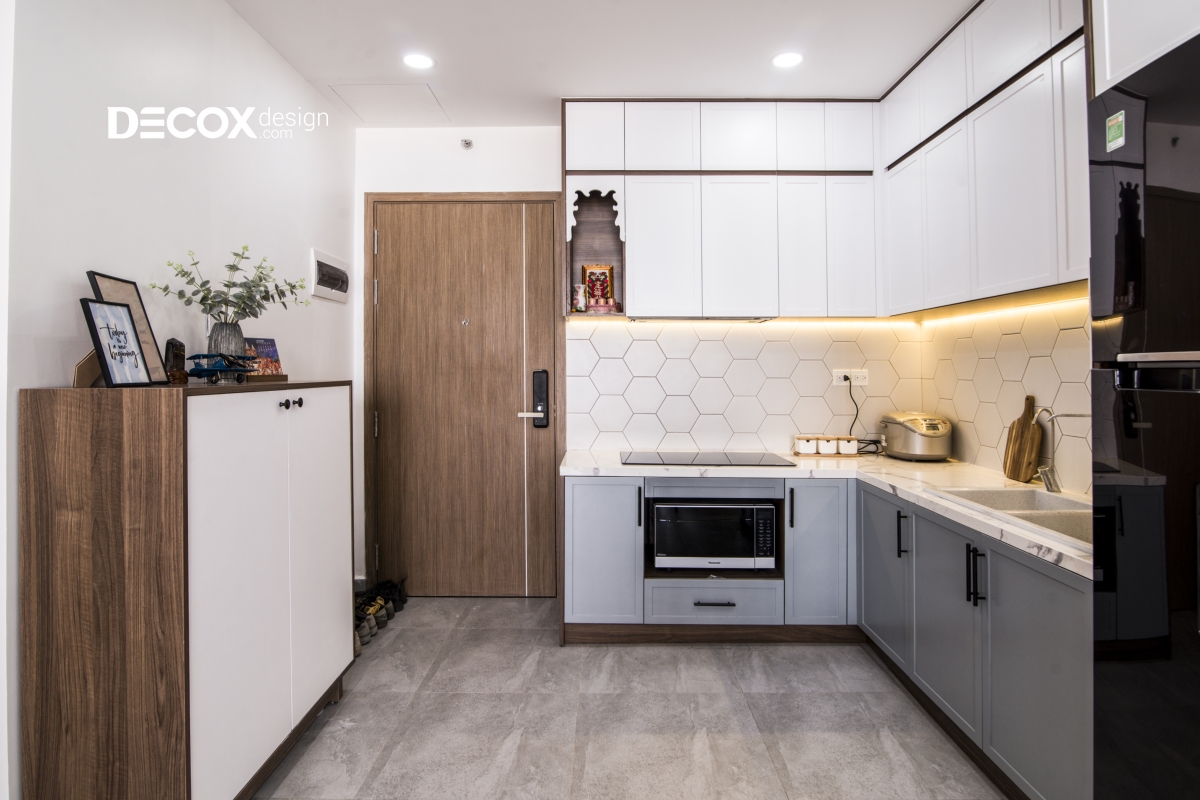 Màu sắc bếp chọn sử dụng màu trắng và xám xanh kết hợp cùng màu gỗ nâu tạo nên nét hiện đại. Hệ tủ bếp đụng trần tối đa không gian lưu trữ được nhiều đồ đạc hơn. Phần sàn bếp ốp gạch giả xi măng có độ nhám, vừa tăng độ an toàn, giảm trơn trượt vừa hạn chế vết bẩn từ bếp dễ nhìn thấy.