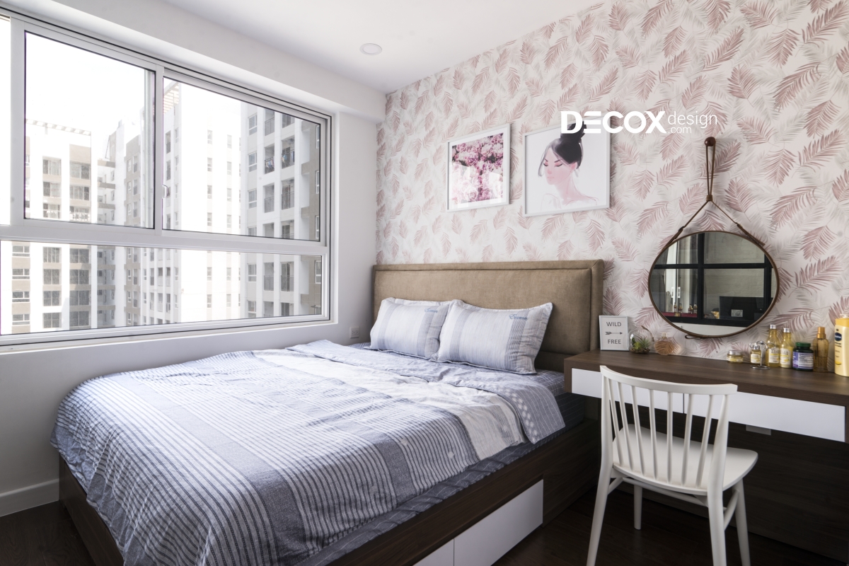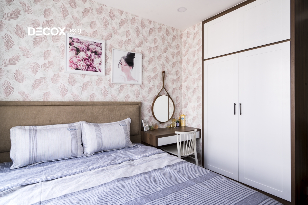 Từ phòng khách nhìn vào thông qua vách kính chính là không gian phòng ngủ master. Căn phòng đơn giản được trang bị giường ngủ, bàn trang điểm và tủ quần áo âm tường. Phần đầu giường bọc vải tạo sự thoải mái nghỉ ngơi và tường phòng ngủ được trang trí bằng giấy dán tường và khung tranh họa tiết nhẹ nhàng tông màu hồng nữ tính.
