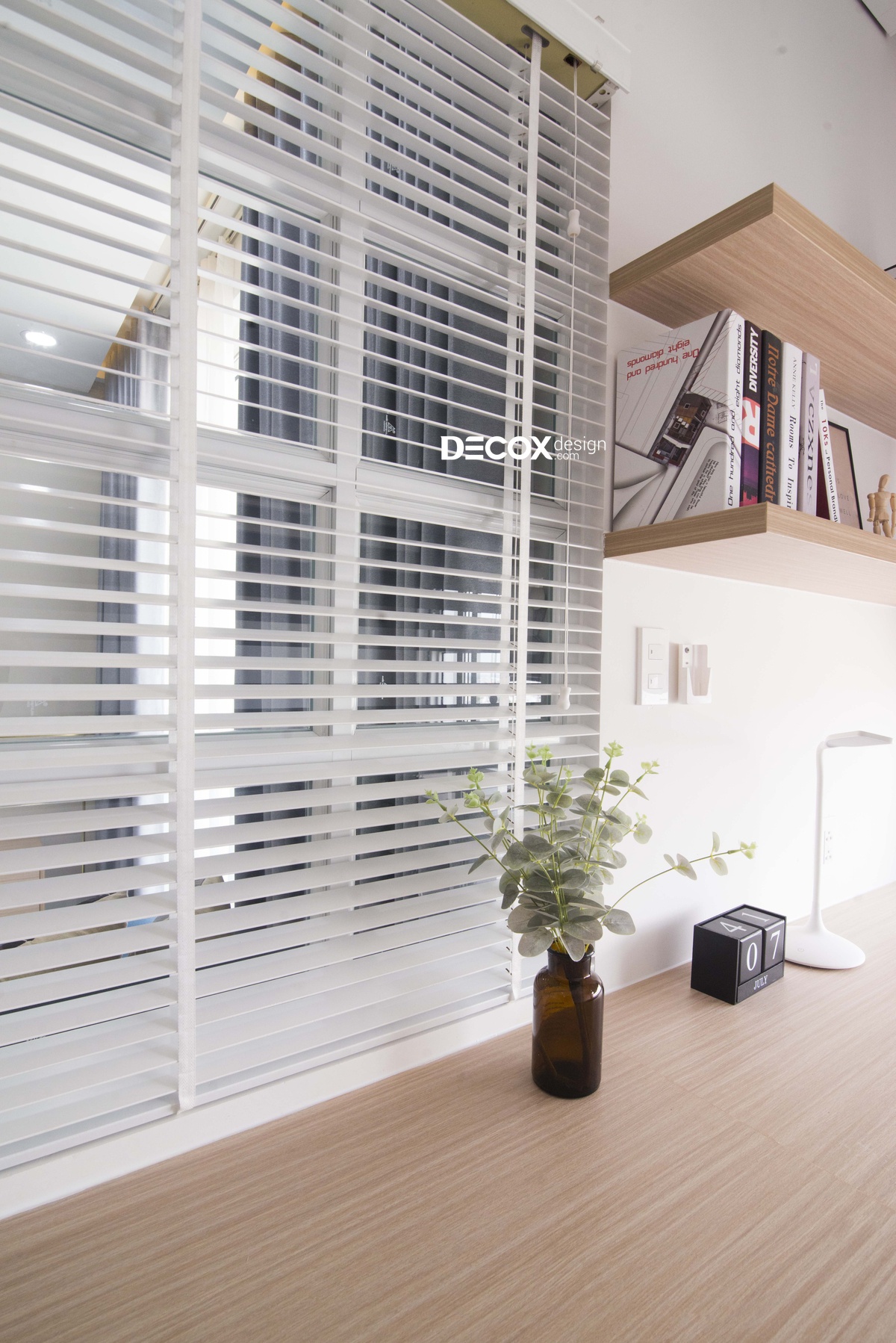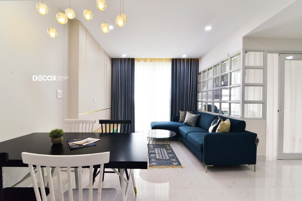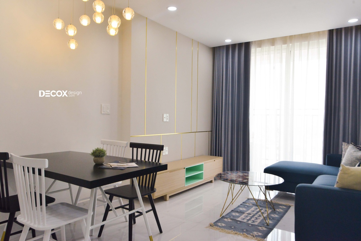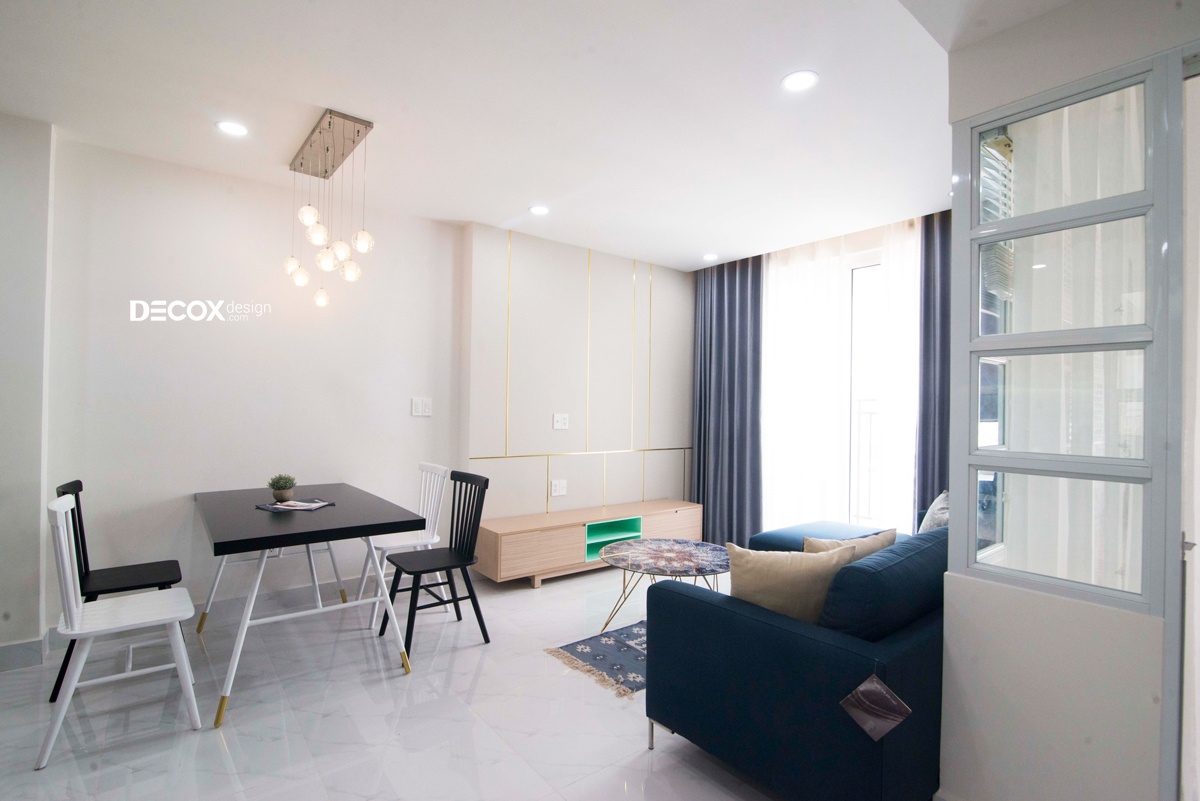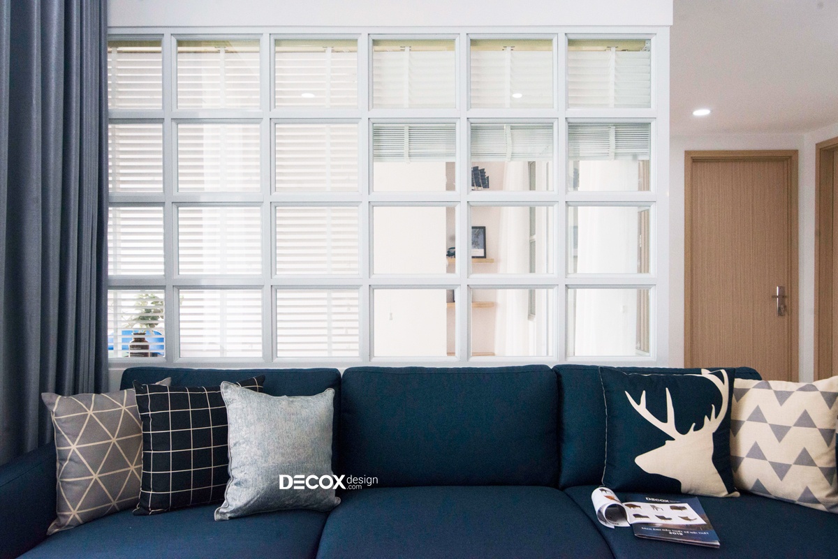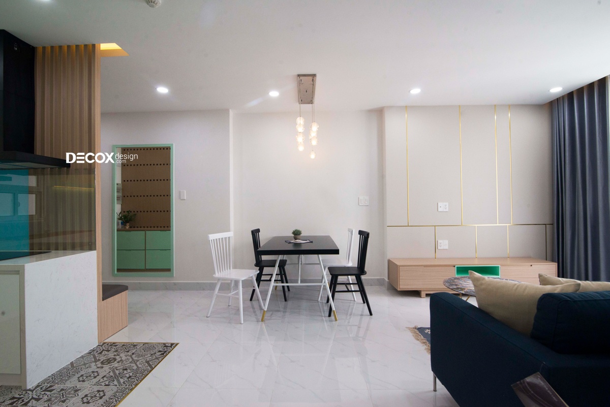 Decox Design lựa chọn thiết kế theo kiểu nhà hiện đại, tươi sáng, đơn giản, không cầu kỳ ở nội thất hay sử dụng quá nhiều màu sắc rực rỡ. Do đó, kiến trúc sư đã chọn tông màu trắng là tông màu chủ đạo cho căn hộ này. Điểm nhấn cũng căn hộ là phần nội thất, màu xanh dương của chiếc ghế và kèm một ít xanh của rèm cửa cũng tạo nên điểm nhấn phá cách cho căn hộ.