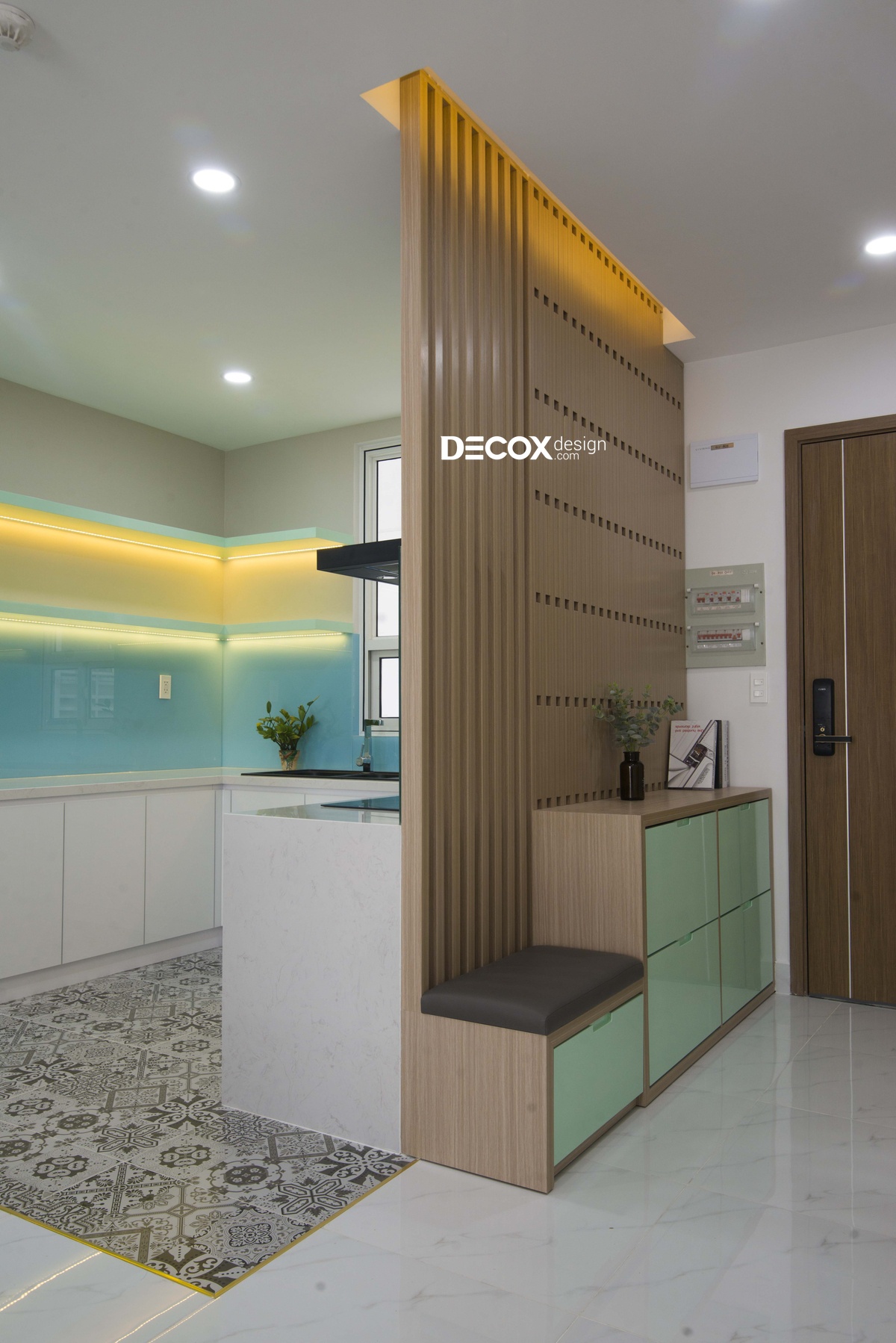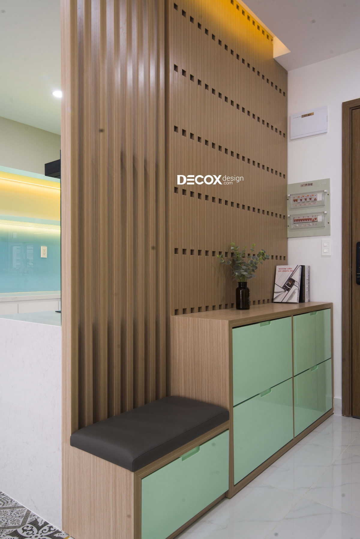 Thiết kế nội thất chung cư hiện đại, đơn giản từ bộ đèn trần, bộ sofa đều được gia chủ lựa chọn kỹ càng. Để tránh bị đơn điệu, căn hộ được lắp thêm gỗ để tạo nét lôi cuống ấn tượng cho thị giác.Sở hữu được 5 kệ chứa giày bằng gỗ rộng rãi và có vị trí ngồi mang giày êm ái. Hiện đại, tinh tế và tiện ích cho người dùng.