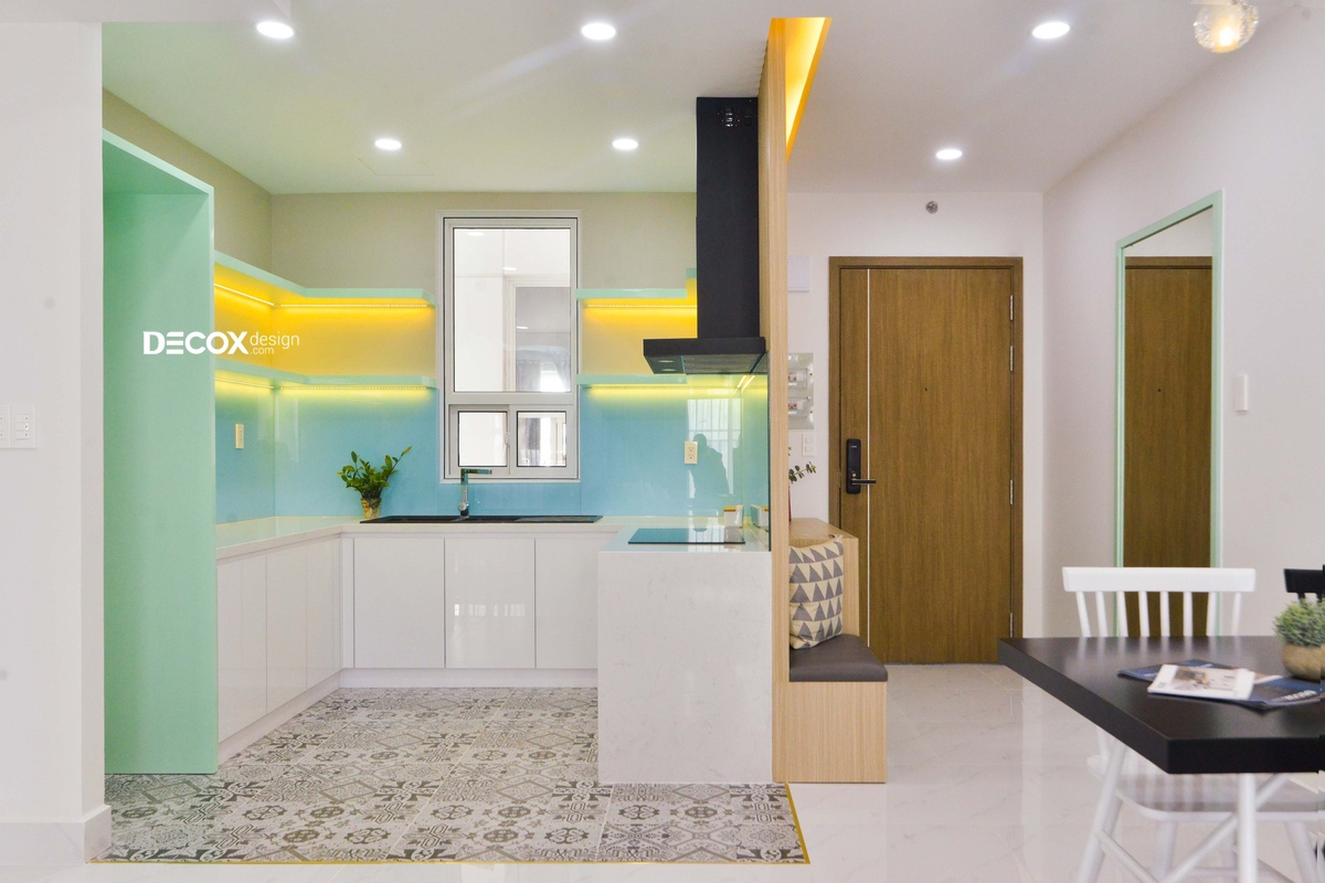 Phòng bếp được ốp gạch bằng màu xanh da trời thể hiện sự mát mẻ bóng loáng, sạch sẽ khi nấu nướng. Bên cạch đó còn tích hợp thêm hệ thống đèn led làm nổi bật kệ tủ. Khu vực bếp được lót gạch theo phong cách vintage và được ngăn với phòng khách bằng vách gỗ được tạo hình giống rào chắn.