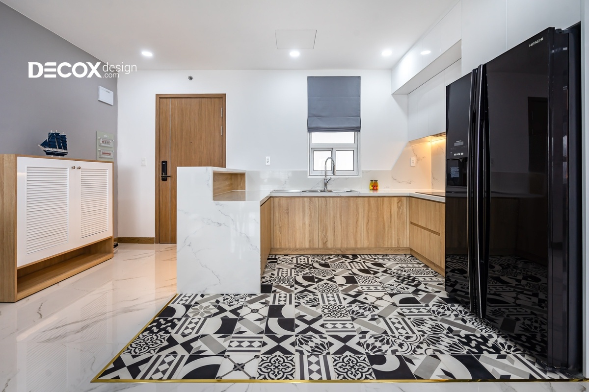 Nền gạch căn bếp được lót sàn bằng những ô gạch mang màu sắc của thập niên 80s vừa lạ vừa đẹp mắt cho không gian.
