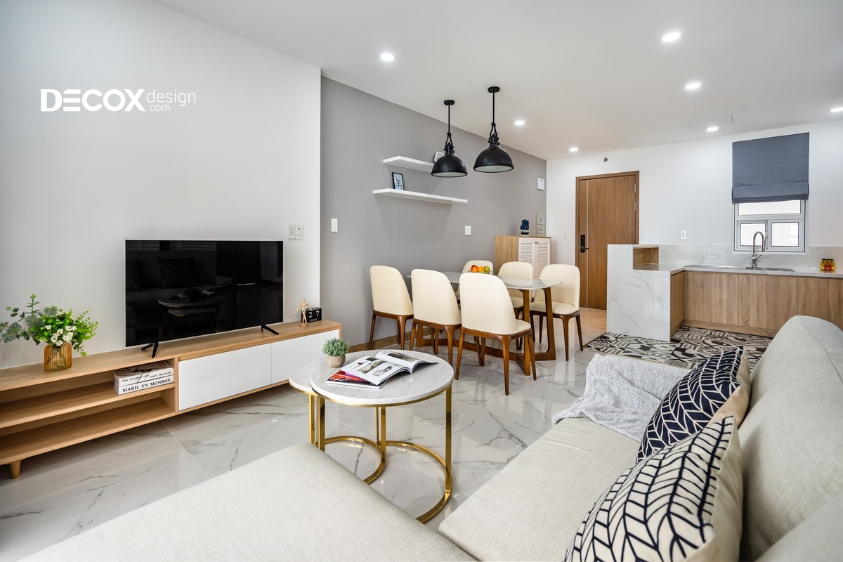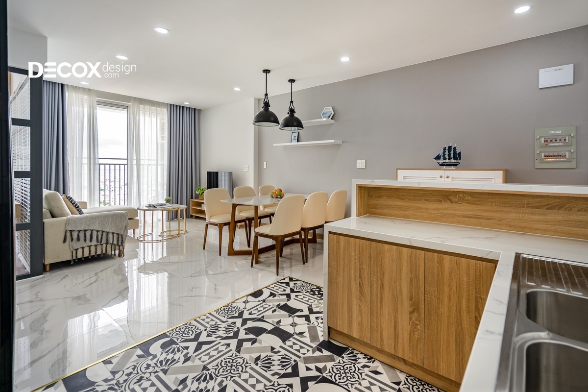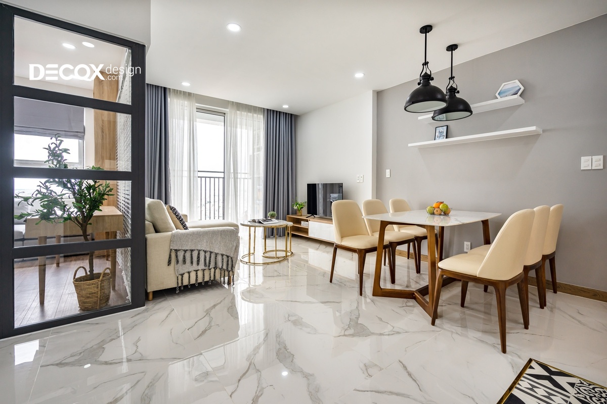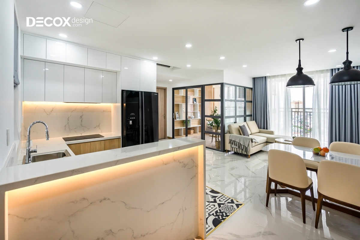 Đây là một căn hộ mở không gian. Một bức tường ở giữa sẽ làm cho căn hộ Richstar 85m2 trở nên tù túng và ngột ngạt vì thế đội ngũ thi công căn hộ chung cư Decox Design đã phá bỏ đi bức tường và thay vào đó là chiếc bàn ăn để ngăn cách giữa 2 không gian khách và bếp. Xóa bỏ đi khoảng cách và mang hơi hướng của sự hiện đại thời nay.