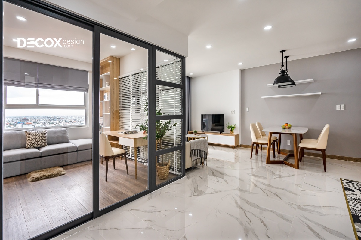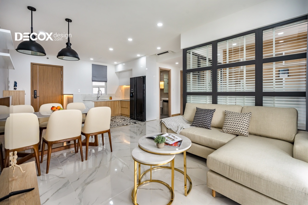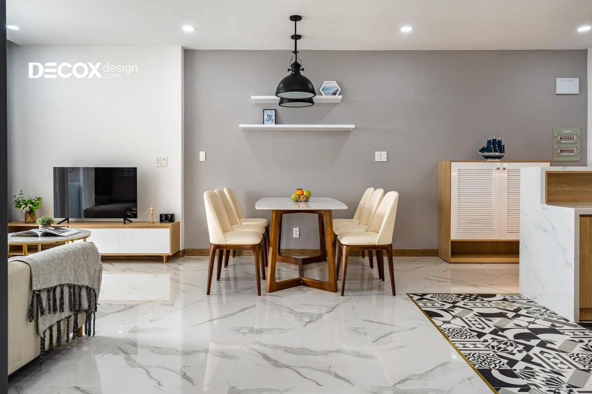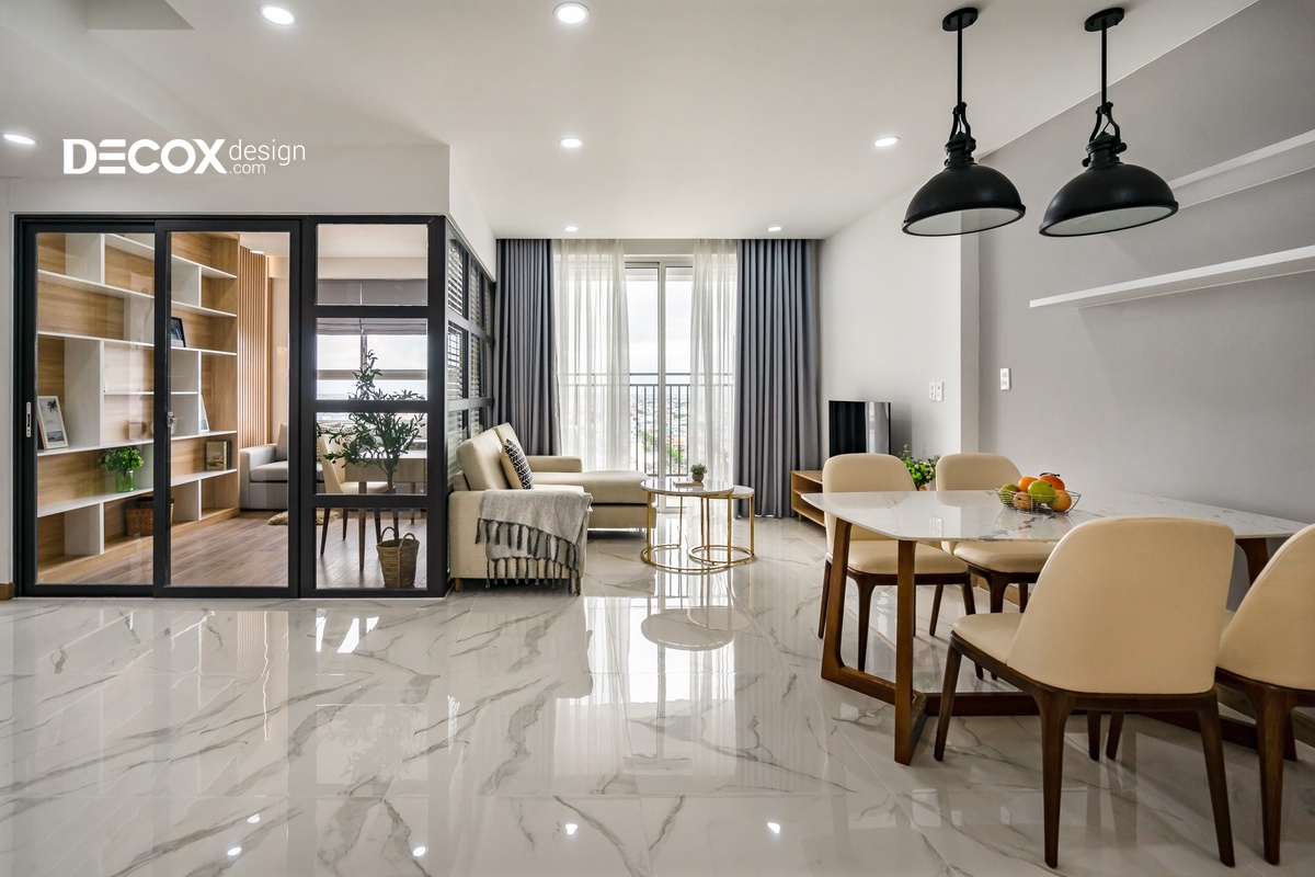 Đây là một căn hộ mở không gian. Một bức tường ở giữa sẽ làm cho căn hộ Richstar 85m2 trở nên tù túng và ngột ngạt vì thế đội ngũ thi công căn hộ chung cư Decox Design đã phá bỏ đi bức tường và thay vào đó là chiếc bàn ăn để ngăn cách giữa 2 không gian khách và bếp. Xóa bỏ đi khoảng cách và mang hơi hướng của sự hiện đại thời nay.