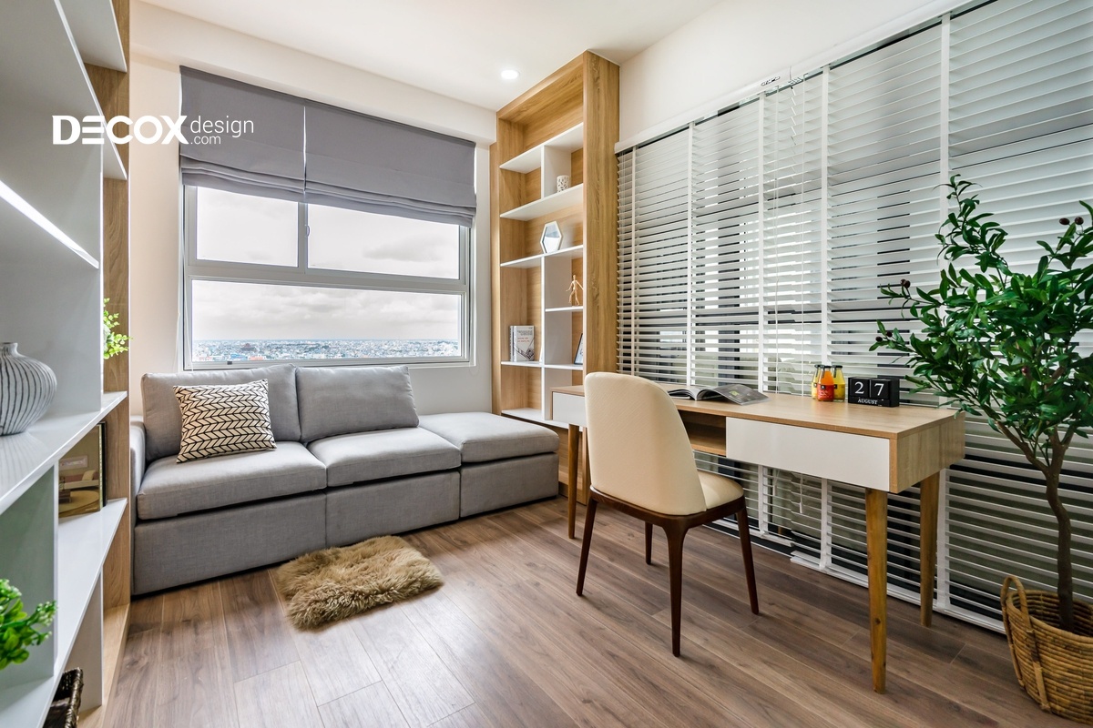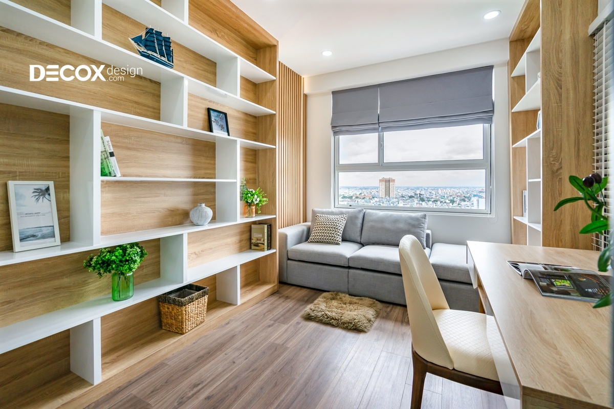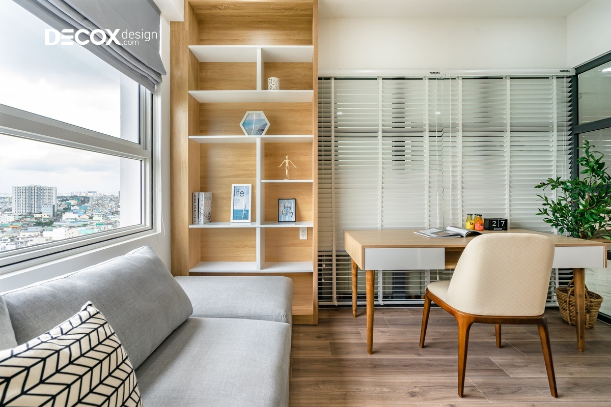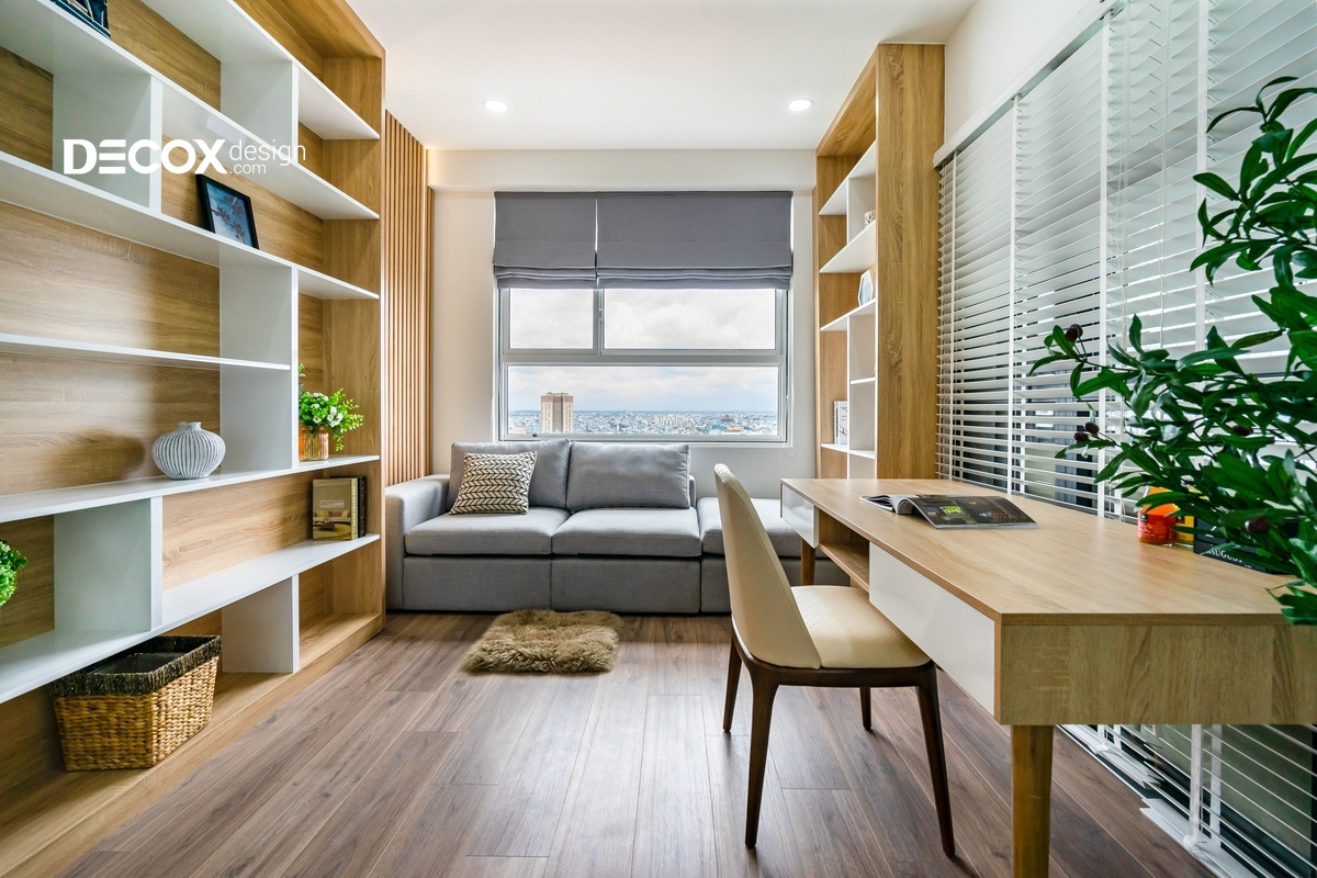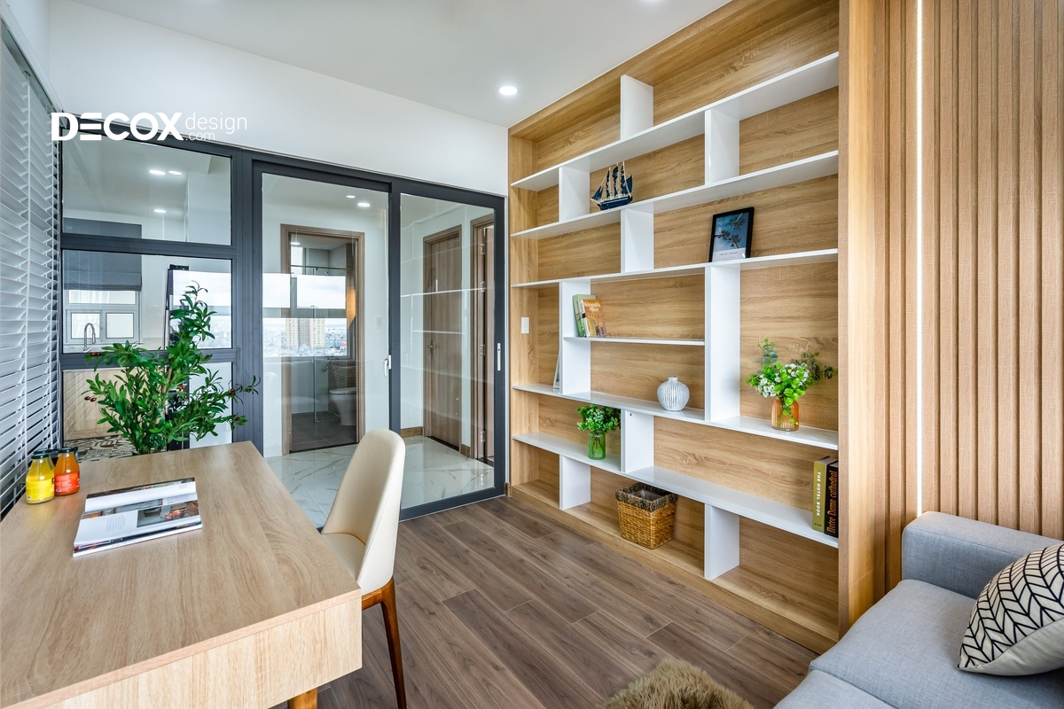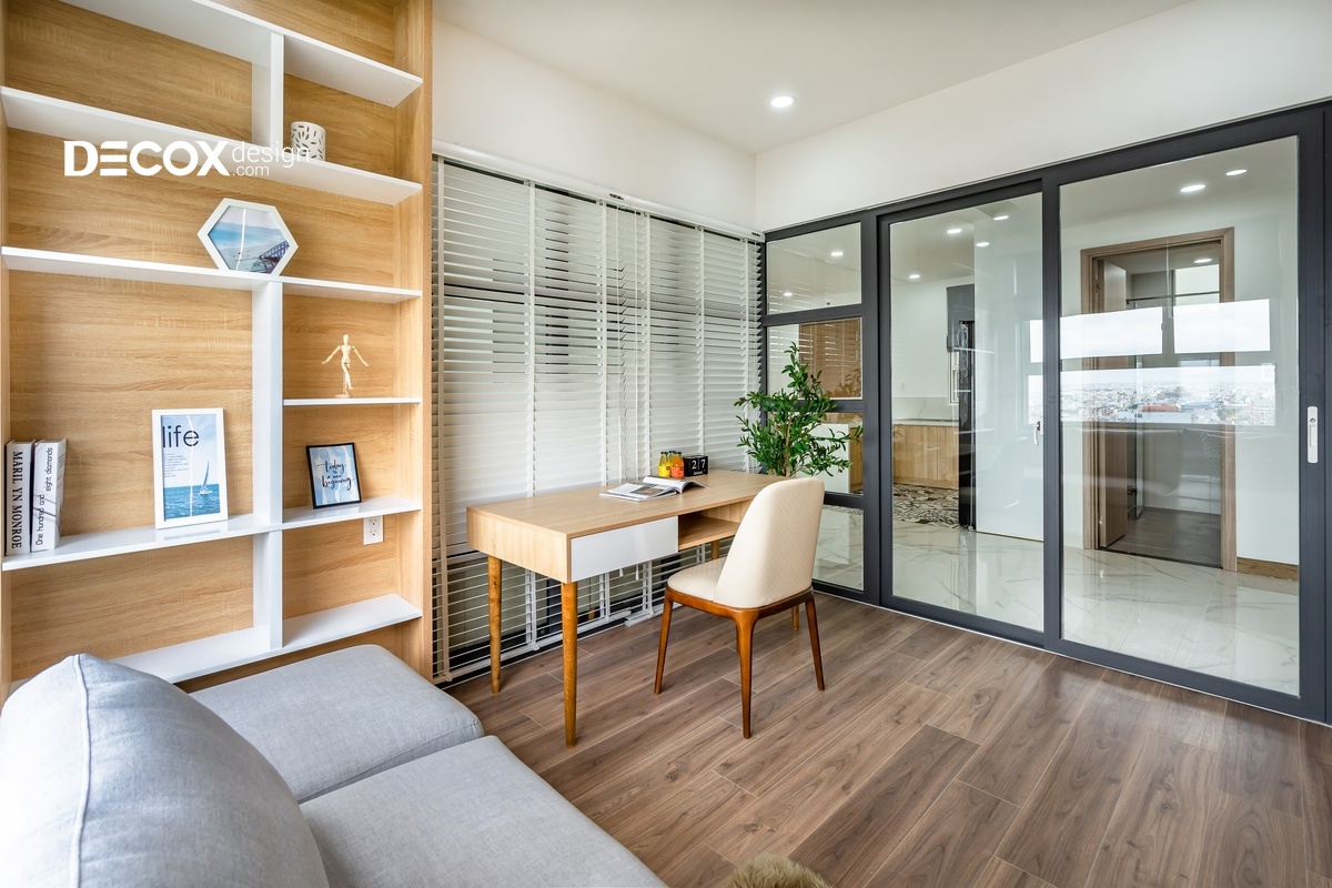 Không gian đắc giá nhất của căn hộ này là phòng làm việc với thi công nội thất bằng kính trong suốt , diện tích căn phòng thoáng mát. Nhiều kệ tủ chứa tài liệu và chiếc ghế sofa nằm sát cạnh cửa sổ, một tầm nhìn mới cho bạn giảm stress khi làm việc căng thẳng và cần sáng tạo thêm ý tưởng.