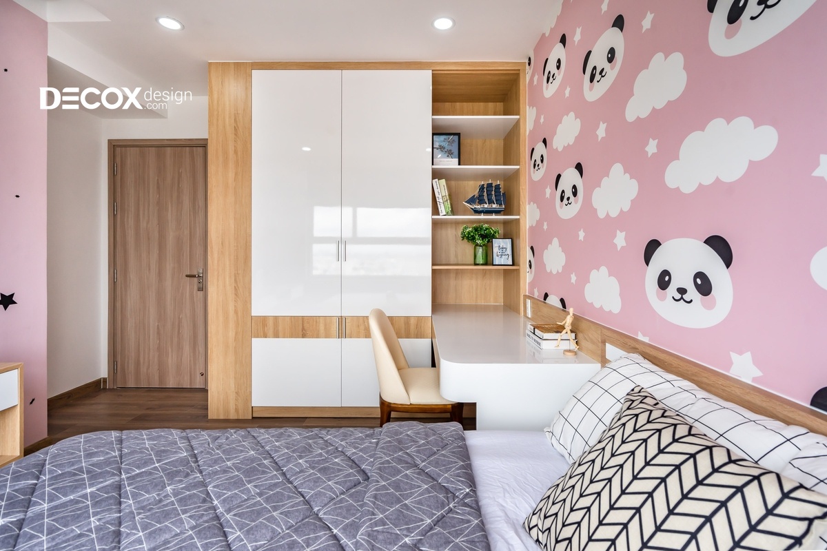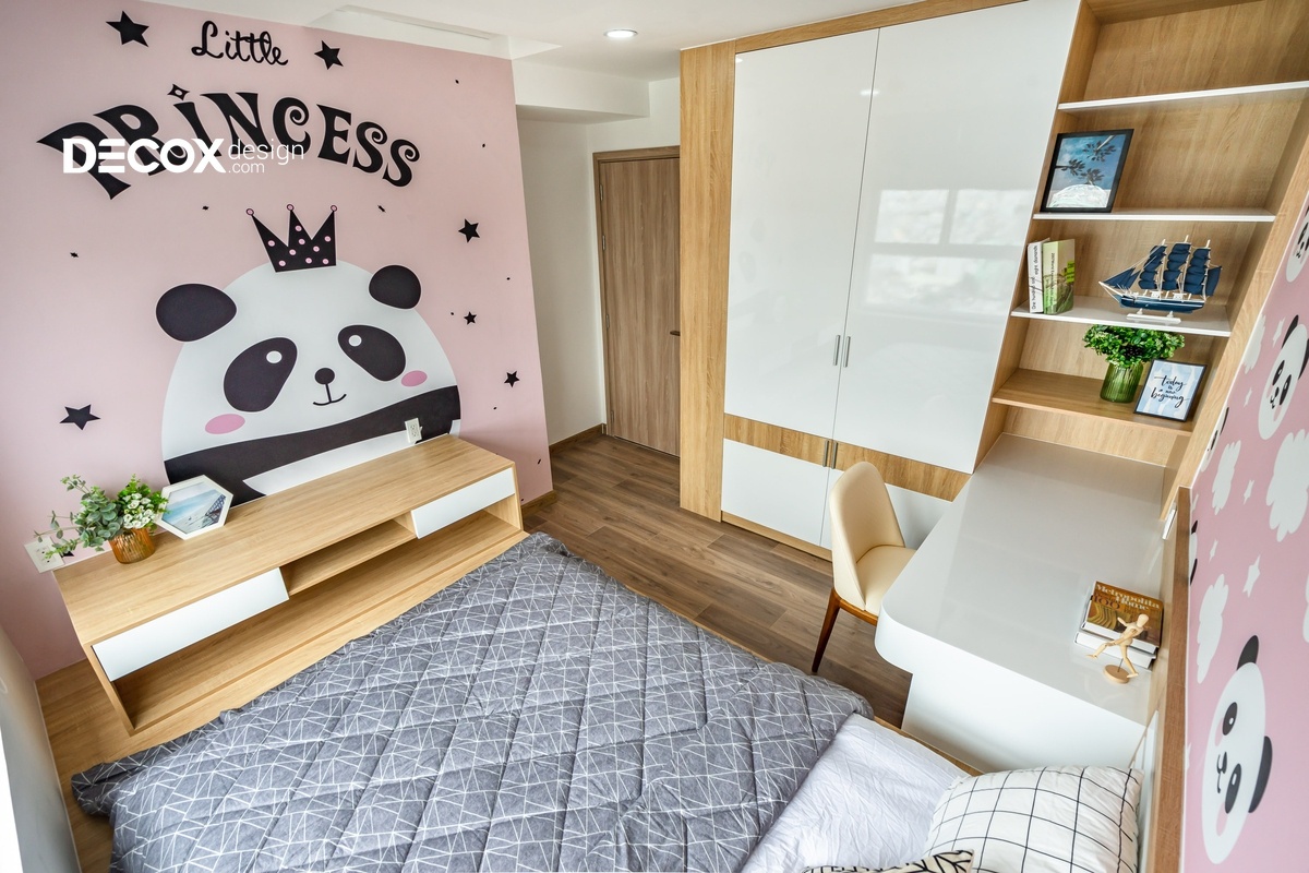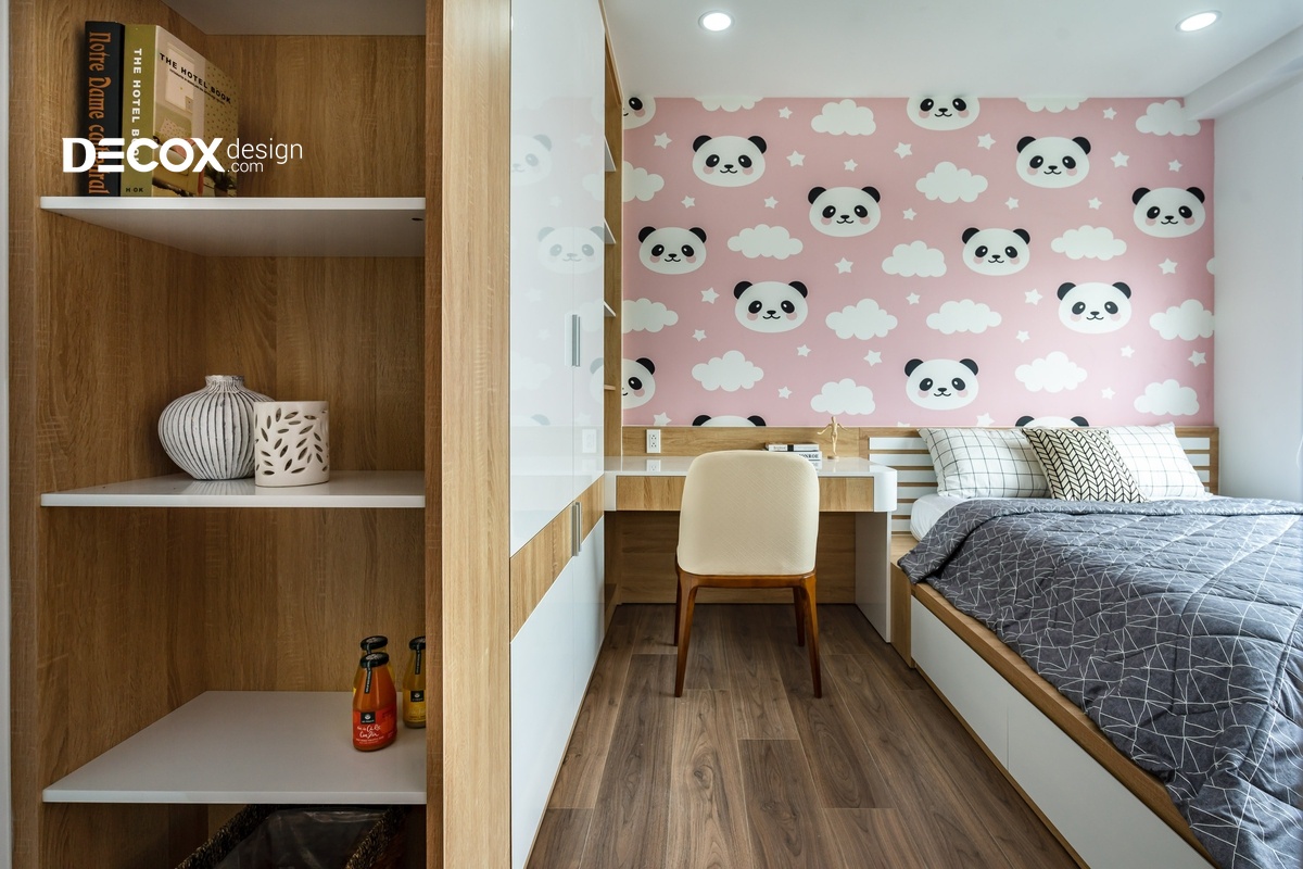 Giường phản nối liền với bàn học đồng bộ màu gỗ và trang trí bức tường bằng màu hồng xinh xắn đã làm căn phòng của bé thêm phần sinh động và sẽ yêu thích căn phòng của mình hơn.