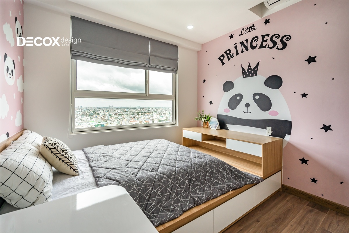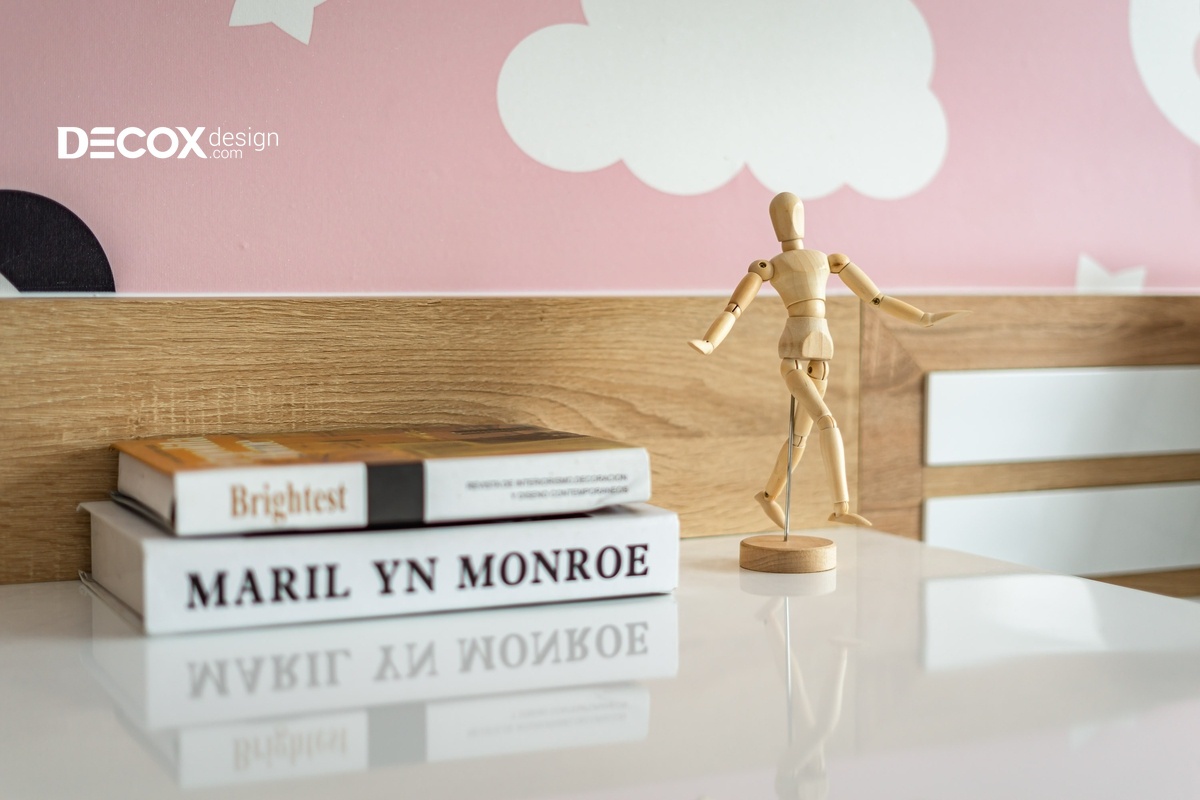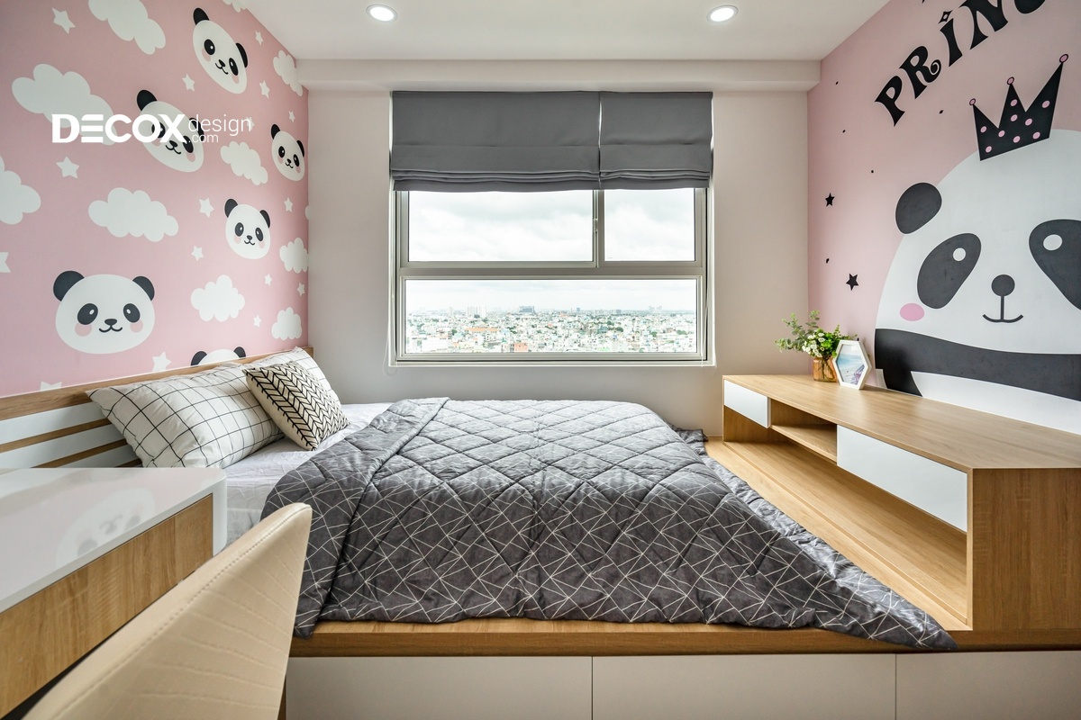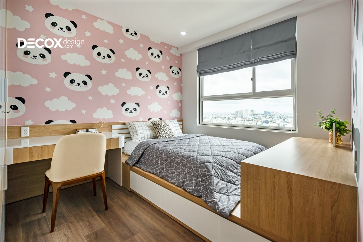 Giường phản nối liền với bàn học đồng bộ màu gỗ và trang trí bức tường bằng màu hồng xinh xắn đã làm căn phòng của bé thêm phần sinh động và sẽ yêu thích căn phòng của mình hơn.