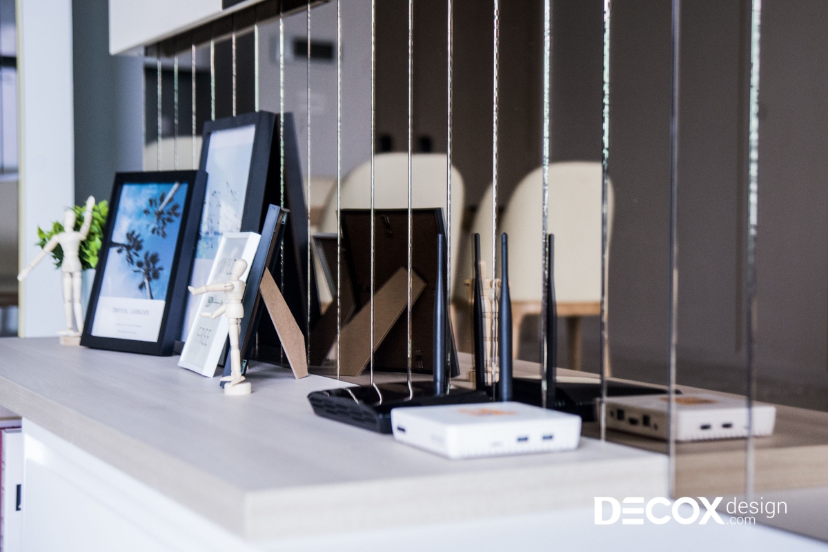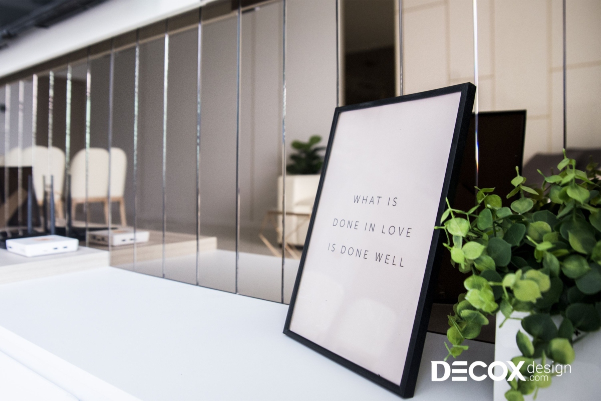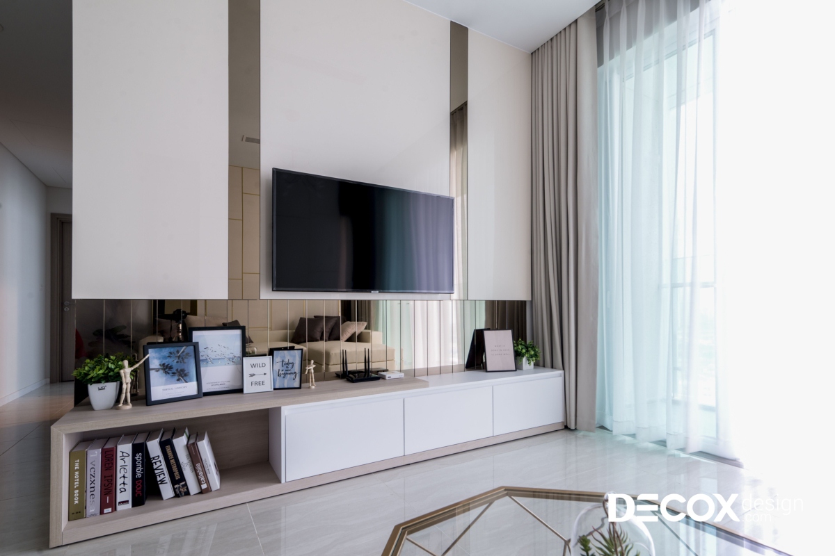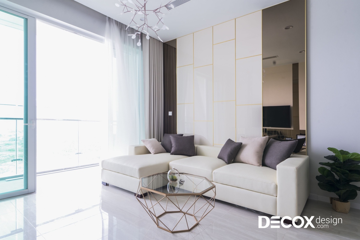Nắm bắt được các yêu cầu của gia chủ, Decox Design chọn phong cách hiện đại cho ngôi nhà. Màu sắc chủ đạo lựa chọn màu trắng, kết hợp cùng các vật liệu khác như gương, kính, gỗ để tạo điểm nhấn và mang lại chiều sâu cho không gian nội thất căn hộ.