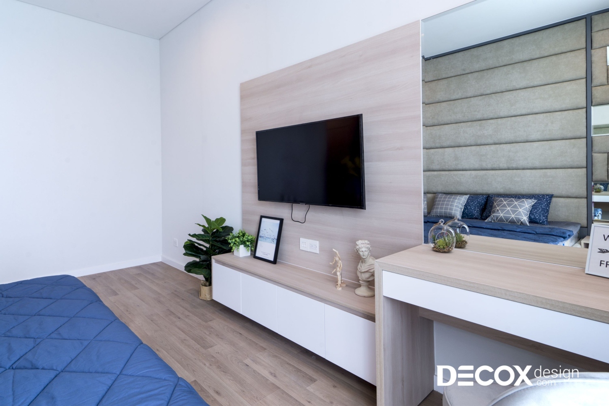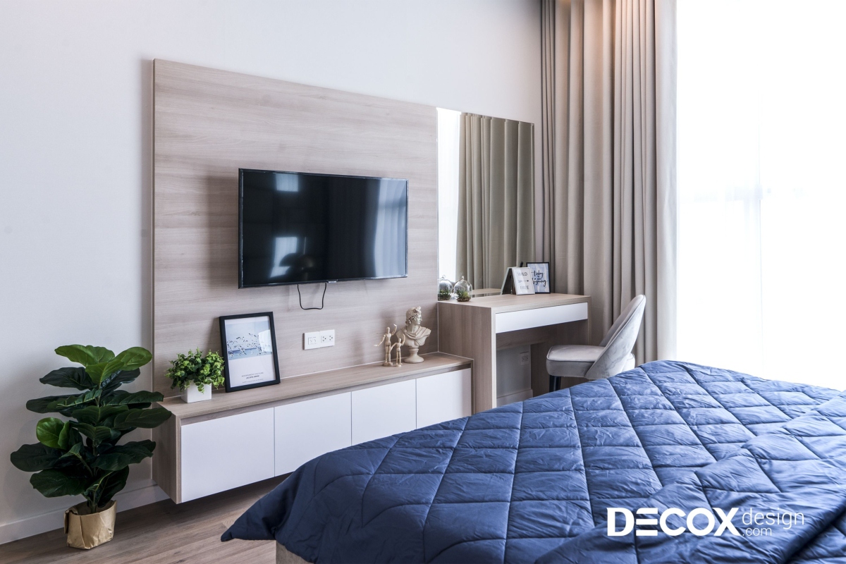 Phòng ngủ master rộng thoáng với cửa sổ lớn có thể đón nhiều ánh sáng vào phòng. Vách đầu giường là phần được thiết kế cầu kỳ, tỉ mỉ nhất. Toàn bộ phần vách được bọc nệm simili kết hợp với những ô gương nhỏ xen kẽ. Kiểu thiết kế này mang lại sự sang trọng cũng như tạo độ ấm cho căn phòng. Đối diện giường ngủ là kệ treo TV và bàn trang điểm được thiết kế liền mạch. Vật liệu sử dụng cho phần thi công nội thất này là gỗ công nghiệp phủ melamine vân gỗ sáng màu. Căn phòng sử dụng nhiều tông màu sáng đem lại nét trẻ trung và hiện đại.