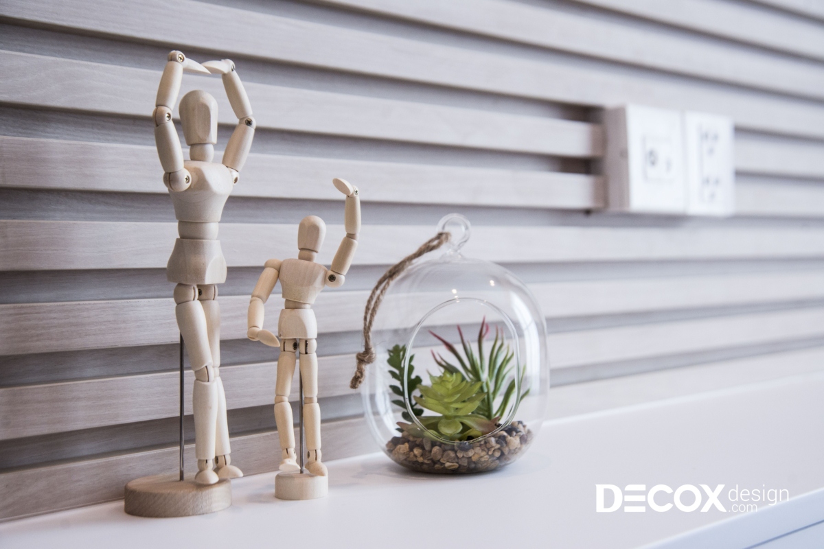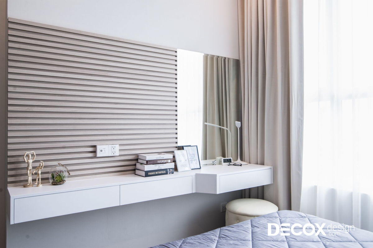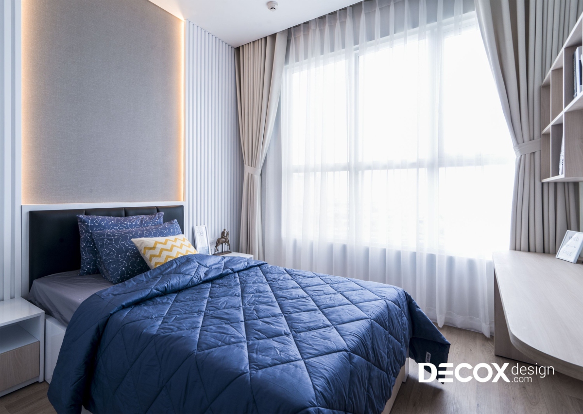 Phòng ngủ nhỏ được Decox Design thiết kế với gam màu trầm hơn nhưng không vì thế mà mất đi sự sang trọng và trẻ trung của tổng thể ngôi nhà. Vách tường phía sau giường ngủ được trang trí đơn giản với giấy dán tường in họa tiết lục giác trắng trang nhã. Đối lập với sự đơn giản của giấy dán tường là phần tường ốp lam gỗ đối diện giường ngủ. Giống như phòng master, bàn trang điểm và kệ treo được thiết kế liền mạch với nhau.