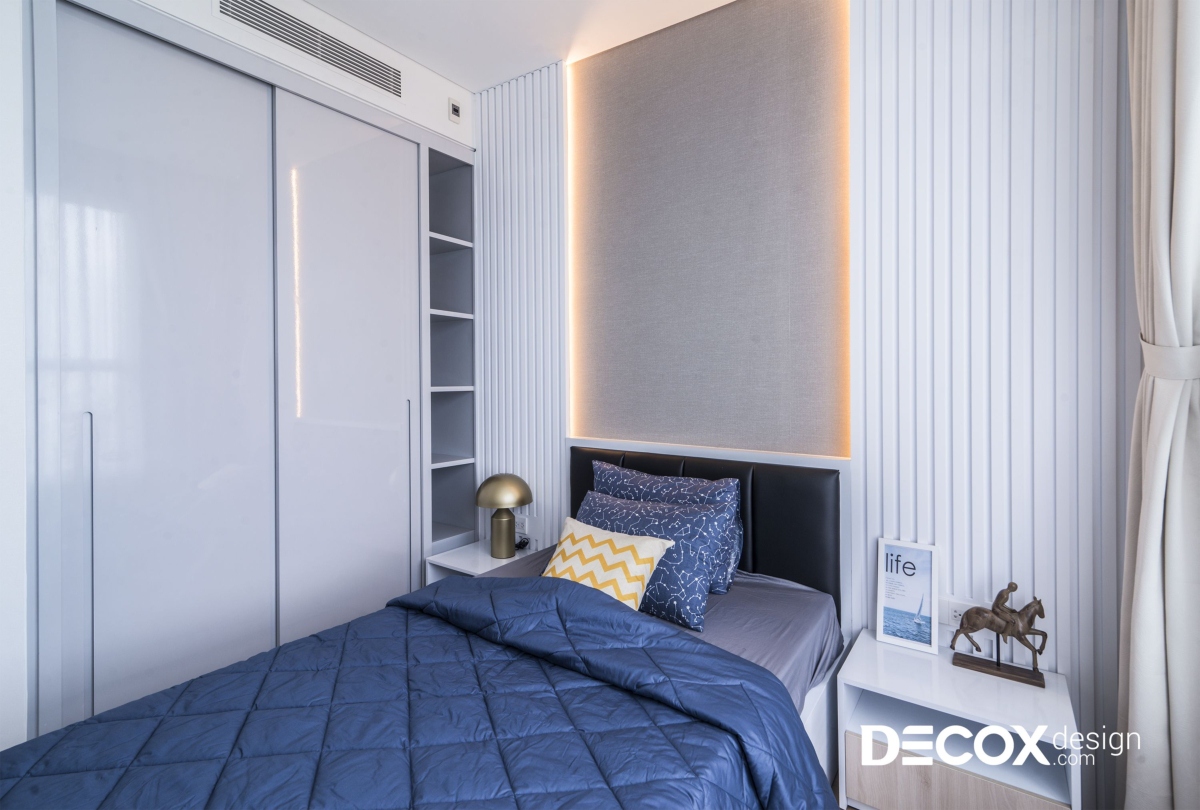 Phòng ngủ nhỏ nhất trong 3 phòng ngủ vẫn gây ấn tượng với kiểu thiết kế đẹp mắt. Phần đầu giường được làm bằng lam gỗ sơn trắng, kết hợp cùng ánh sáng vàng từ dàn đèn LED được bố trí khéo léo hai bên. Hiệu ứng ánh sáng nhẹ nhàng gây ấn tượng mạnh mẽ cho thị lực người nhìn. Phòng ngủ phụ này không có bàn trang điểm, thay vào đó là hệ bàn và kệ tủ. Hộc tủ chia nhiều ngân được dựng sát tường gọn gàng lại để được nhiều đồ.