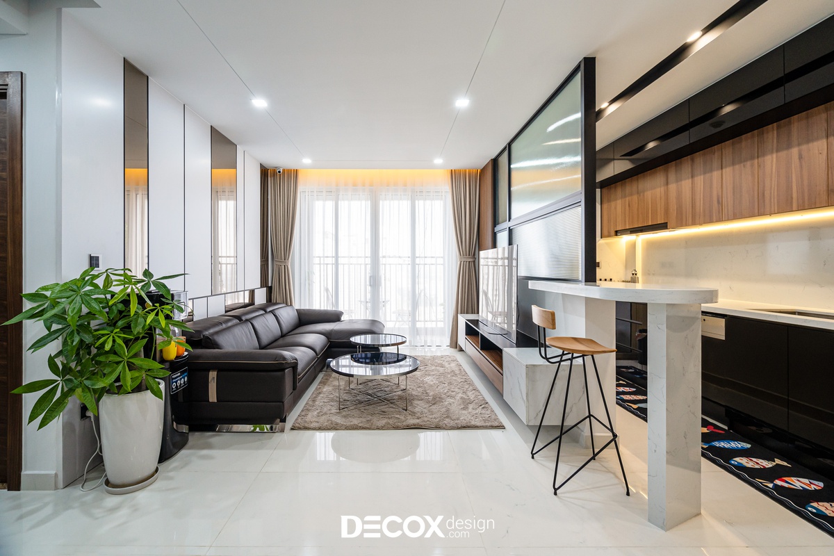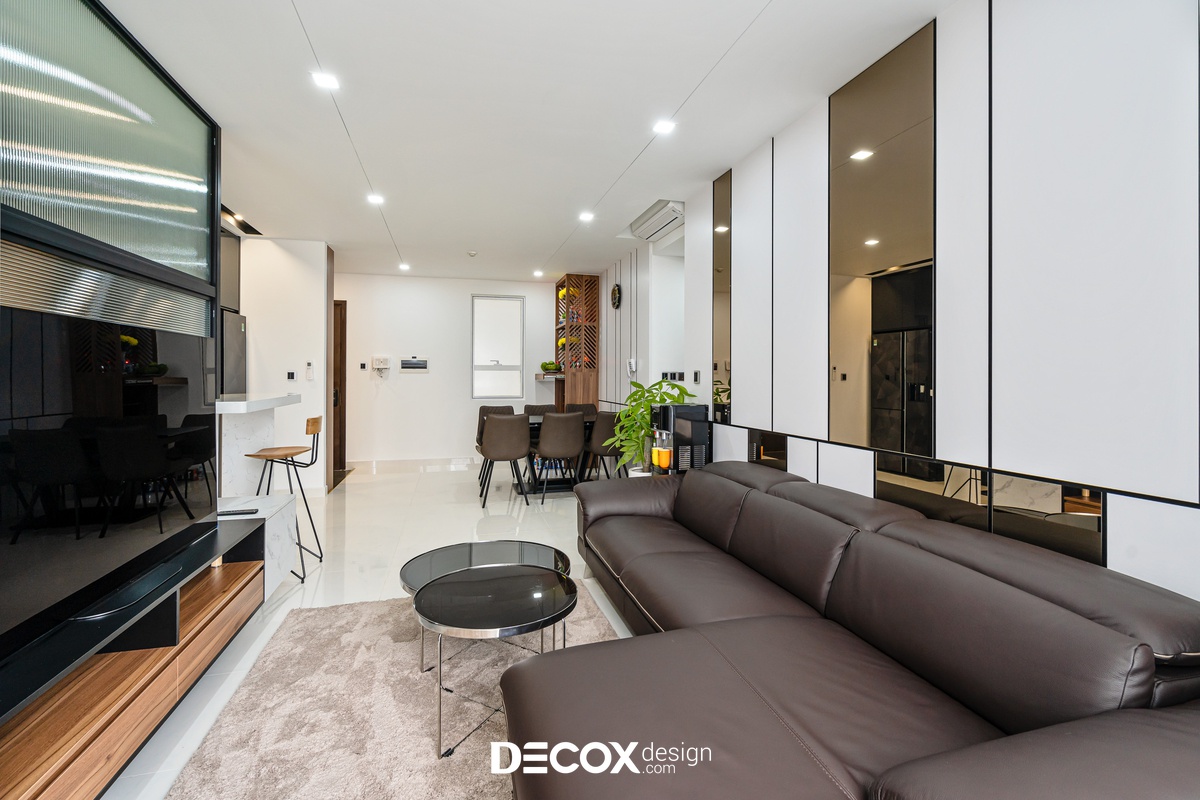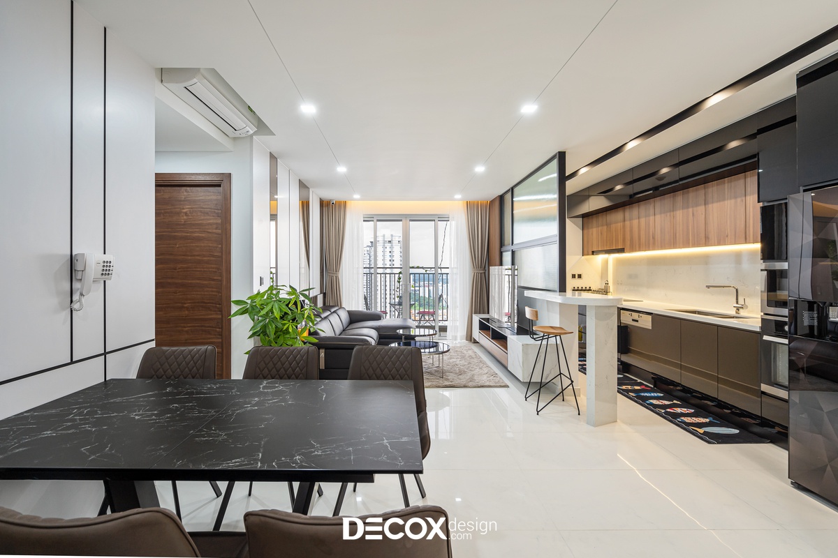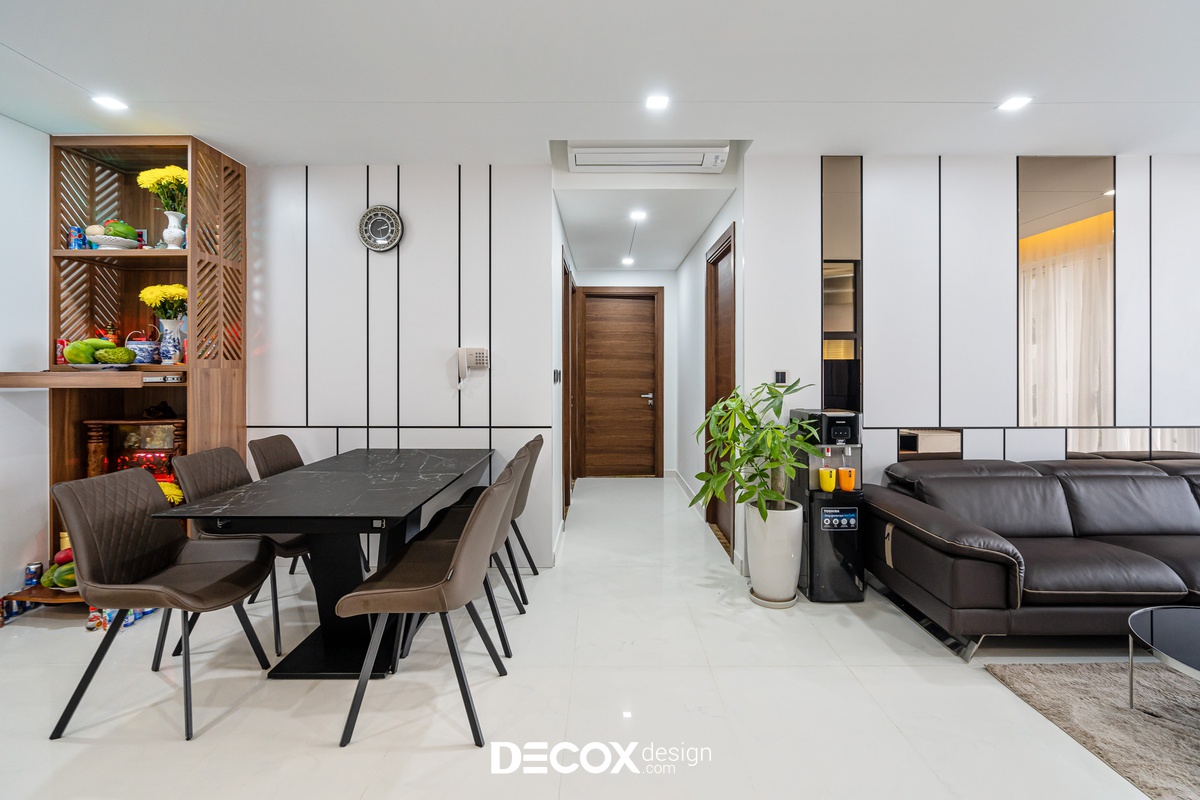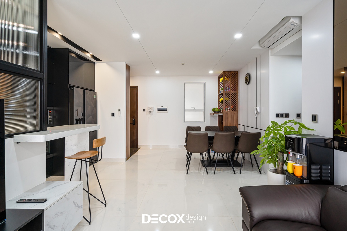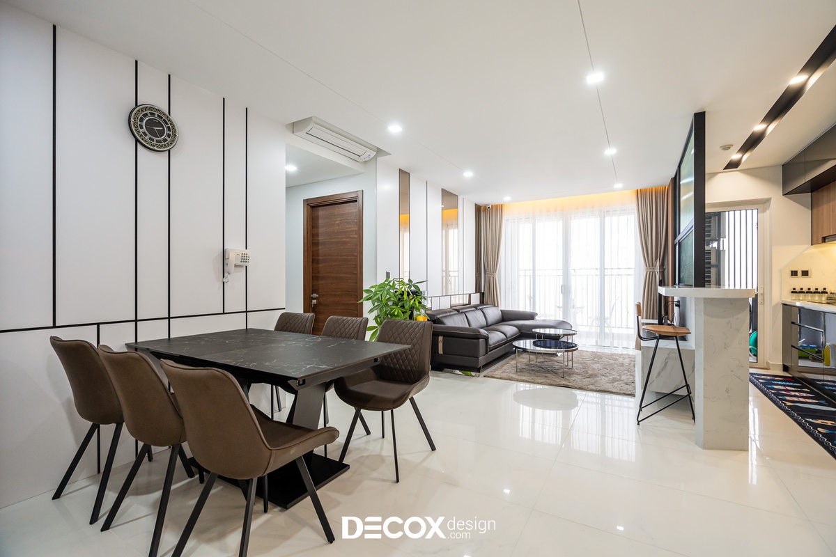 Sự sáng tạo tuyệt vời trong mẫu thiết kế nội thất chung cư Sunrise Cityview theo phong cách hiện đại đã được ứng dụng trên thực tế. Lấy ý tưởng từ gam trắng chủ đạo giúp những chi tiết nội thất trong nhà từ bộ sofa da mượt mà, bộ bàn ăn mặt đá đen, các cánh cửa gỗ tự nhiên đều trở thành điểm nhấn nổi bật. Bên cạnh đó, các KTS của Decox Design còn vận dụng sắc trắng này làm nền khiến cho căn nhà tự mình phô bày được từng đường nét tinh tế và sang trọng, bắt lấy ánh nhìn của người khác trong từng chi tiết dù là nhỏ nhất.