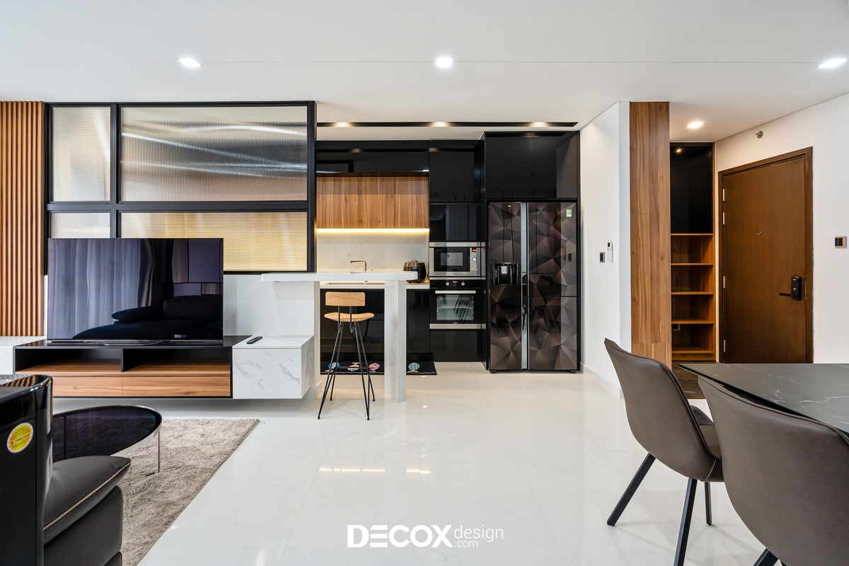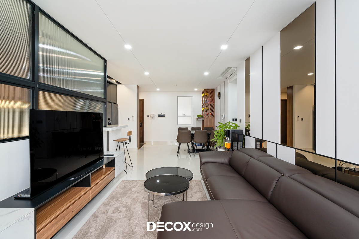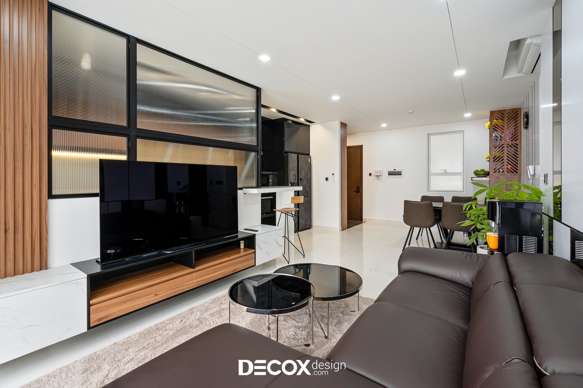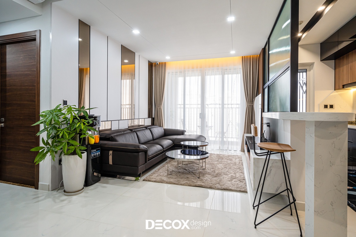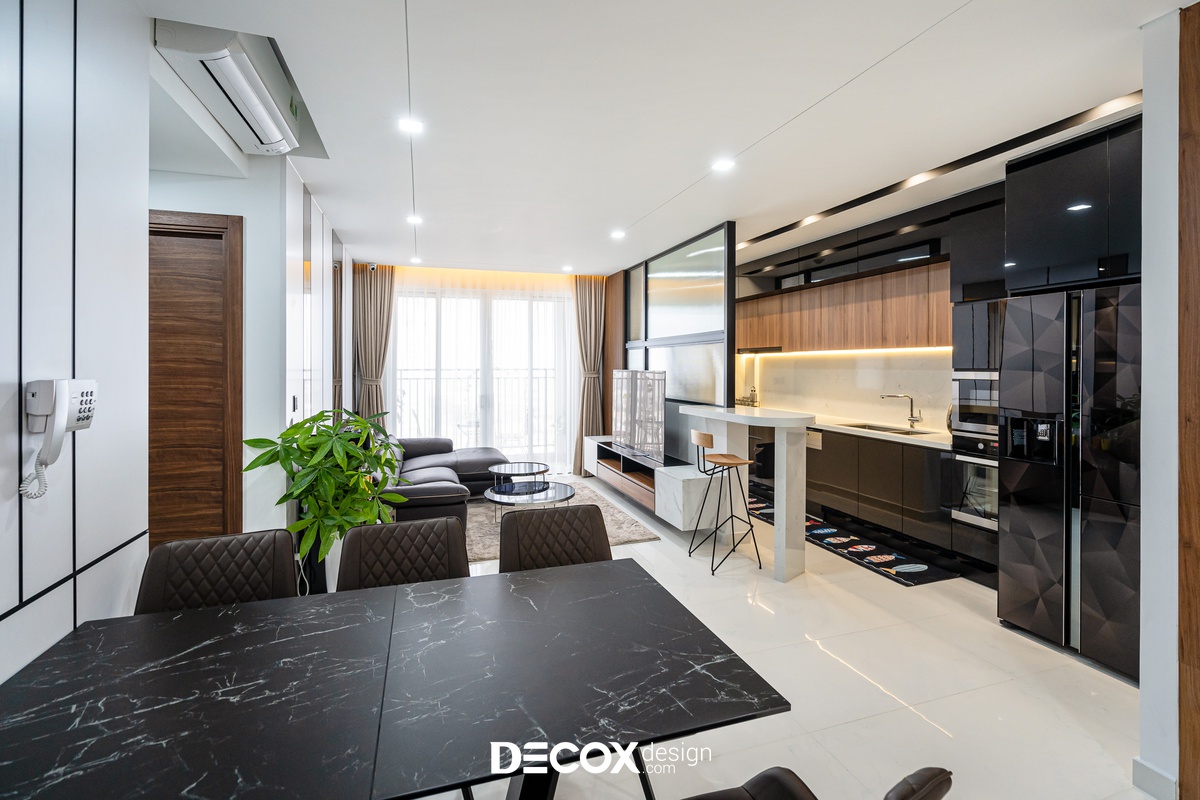 Sự sáng tạo tuyệt vời trong mẫu thiết kế nội thất chung cư Sunrise Cityview theo phong cách hiện đại đã được ứng dụng trên thực tế. Lấy ý tưởng từ gam trắng chủ đạo giúp những chi tiết nội thất trong nhà từ bộ sofa da mượt mà, bộ bàn ăn mặt đá đen, các cánh cửa gỗ tự nhiên đều trở thành điểm nhấn nổi bật. Bên cạnh đó, các KTS của Decox Design còn vận dụng sắc trắng này làm nền khiến cho căn nhà tự mình phô bày được từng đường nét tinh tế và sang trọng, bắt lấy ánh nhìn của người khác trong từng chi tiết dù là nhỏ nhất.