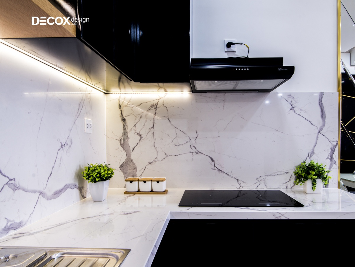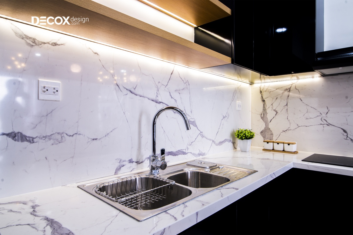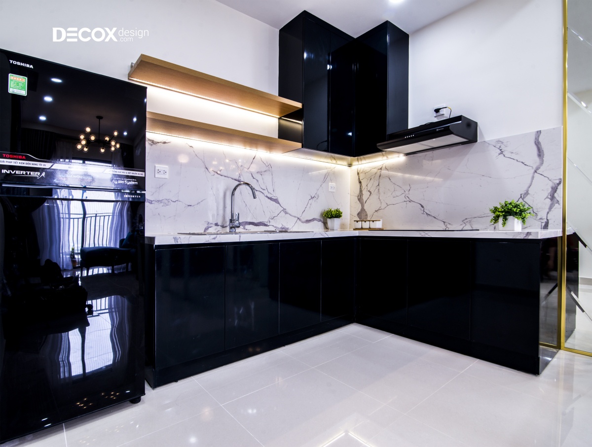Để tiết kiệm diện tích, chủ nhà lựa chọn kiểu bếp chữ L. Với kiểu bố trí bếp này, diện tích sử dụng được tối ưu hóa, không bỏ sót một ngóc ngách nào và đảm bảo tiện nghi và thoải mái khi sử dụng nhà bếp cho người sinh sống trong nhà. Chất liệu lựa chọn để ốp mặt bàn bếp và tường bếp là đá marble tự nhiên. Ưu điểm của loại đá này sử dụng cho nhà bếp là khả năng chống thấm cao và có vân đá độc đáo. Phần kệ lưu trữ thay vì sử dụng hệ tủ đụng trần như nhiều mẫu thiết kế khác, chủ nhà chỉ sử dụng 2 đợt kệ song song bằng gỗ lắp trên trên tường. Khi sử dụng kiểu kệ này, không gian được giải phóng khá nhiều, nhiều ánh sáng hơn và cũng dễ dàng vệ sinh, lau dọn.