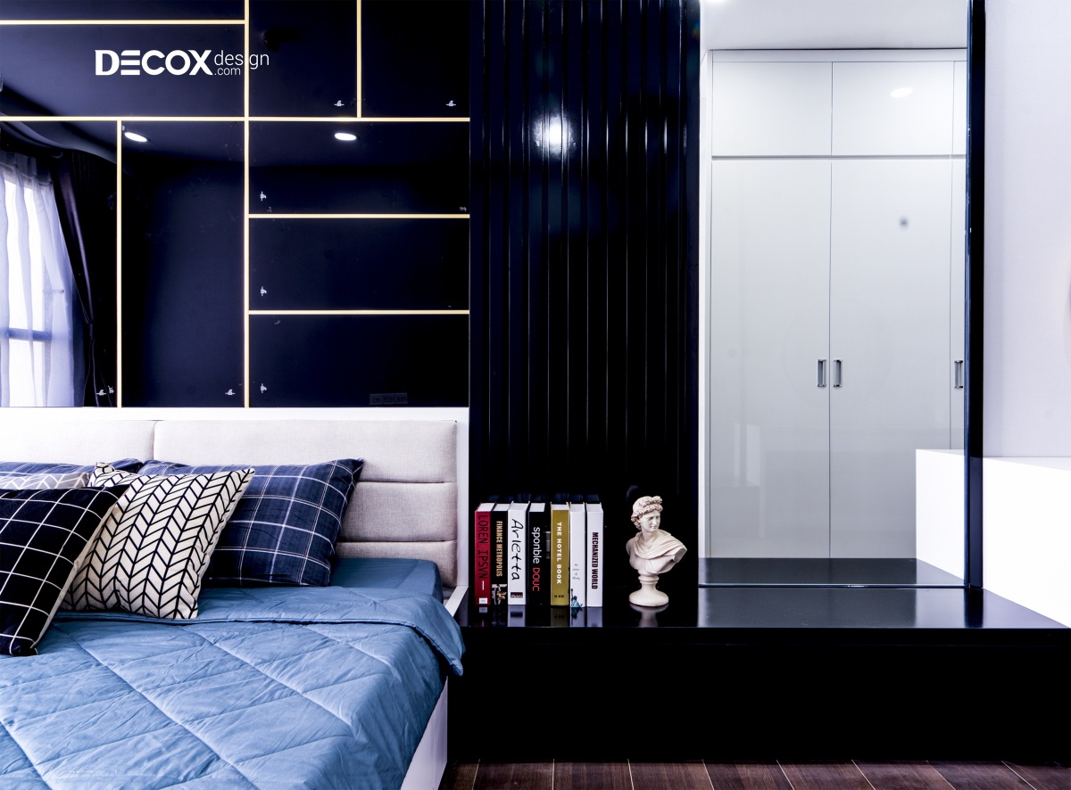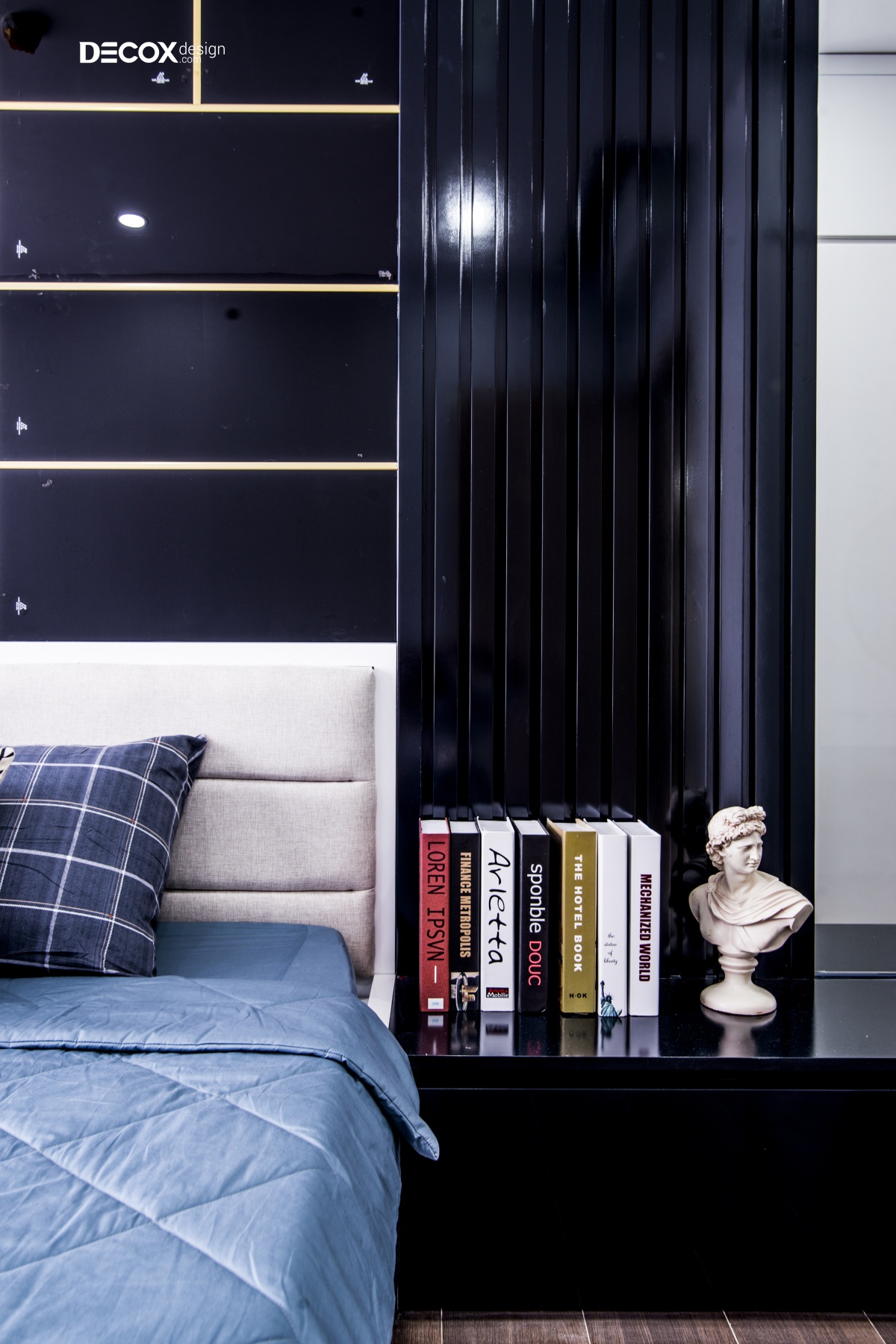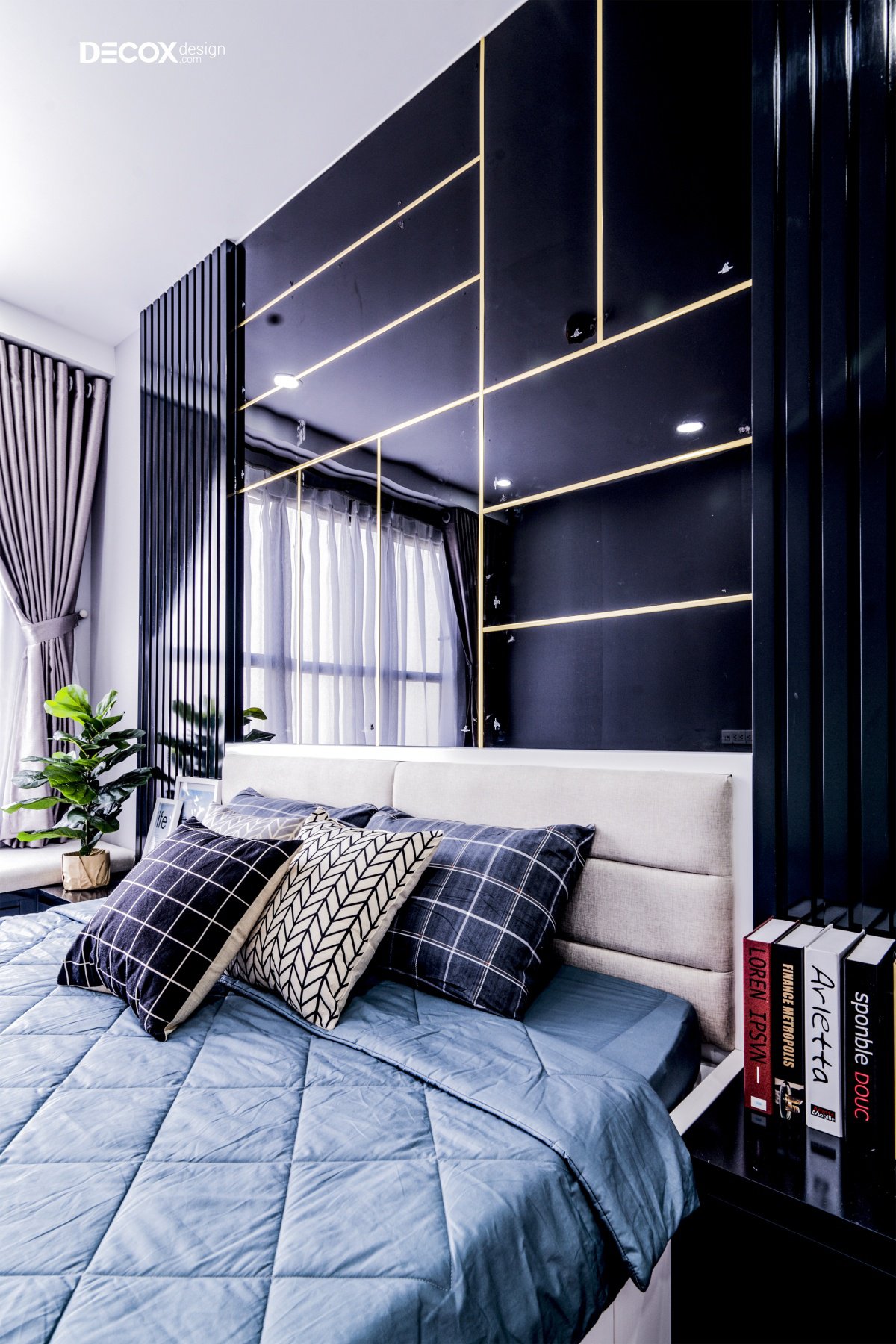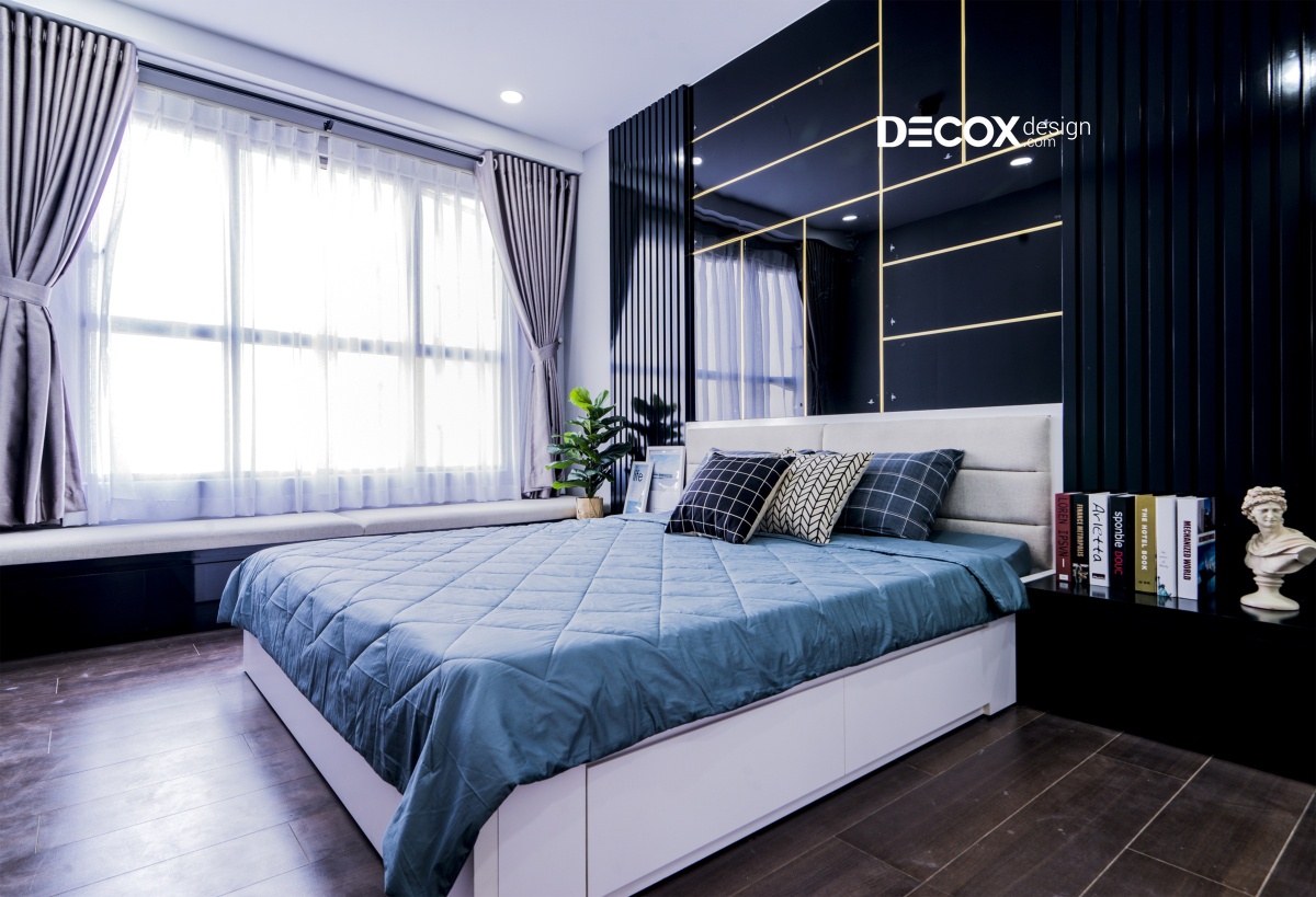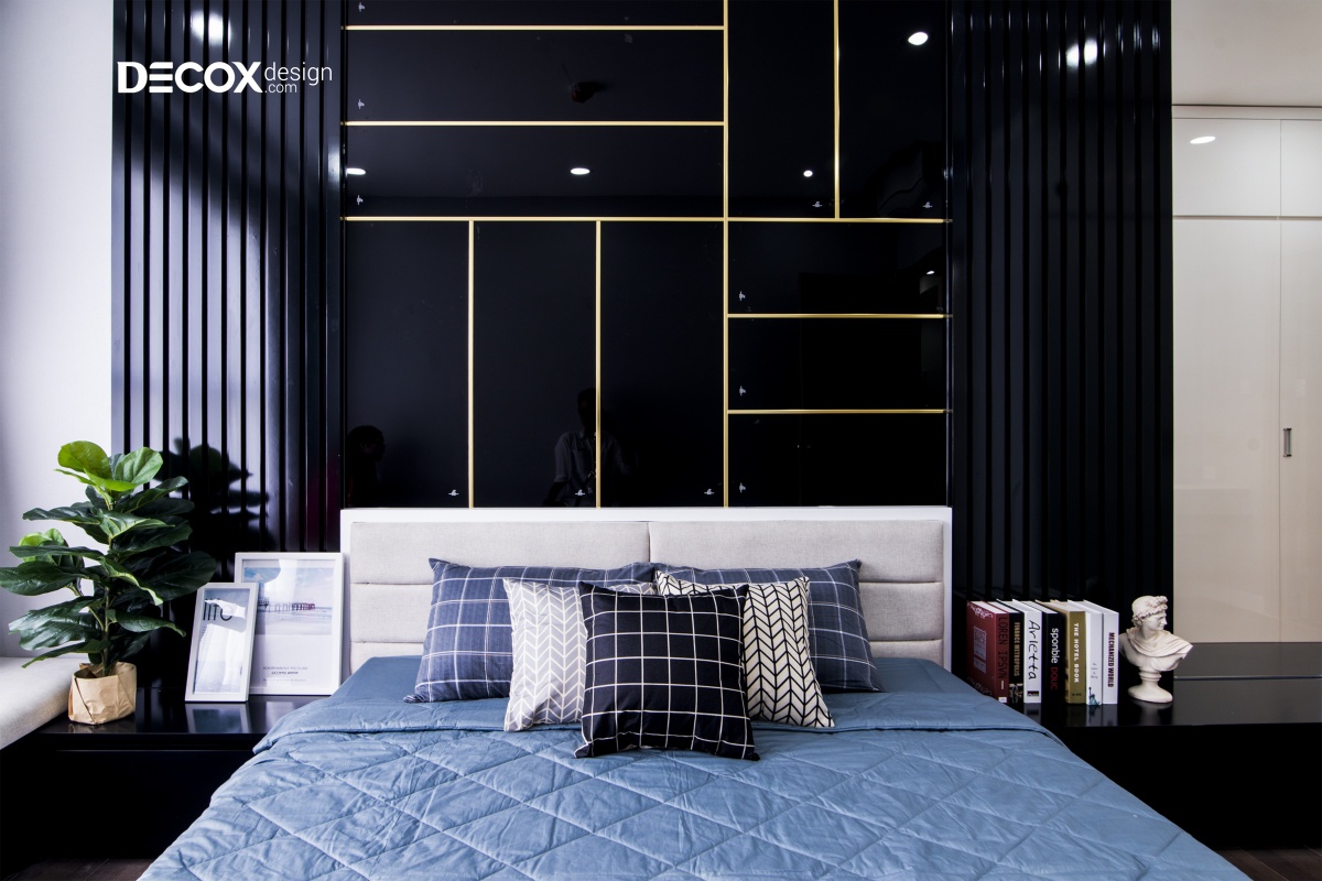Phòng ngủ master là sự kết hợp hài hoài giữa các màu sắc trung tính như đen – xám – trắng và vách ốp gỗ cộng với chỉ tường kim loại trang trí. Phần vách đầu giường là phép cộng giữa vật liệu gỗ công nghiệp được sơn đen và kính cường lực ốp tường màu đen, xen kẽ để tạo điểm nhấn cho mảng tường lớn chính là nẹp chỉ kim loại màu vàng. Với thiết kế này phòng ngủ vừa sang trọng nhờ chất liệu kính sáng bóng nhưng vẫn ấm áp nhờ chất liệu gỗ được ốp lên tường.