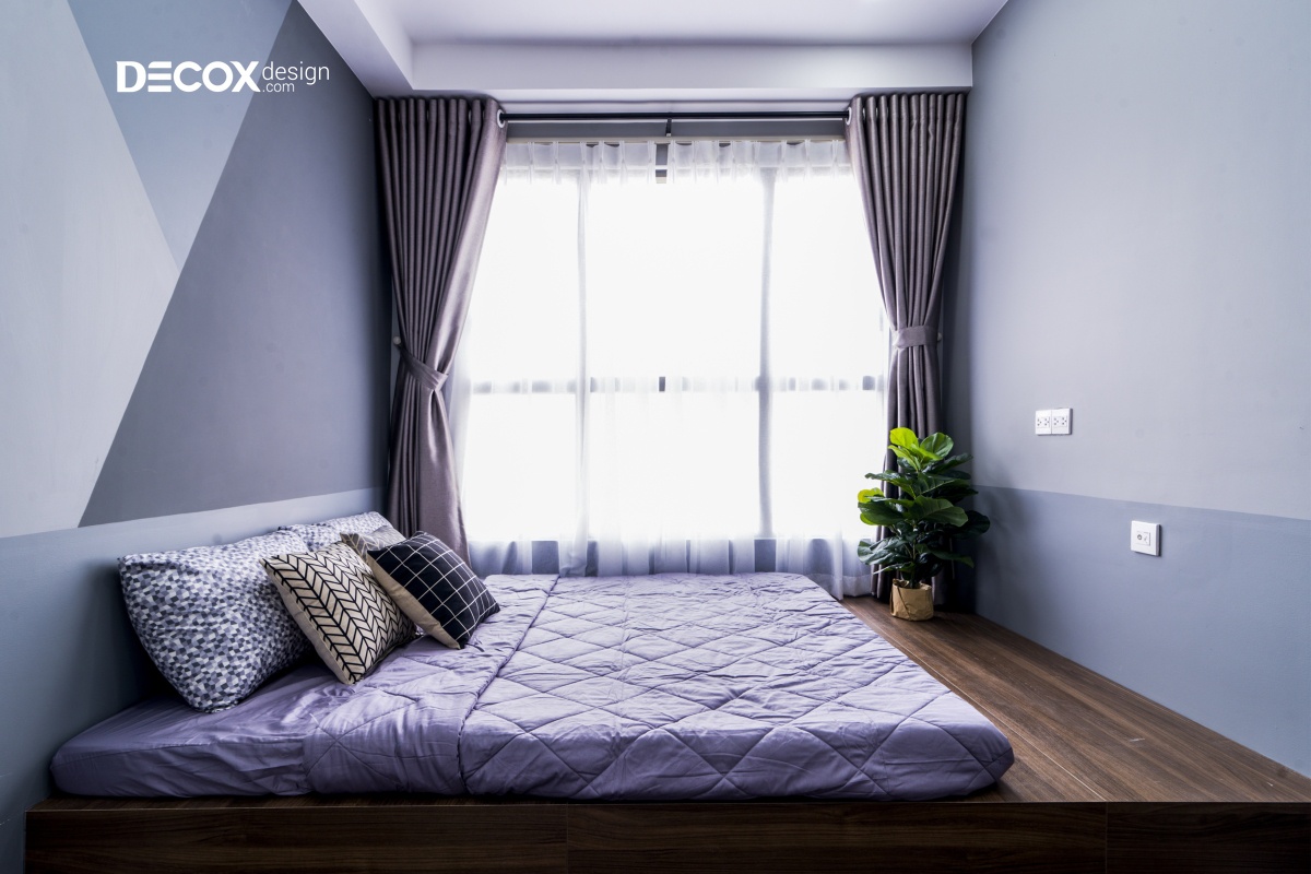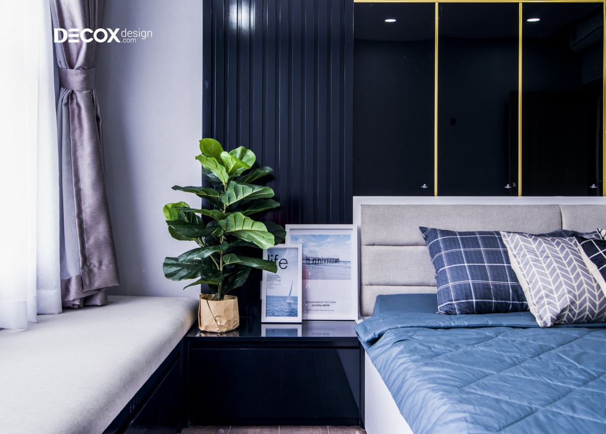 Phần giường ngủ được bọc nệm ở phần tựa đầu giường mang lại thẩm mỹ hơn cho tổng thể căn phòng và đảm bảo sự nghỉ ngơi thơi mái hơn cho chủ nhân căn phòng. Phòng có cửa sổ lớn đón được nhiều ánh nắng tự nhiên. Bệ cửa sổ cũng được bọc vải để tận dụng làm nơi nghỉ ngơi, ngồi đọc sách hay ngắm cảnh bên ngoài.