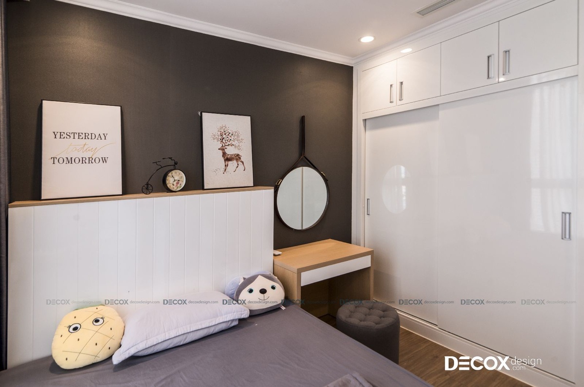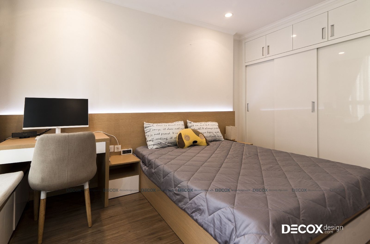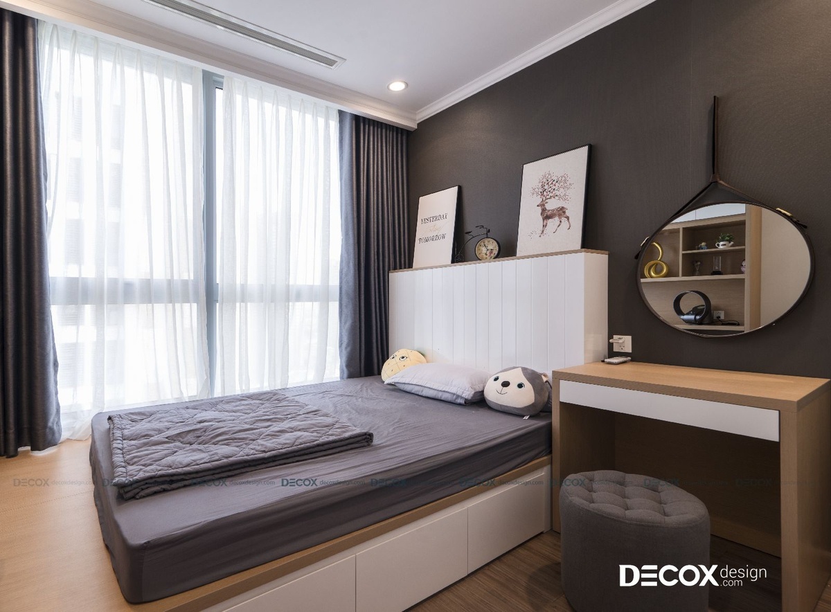 Phòng của con gái lớn với bức tường sơn màu xám đậm, nhờ đó làm nổi bận phần nội thất sáng màu bên trong phòng. Con gái lớn của chủ nhà với tính cách sôi nổi, năng động, căn phòng được thiết kế theo ý thích của bé với kiểu giường phản hiện đại. Nhờ cách thiết kế này giúp tối ưu được công năng sử dụng khi giường ngủ và bàn học có thể tích hợp chung với nhau. Tab đầu giường được thiết kế cao và dày để tạo thành một đợt kệ, tiện cho bé để đồ vật trang trí yêu thích của mình. Phía chân giường là tủ đứng lớn chia nhiều hàng kệ, hộc tủ để lưu trữ sách báo và đồ đạc.