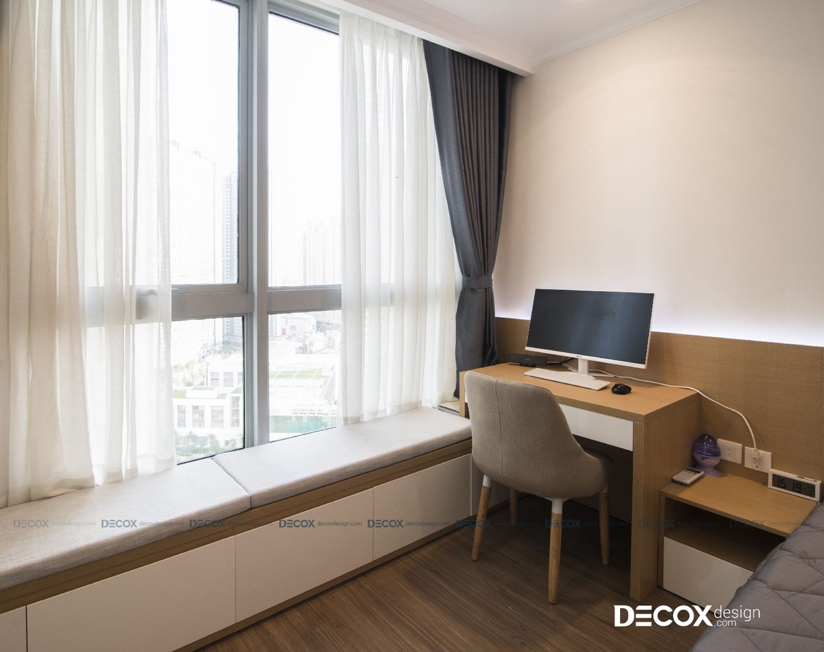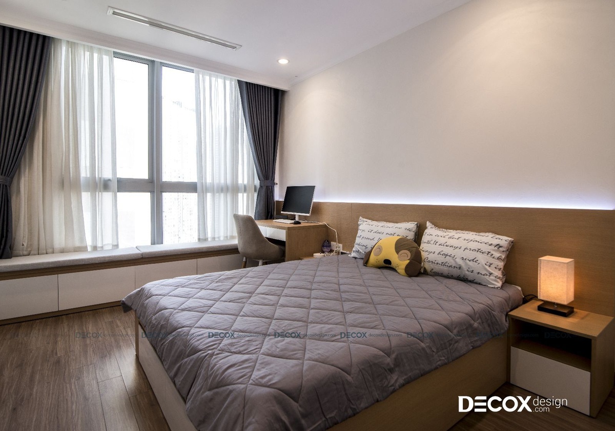 Đây là phòng ngủ của bố mẹ với thiết kế nhẹ nhàng cùng tông màu trắng, nâu gỗ tự nhiên. Thay vì không chọn phòng master, anh chị gia chủ thích căn phòng này do có khung của sổ lớn, đón nhiều ánh sáng tạo nhiều cảm hứng sống hơn. Phần bệ cửa sổ được bố trí bay window có lót đệm ngồi để chủ nhân căn phòng có thể ngồi đây thư giãn. Ánh sáng trong phòng được bố trí không cầu kì, chỉ gồm đèn downlight ở góc phòng và gắn thêm đèn led hắt ở phía sau tab đầu giường tạo thêm sự sang trọng, tinh tế cho không gian.