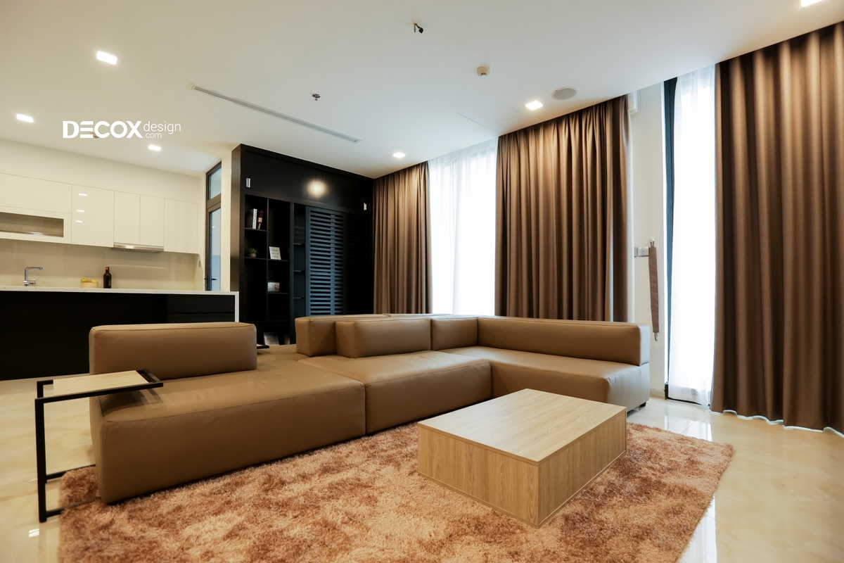 Về phòng khách Decox Design lựa chọn một bộ sofa cực lớn bằng chất liệu da và được làm tỉ mỉ với từng đường nét tỉ mỉ, chau chuốt từng đường kim mũi chỉ.