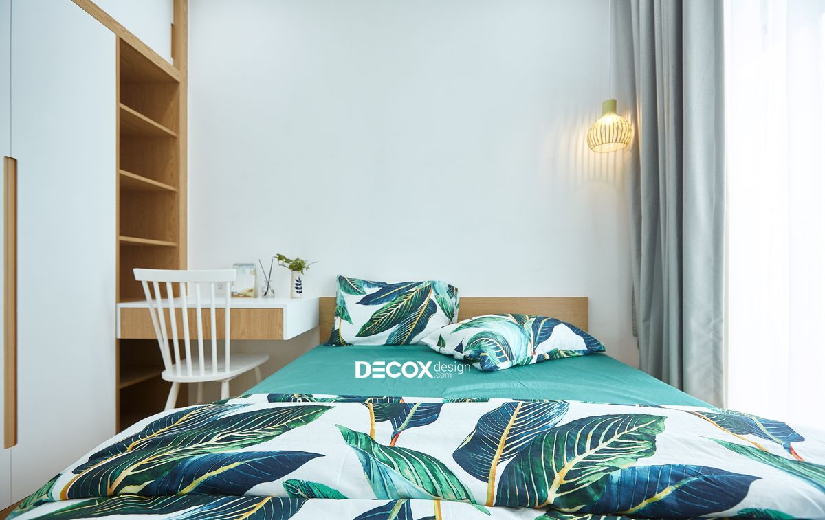 Màu xanh tươi mát của rừng cây sẽ làm bạn thêm dễ chìm sâu trong giấc ngủ vì chất liệu của chăn drap, vì không gian không bị ngột ngạt, vì sự gọn gàng của việc sắp xếp nội thất.