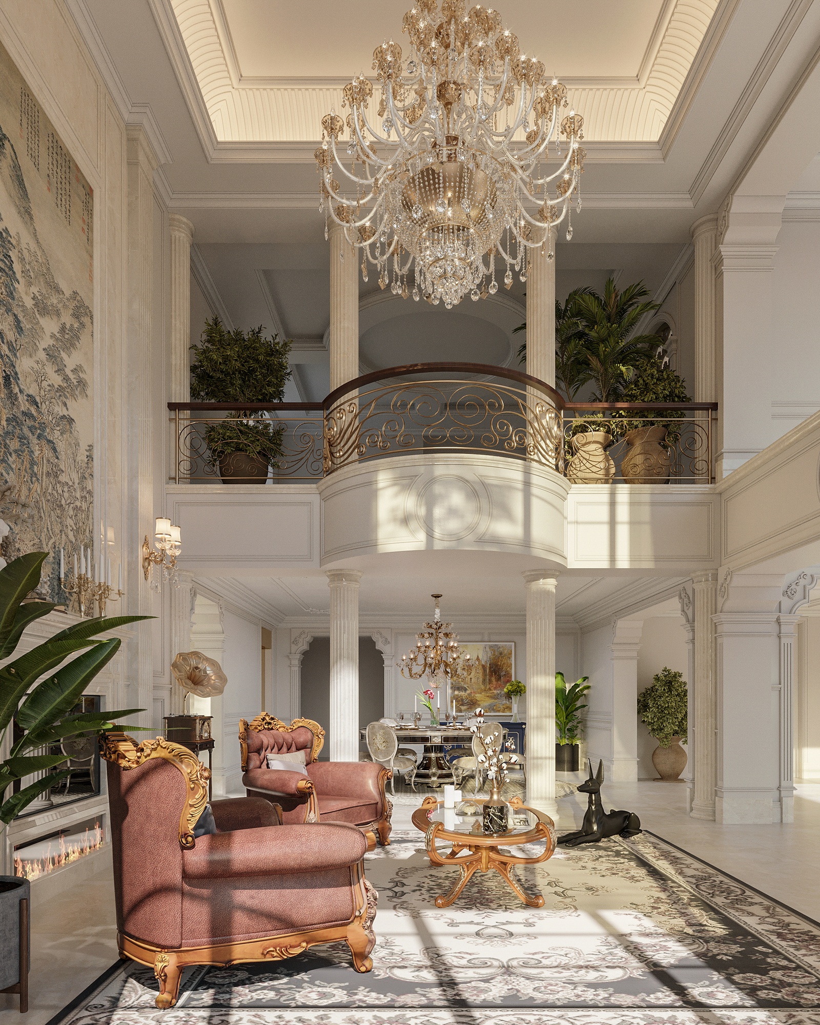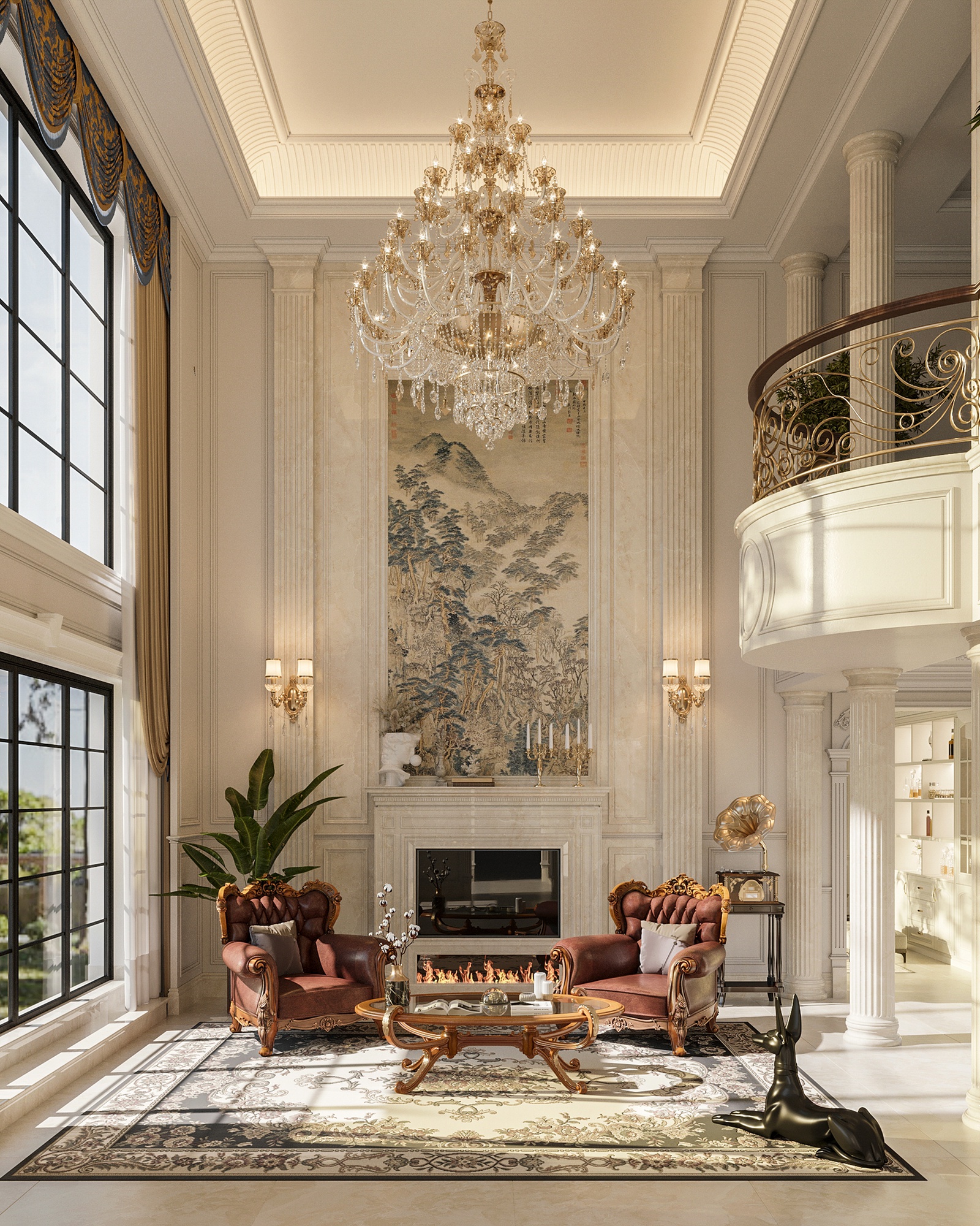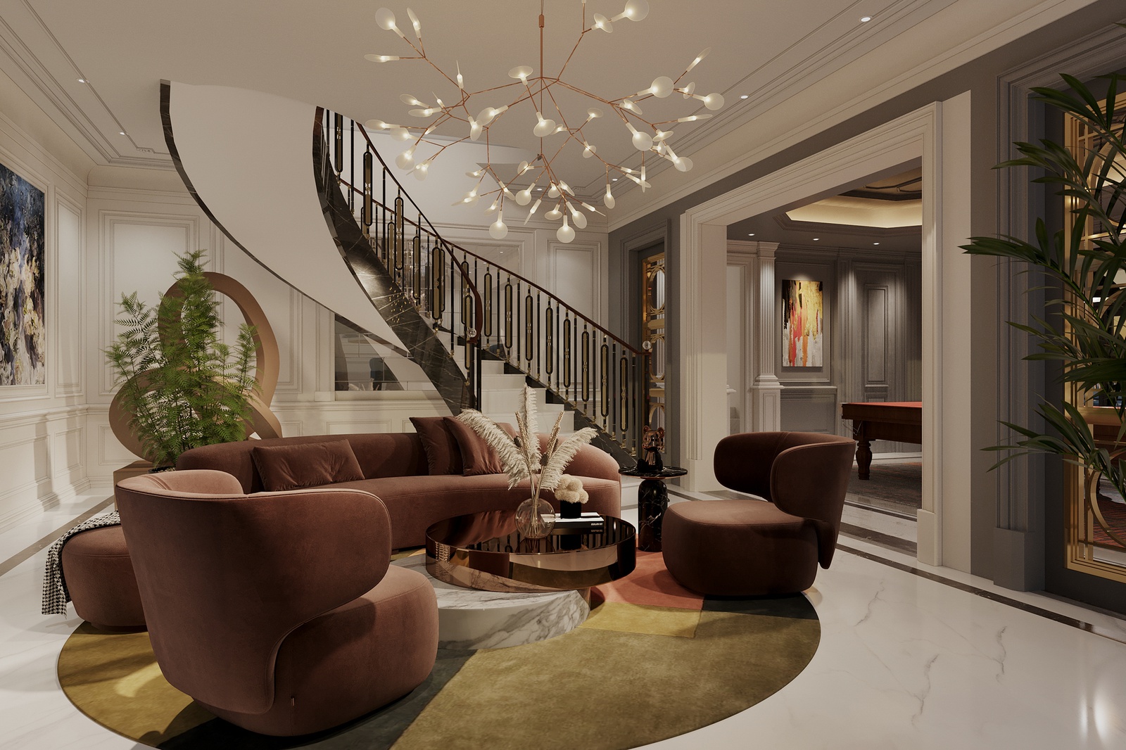 Nếu kiến trúc biệt thự mang đến một cảm nhận về một tổ ấm đậm chất Tây phương thì không gian nội thất sẽ đưa bạn lạc vào bản giao hưởng hòa quyện giữa nền văn hóa phương Đông và phương Tây. Dự án mang màu sắc nhẹ nhàng, ấm cúng nhưng vẫn phô diễn đầy đủ nét đẹp hoa lệ, đắt đỏ của một không gian sống đẳng cấp. Điều này được thể hiện rõ nét thông qua sự chuẩn chỉ, đầu tư trong từng chi tiết từ tính đối xứng - cân bằng, nội thất sang trọng, đèn chùm hoa lệ cho đến những dấu ấn từ đường nẹp, phào chỉ, hoa văn tinh tế và cả những đường cong mềm mại, uyển chuyển, chạm trổ công phu trên các món đồ nội thất.