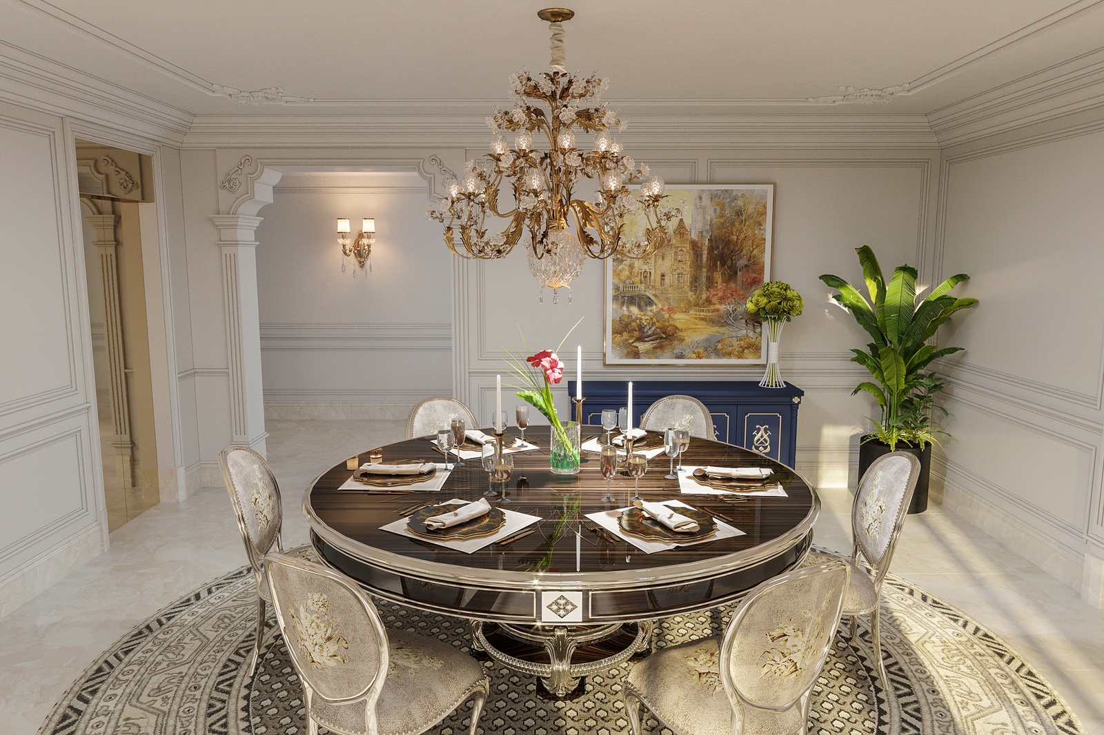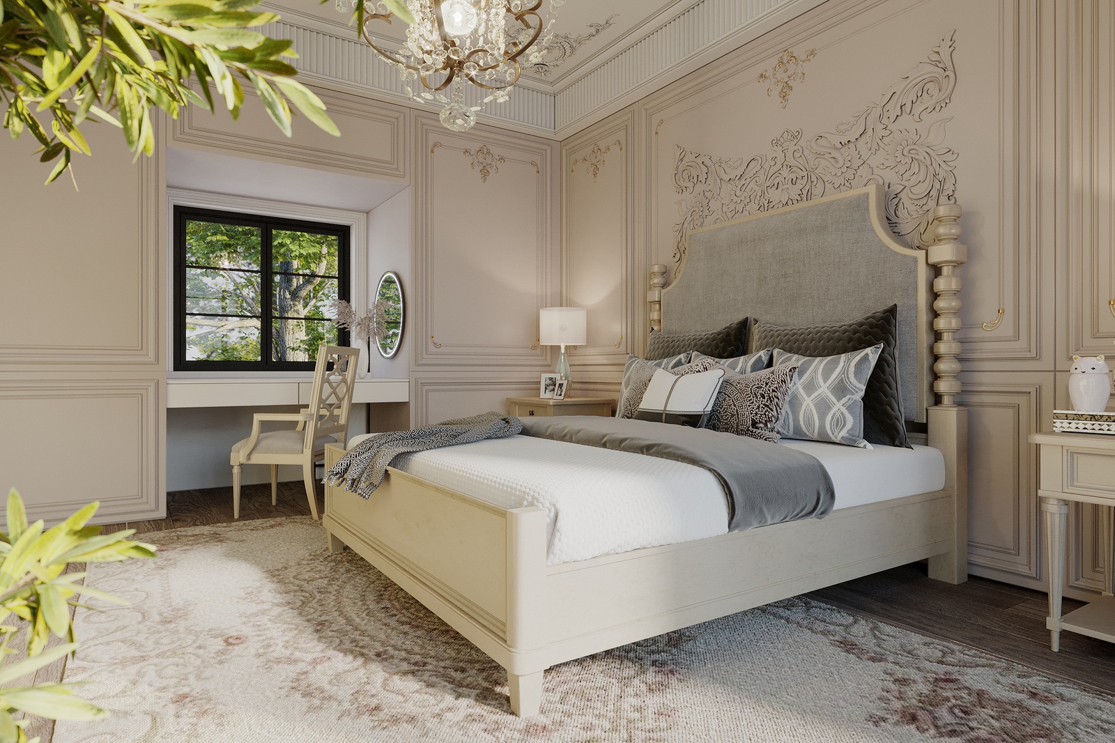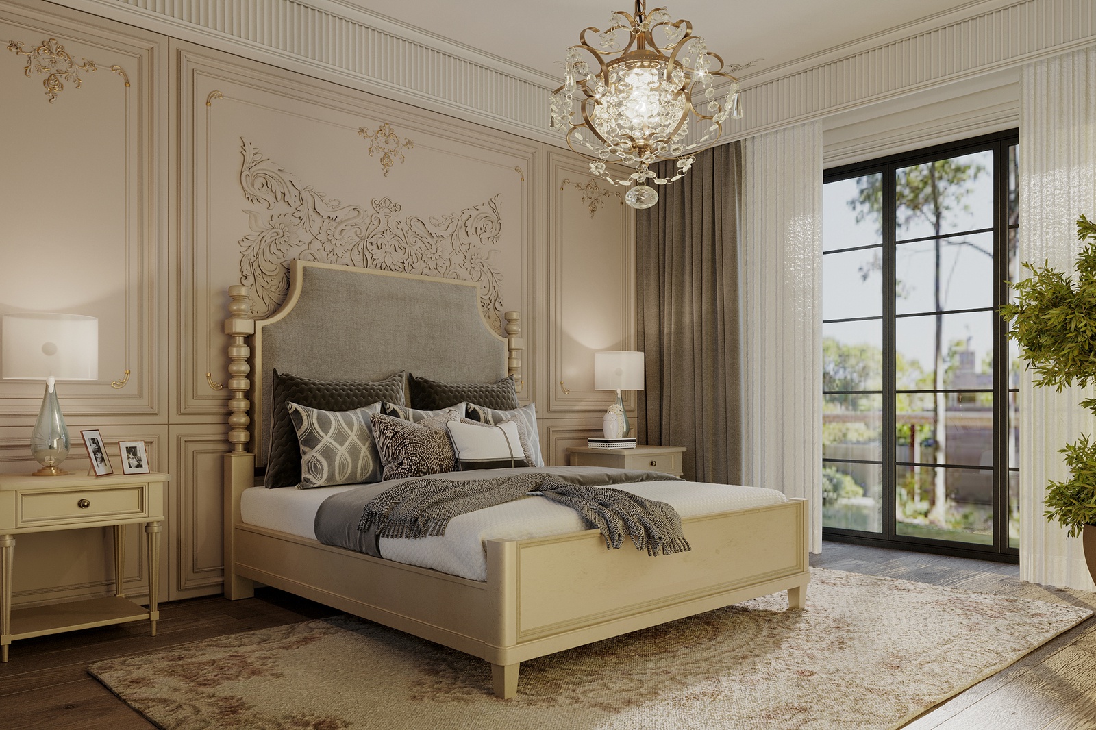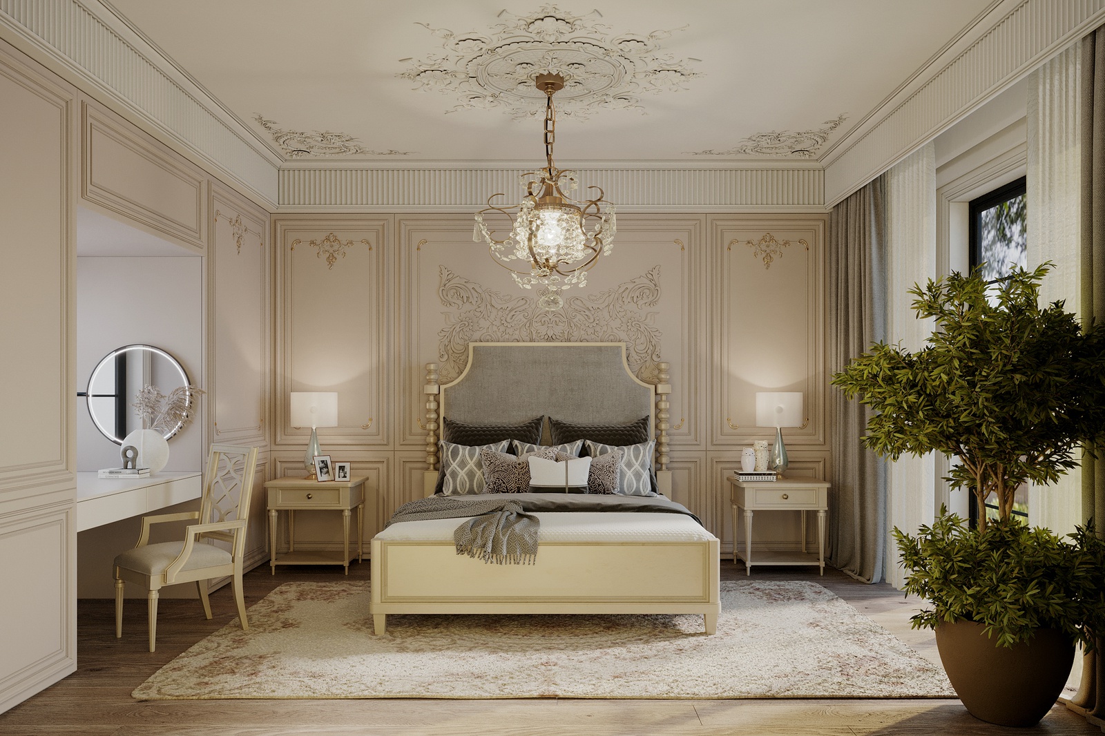 Nếu kiến trúc biệt thự mang đến một cảm nhận về một tổ ấm đậm chất Tây phương thì không gian nội thất sẽ đưa bạn lạc vào bản giao hưởng hòa quyện giữa nền văn hóa phương Đông và phương Tây. Dự án mang màu sắc nhẹ nhàng, ấm cúng nhưng vẫn phô diễn đầy đủ nét đẹp hoa lệ, đắt đỏ của một không gian sống đẳng cấp. Điều này được thể hiện rõ nét thông qua sự chuẩn chỉ, đầu tư trong từng chi tiết từ tính đối xứng - cân bằng, nội thất sang trọng, đèn chùm hoa lệ cho đến những dấu ấn từ đường nẹp, phào chỉ, hoa văn tinh tế và cả những đường cong mềm mại, uyển chuyển, chạm trổ công phu trên các món đồ nội thất.