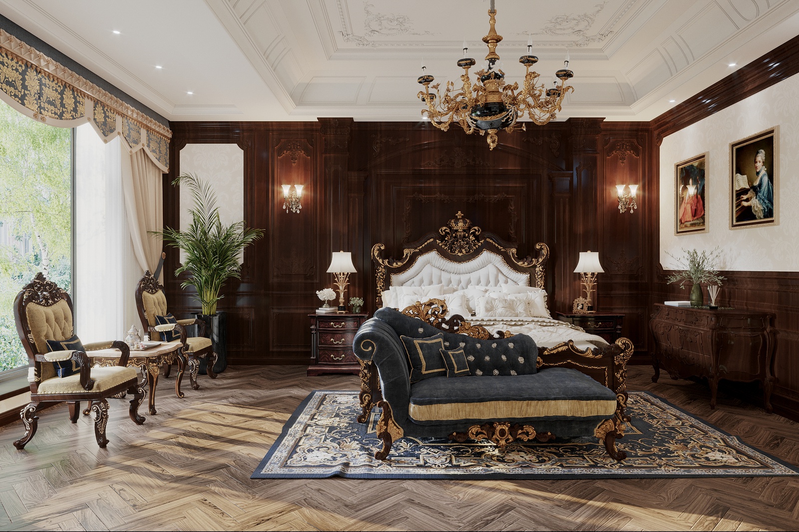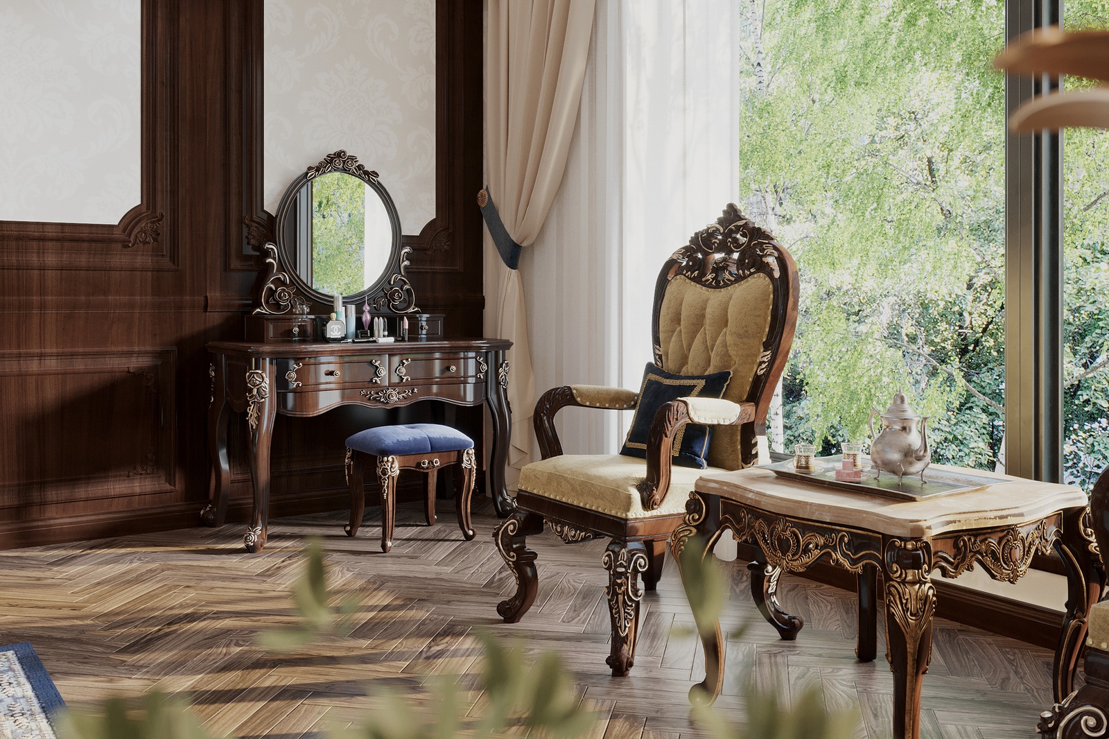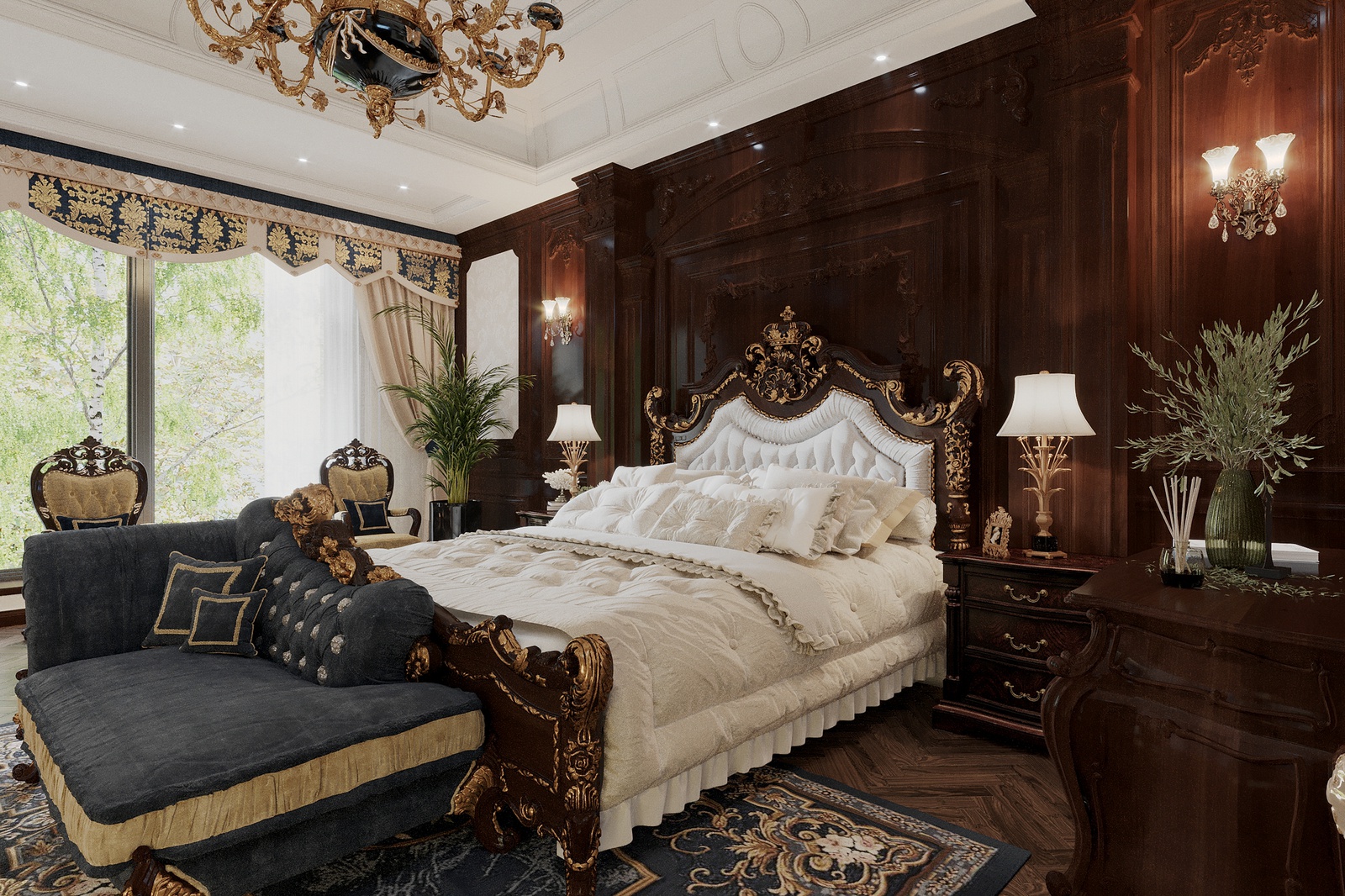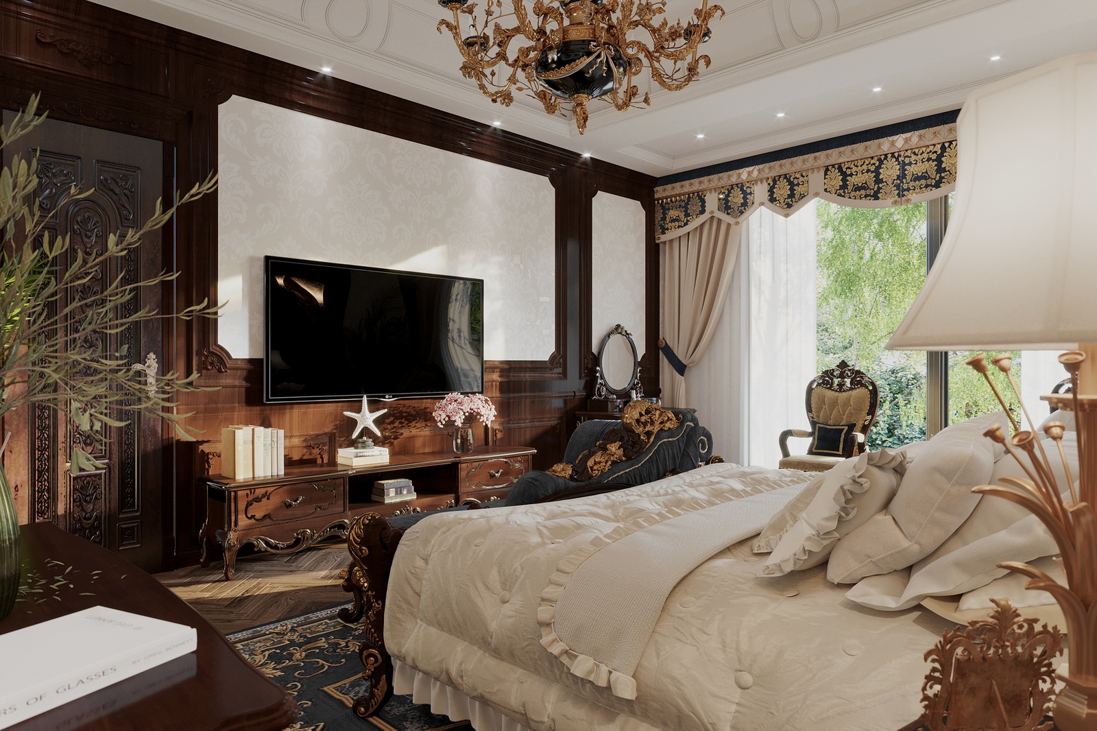 Chất liệu sử dụng cũng là một điểm nhấn đáng chú ý trong concept thiết kế nội thất này. Bỏ qua những chất liệu đắt đỏ đã quá đỗi quen thuộc trong những không gian tân cổ điển Châu Âu như chi tiết mạ vàng, pha lê, da, bọc nhung, công trình còn chủ động sử dụng gỗ tự nhiên - một chất liệu cao cấp đặc trưng của tinh thần tân cổ điển Đông phương.