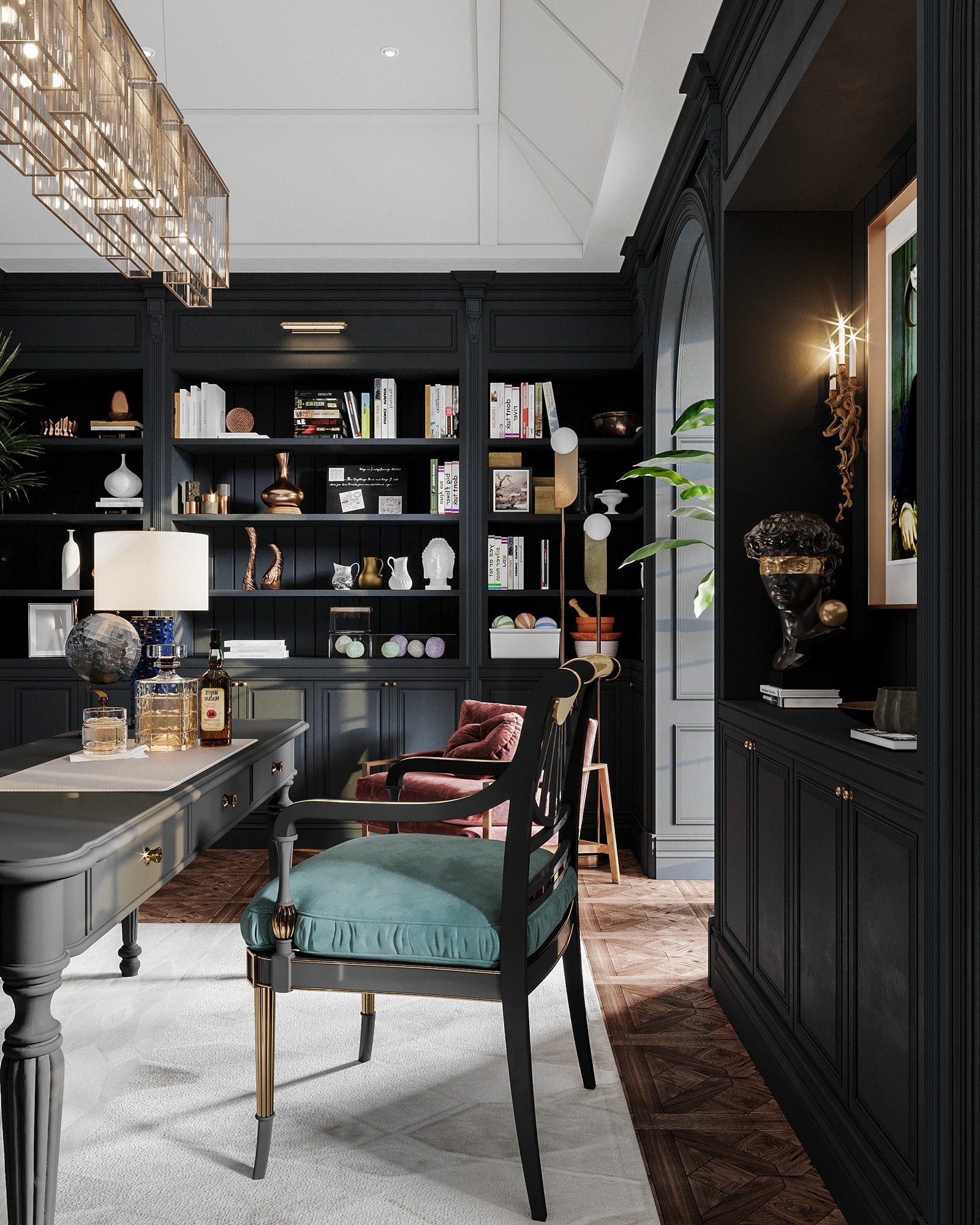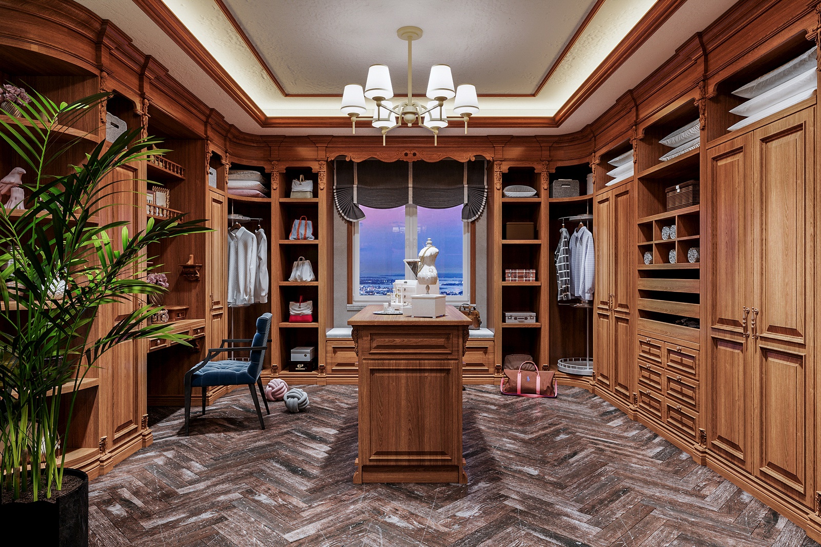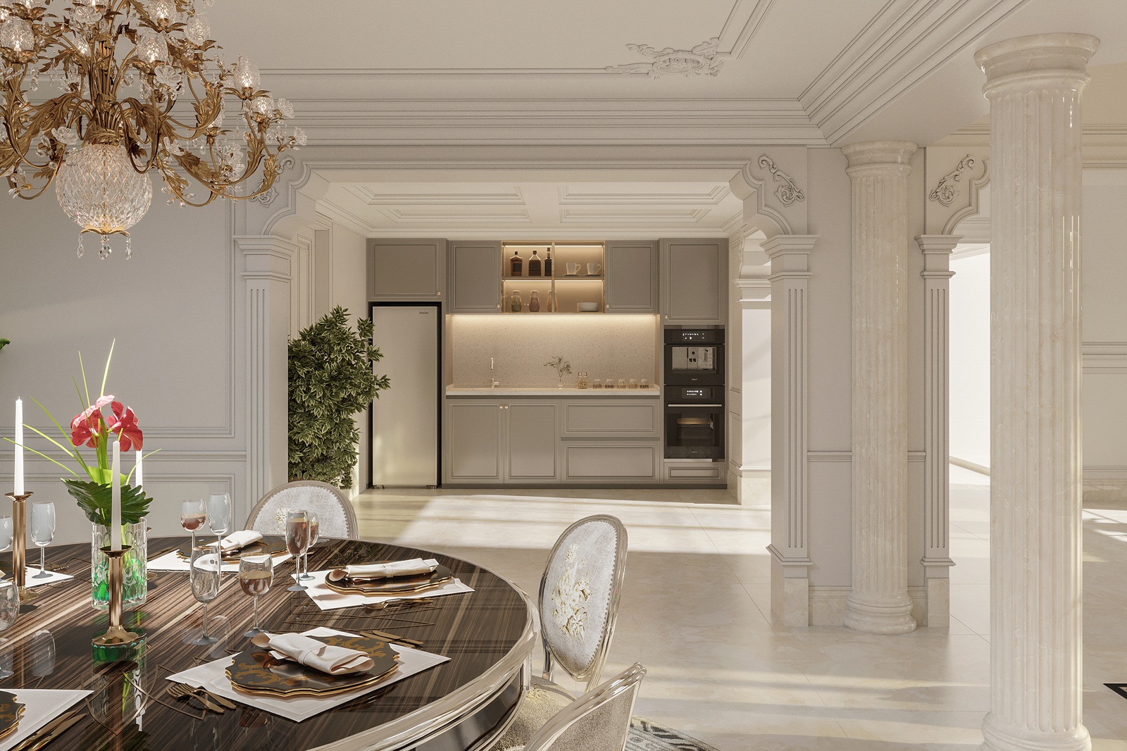 Chất liệu sử dụng cũng là một điểm nhấn đáng chú ý trong concept thiết kế nội thất này. Bỏ qua những chất liệu đắt đỏ đã quá đỗi quen thuộc trong những không gian tân cổ điển Châu Âu như chi tiết mạ vàng, pha lê, da, bọc nhung, công trình còn chủ động sử dụng gỗ tự nhiên - một chất liệu cao cấp đặc trưng của tinh thần tân cổ điển Đông phương.