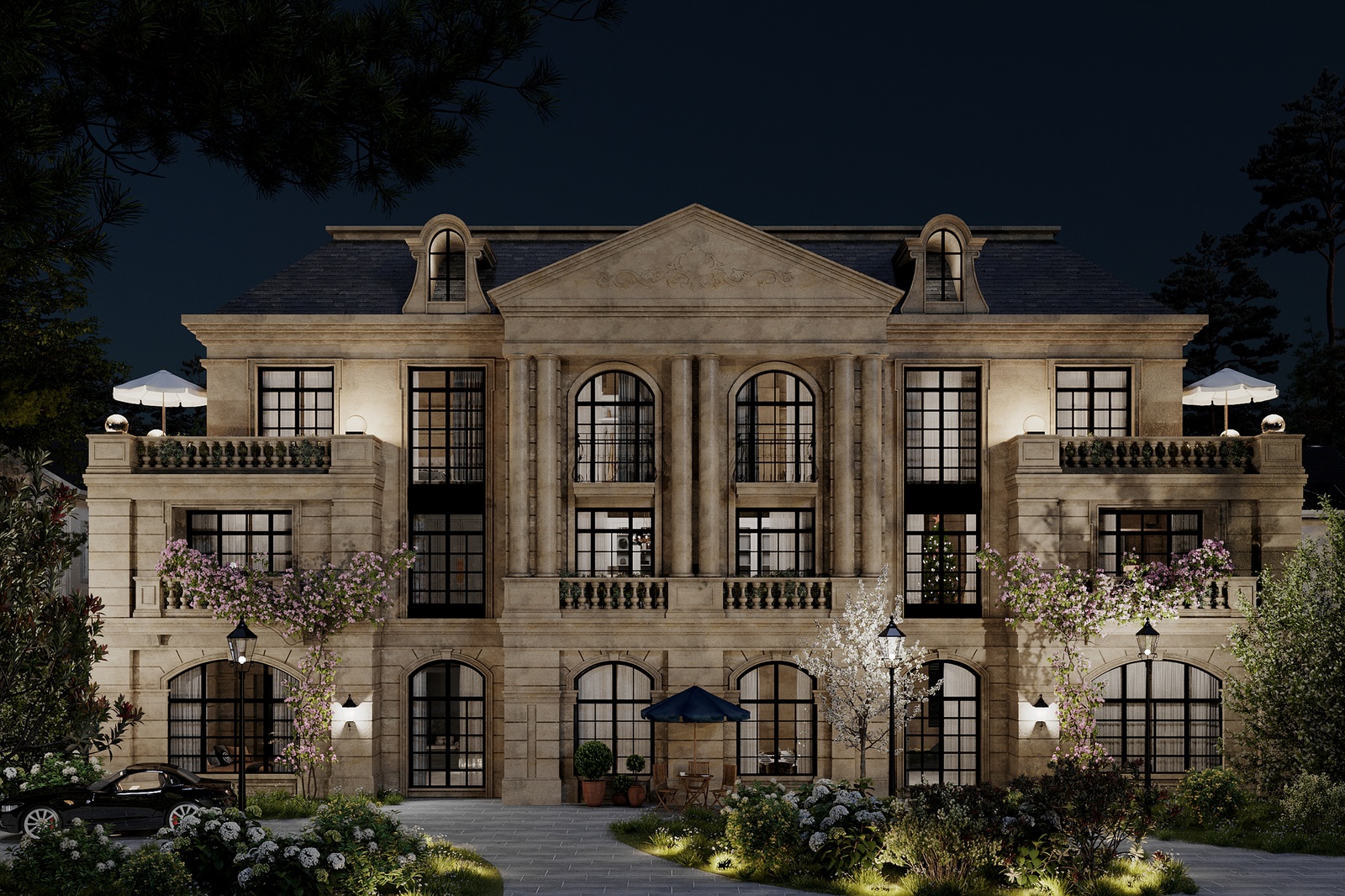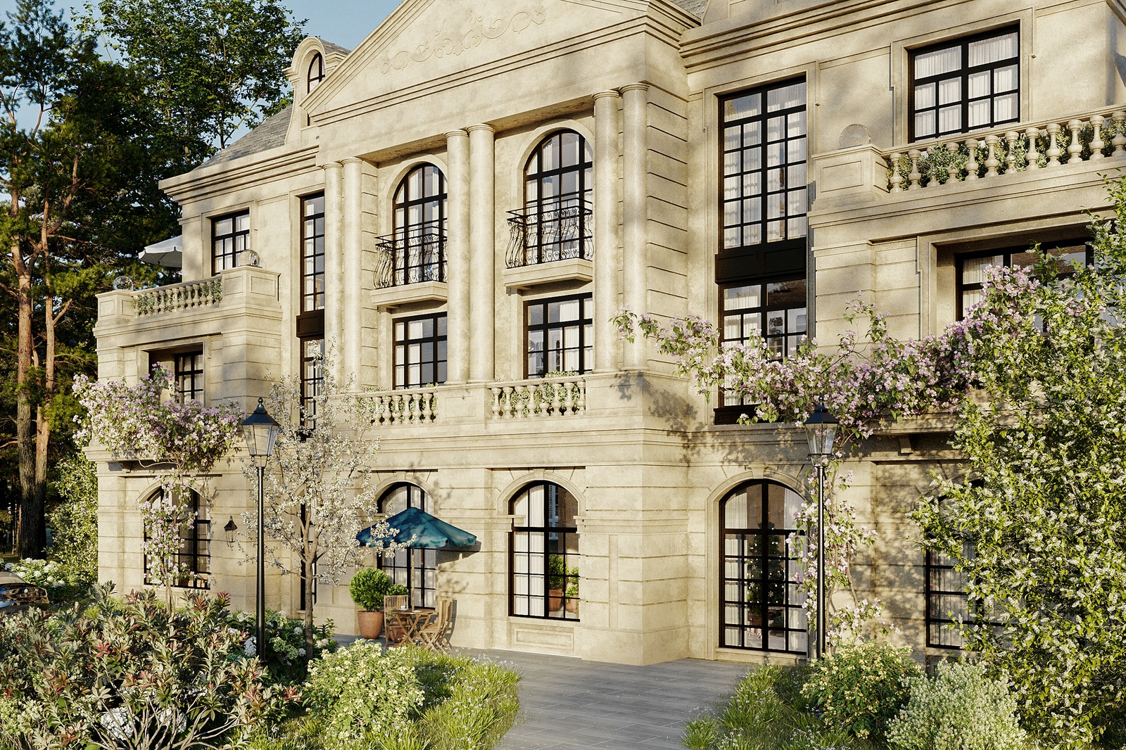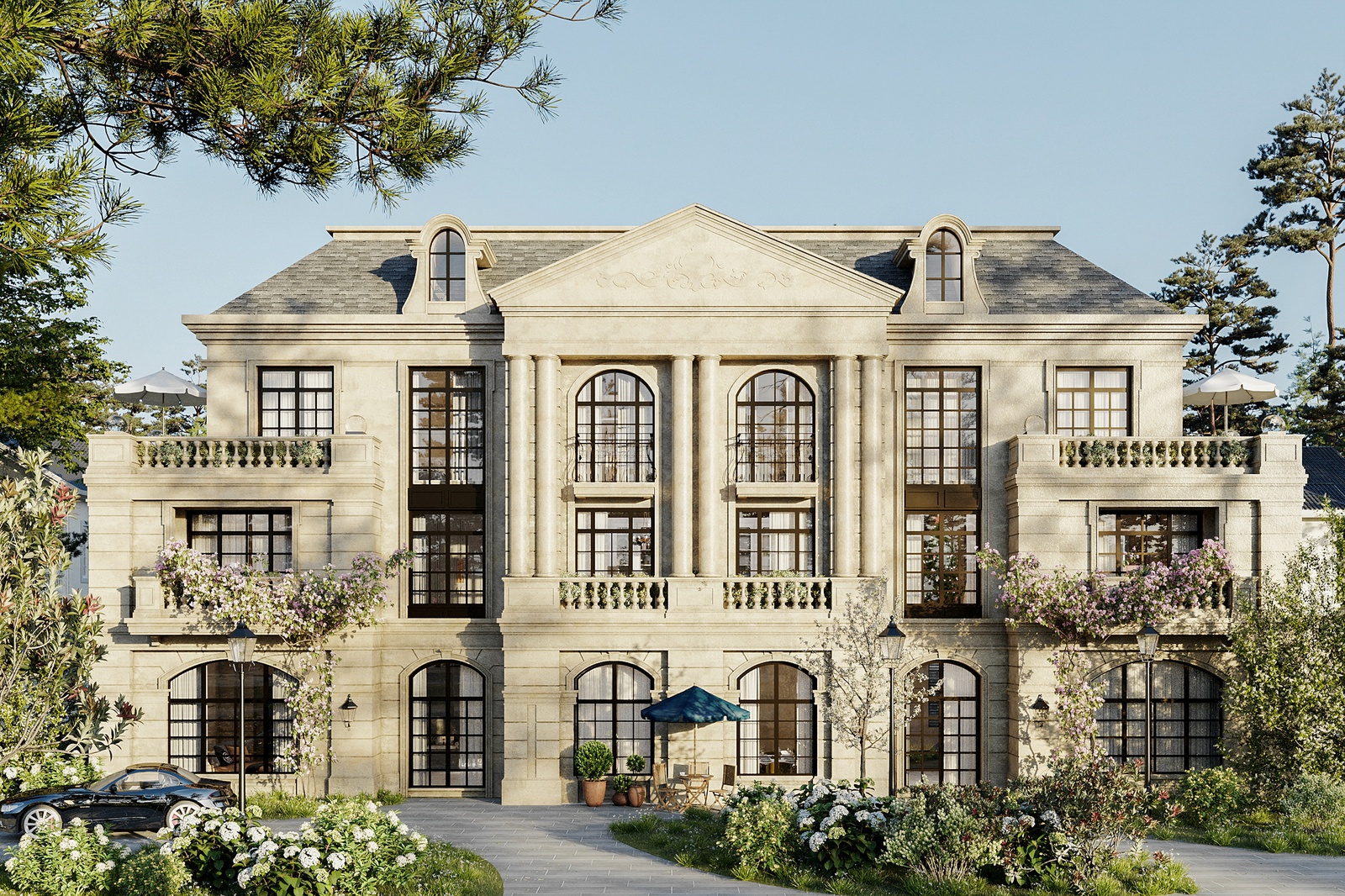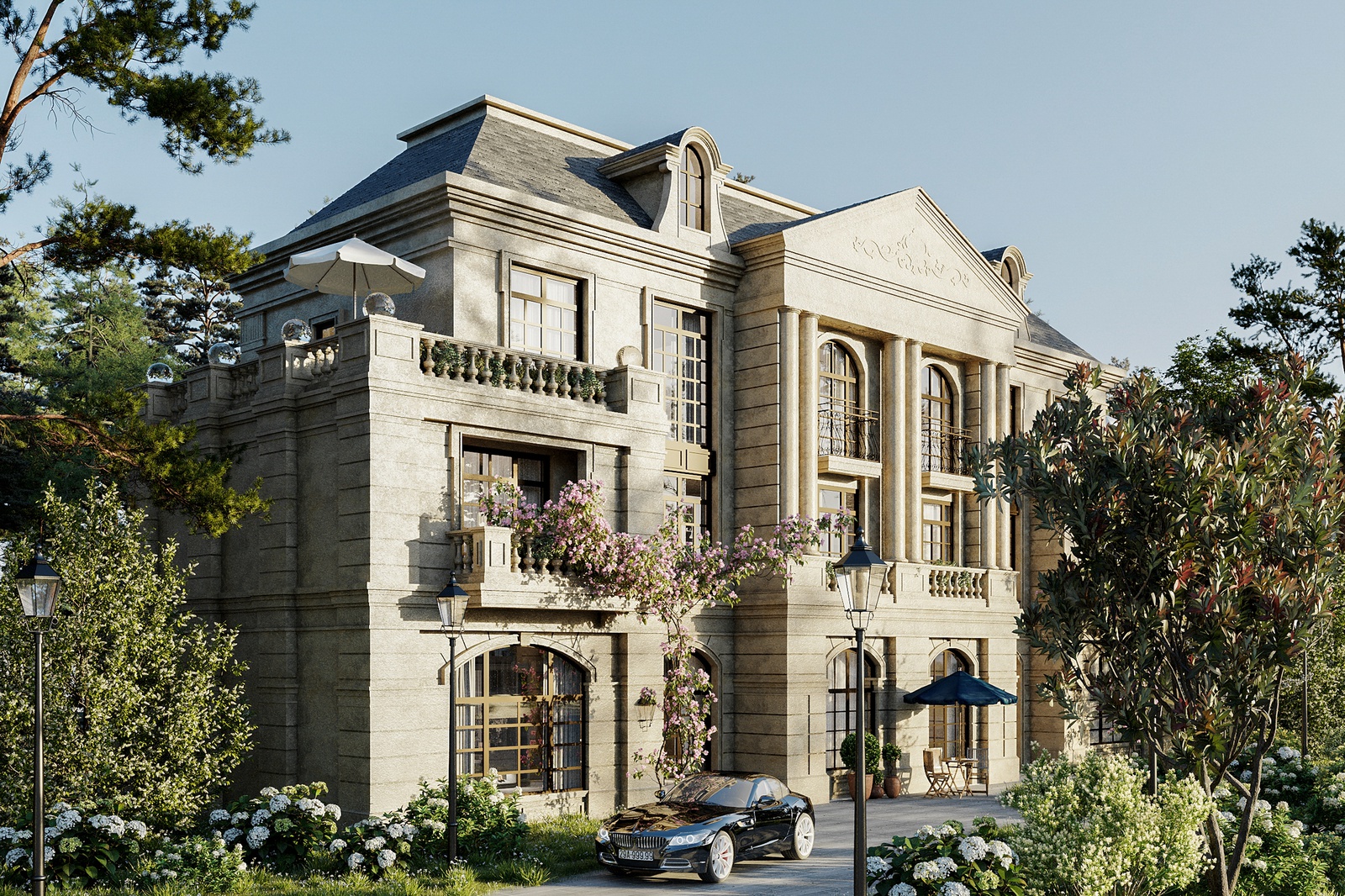 Thiết kế nhấn mạnh vào các đường nét, chi tiết đặc trưng của phong cách như hệ thức cột, đường phào chạy dọc trên tường, họa tiết, phù văn tinh tế, mái kép chuẩn châu âu hay lan can đậm chất Neo-Classic. Bên cạnh kết cấu đối xứng - cân bằng, kiến trúc biệt thự còn ghi dấu ấn bởi một chút cổ kính, huyền bí nhưng không xa rời yếu tố thời đại và hướng đến giá trị tinh thần người sử dụng thông qua khuôn viên sân vườn xanh mát.