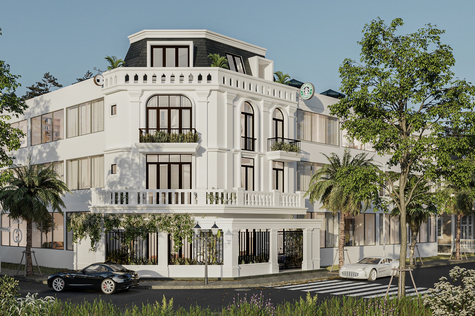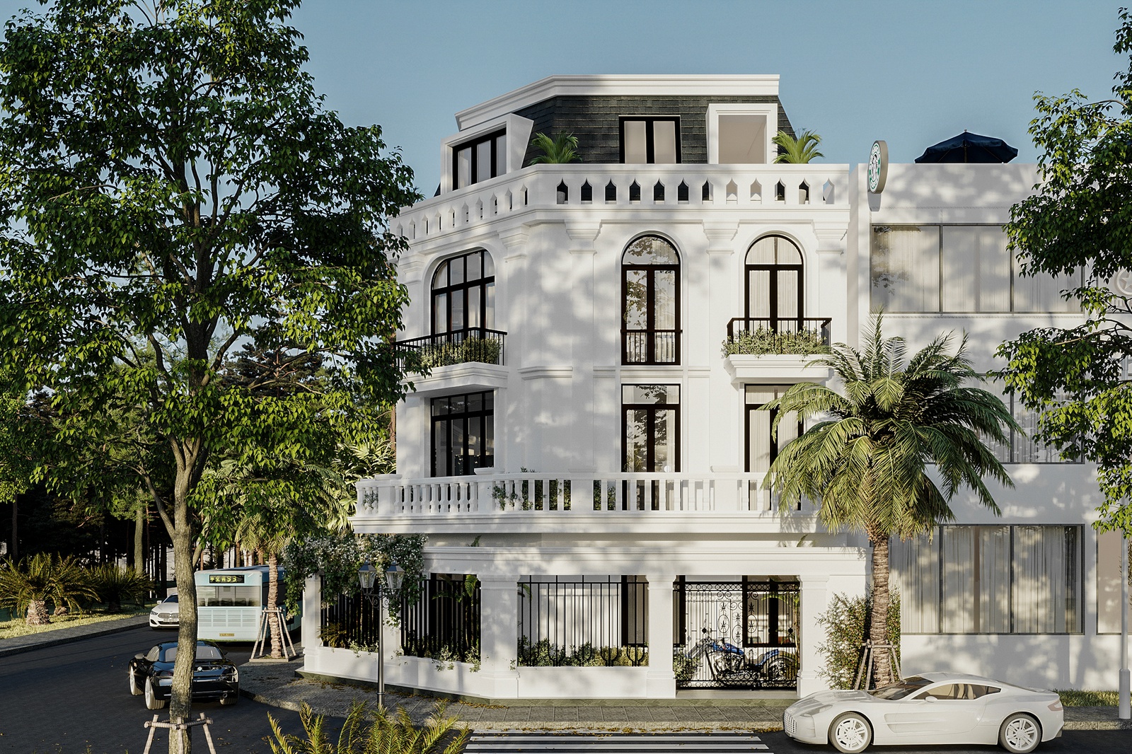 Decox Design giới thiệu một concept thiết kế biệt thự ấn tượng mang tên Aston Villa. Tận dụng diện tích lý tưởng của khu đất cùng vị thế 2 mặt tiền đường đắc địa, kiến trúc biệt thự được thiết kế theo phong cách tân cổ điển Châu Âu sang trọng và bề thế. Về tổng thể, công trình sở hữu nét đẹp tinh tế đầy cuốn hút nhờ gam màu trắng chủ đạo. Tone trắng không chỉ gợi xúc cảm về một không gian sống đẳng cấp mà còn là phông nền hoàn hảo nâng đỡ những chi tiết trang trí như cổng vòm, phào chỉ, thức cột, lan can hay hệ mái nhà kiểu marsand đậm chất Tây phương.