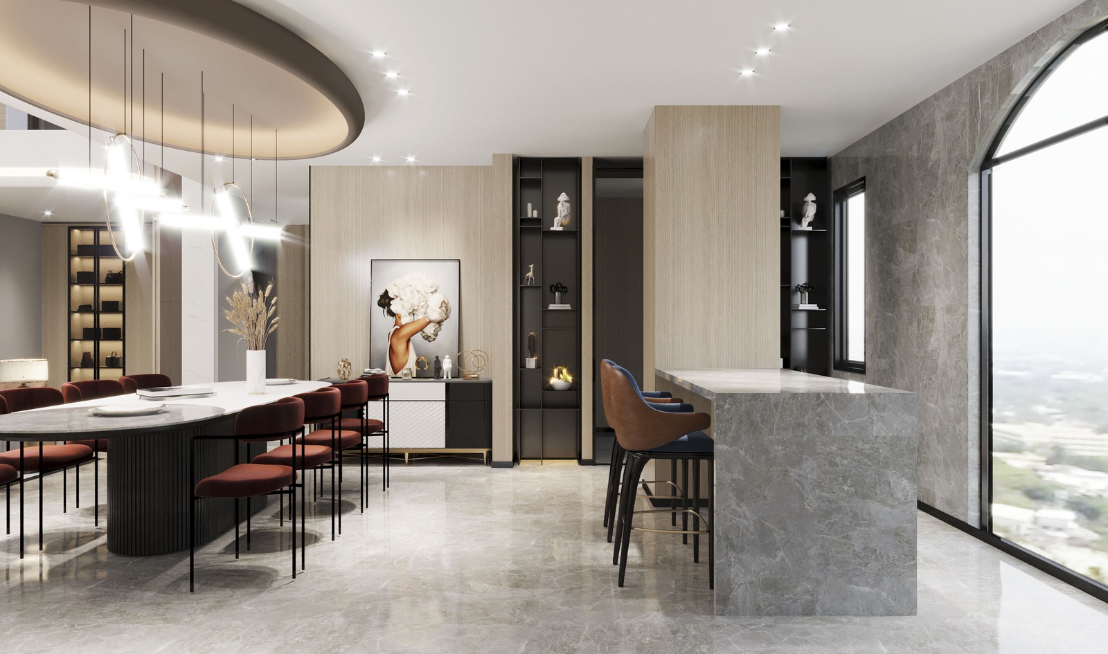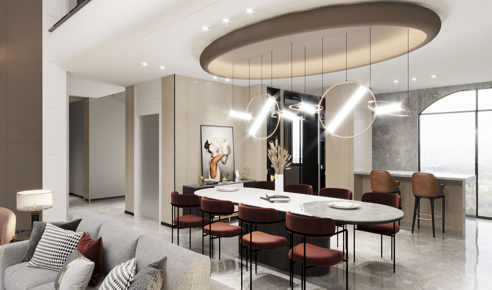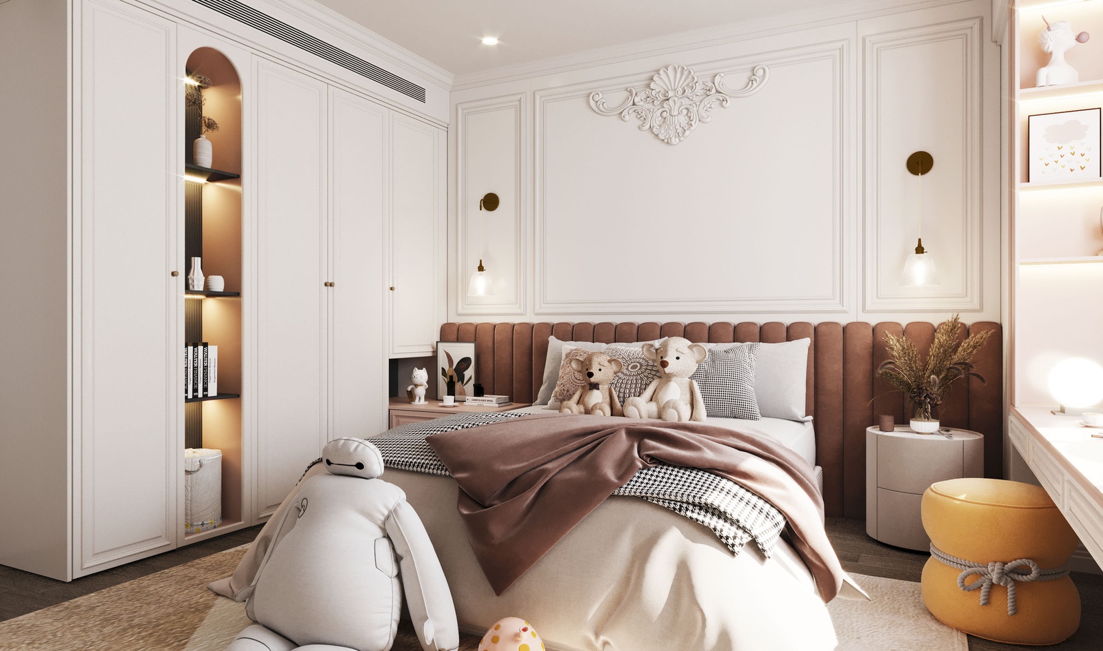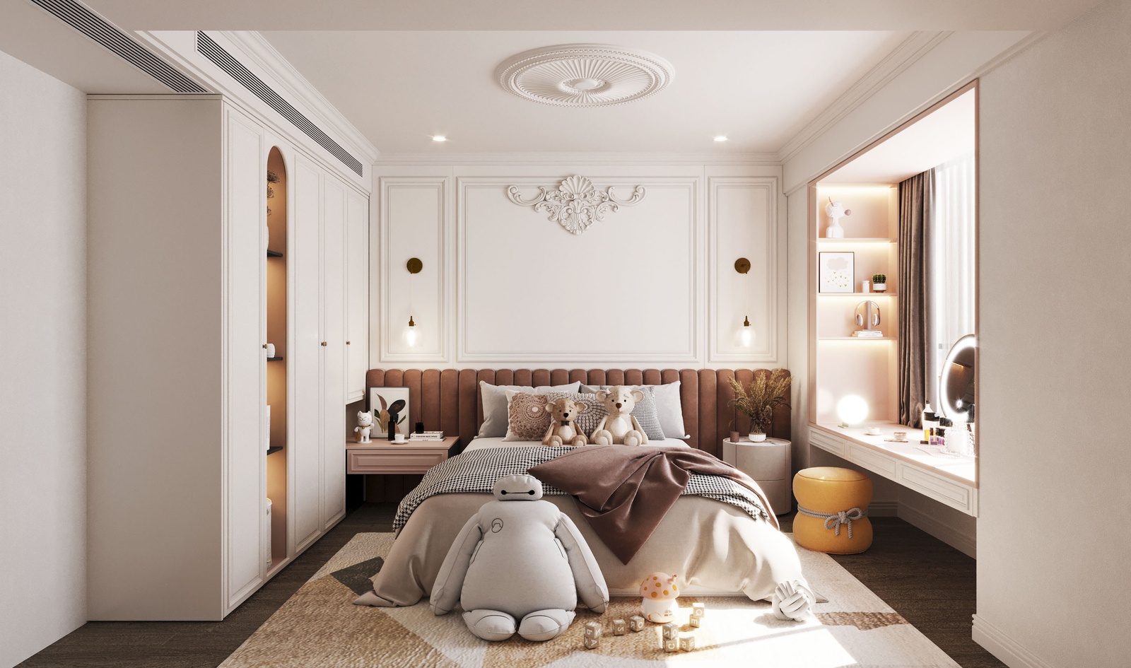 Thiết kế nội thất biệt thự phô diễn được nét đẹp đến từ sự sang trọng, quý phái thông qua các đường nét đặc trưng của phong cách bán cổ điển. Tổng thể nhà biệt thự vẫn sử dụng bảng màu mang thiên hướng nhẹ nhàng, tinh tế nhưng không kém phần đẳng cấp, thời thượng như tone trắng chủ đạo, tone nâu nhấn điểm và thêm một chút bứt phá, quý phái với tone màu đỏ booc-đô trang trí trên đồ nội thất. Ở đây những chi tiết phào chỉ đều được kẻ thẳng phối hợp cùng hoa văn trang trí chạm khắc mềm mại, quyến rũ. Bên cạnh những chất liệu cao cấp, đắt đỏ như đá cẩm thạch nguyên khối ốp tường, đá marble xám vân mây lát sàn và những chi tiết kim loại mạ vàng KTS còn kết hợp thêm chất liệu gỗ nhằm đem đến sự ấm cúng, góp phần cân bằng không gian sống.