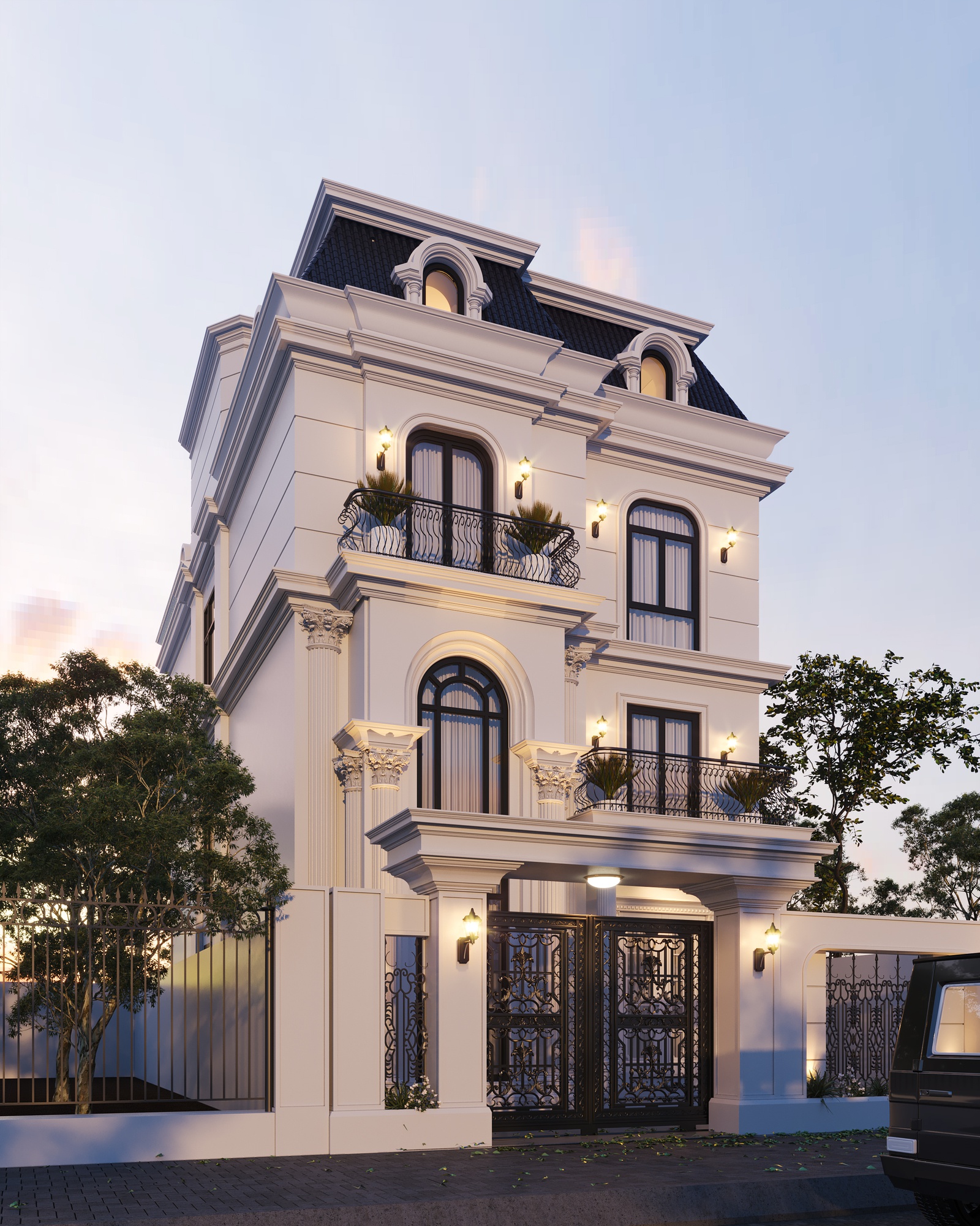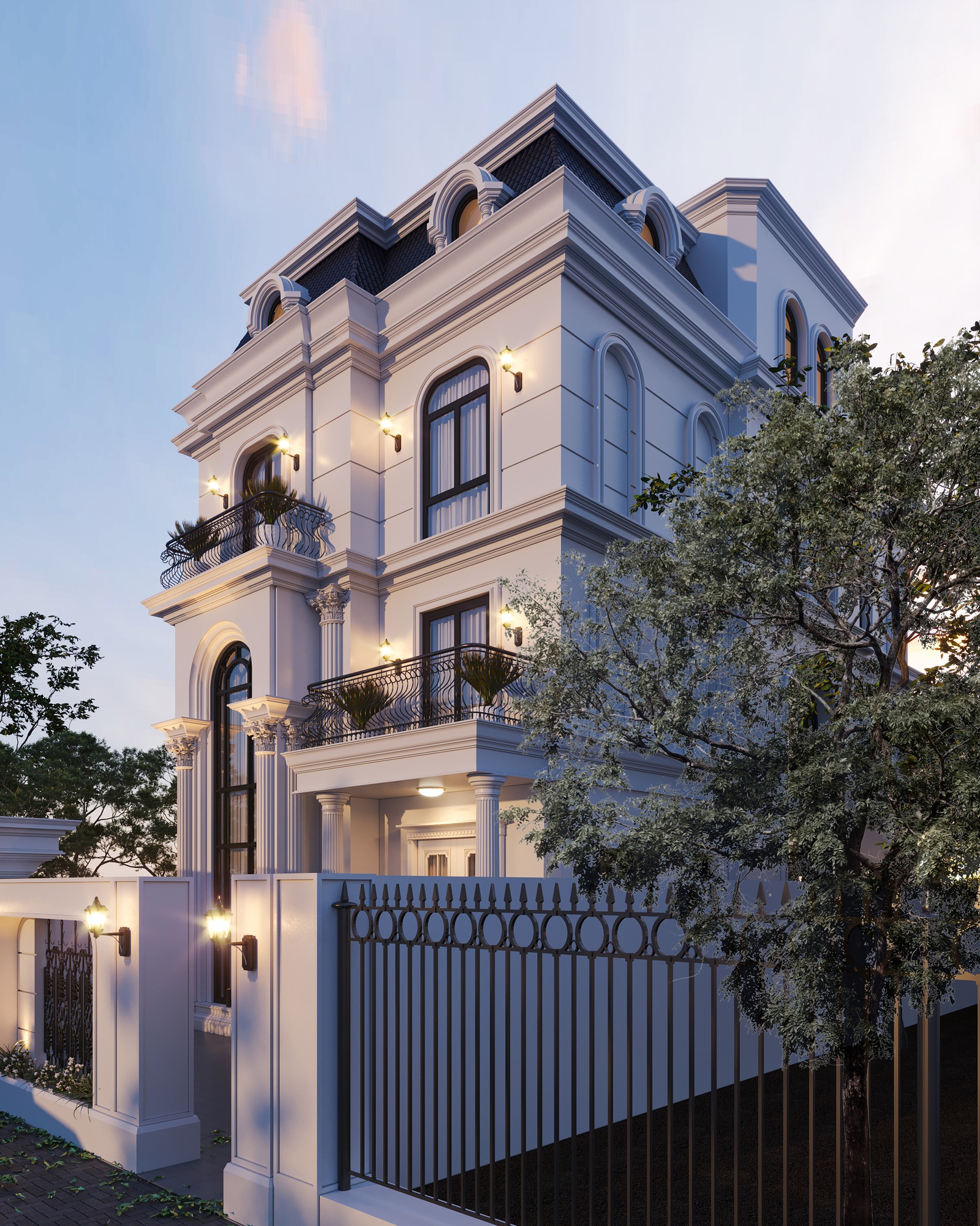 Phong cách bán cổ điển với vẻ đẹp sang trọng, tinh tế thường được chọn lựa, gửi gắm để kiến tạo nên một không gian sống trang hoàng, đẳng cấp đặc biệt là loại hình nhà biệt thự. Thấu hiểu được điều này, Decox Design xin giới thiệu đến bạn một căn biệt thự đơn lập được thiết kế theo phong cách bán cổ điển có cấu trúc 3 tầng và 1 tầng áp mái. Thiết kế biệt thự lấy tone màu trắng chủ đạo nhấn điểm cùng những chi tiết kẻ viền sơn đen hoặc mạ vàng sang trọng. Bên cạnh hình khối vuông vức, mạnh mẽ KTS cũng bổ sung thêm những đường nét mềm mại, tinh tế thông qua hệ cửa vòm, thức cột trang trí hoa tiết, phù điêu tinh giản đậm chất neo-classic. Khi về đêm, căn biệt thự càng tỏa ra sức hút hoa lệ, cổ kính nhưng cũng không kém phần lung linh, ấm cúng nhờ hệ đèn ốp tường tỏa ánh sáng vàng dịu nhẹ.