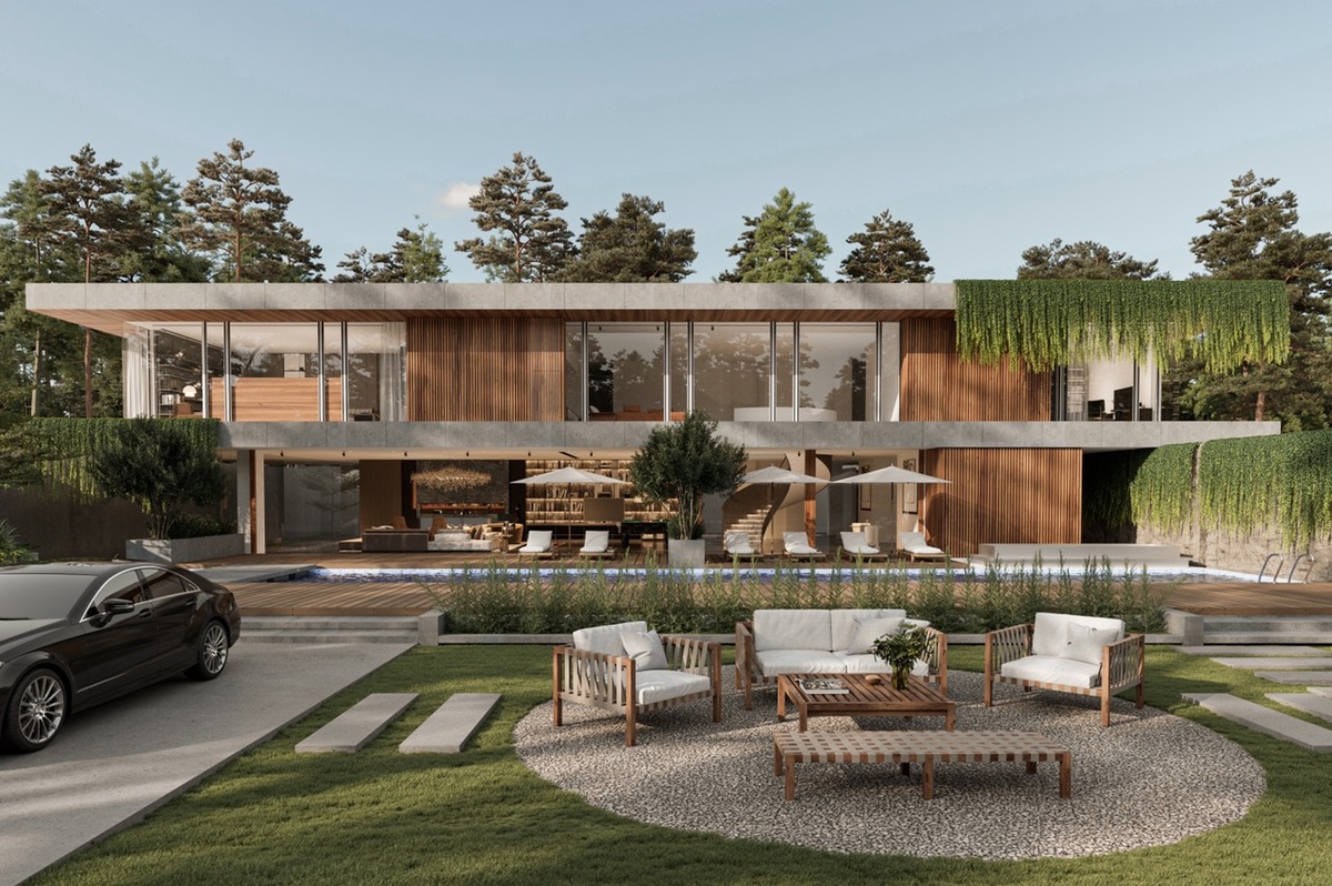 Ấn tượng đầu tiên khi nhìn vào kiến trúc biệt thự chính là một khối vững chãi với sự kết hợp của gỗ, bê tông và các cửa kính lớn cùng mảng xanh tươi mát của thiên nhiên. Có thể thấy, những mảng màu sáng - tối, hàn - ấm được cắt ghép, phối trộn nhịp nhàng với nhau đã kết thành một tổng thể vừa cá tính vừa mộc mạc và đem đến cho người sử dụng cảm giác khoan khoái, nhẹ nhàng chứ không hề nặng nề, u tối.