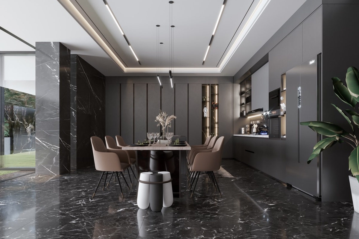 Phong cách thiết kế chính của Mint Villa là hiện đại, tuy nhiên để không gian mang dấu ấn riêng và truyền tải được cá tính gia chủ thì KTS đã thổi vào đôi chút nét lạnh lùng nhưng tao nhã của cách trang trí theo lối Luxury. Lựa chọn đúng chất liệu để xây dựng phong cách không gian sống mong muốn cũng là yếu tố tỏ rõ sự thành công trong thiết kế nội thất. Ví như cách chọn chất liệu cho dự án này, để phô diễn tính tự do của phong cách hiện đại và sự cá tính, tinh tế của nghệ thuật sang trọng thì những chất liệu như đá, kim loại, da, pha lê,... là không thể thiếu để tạo nên một tổng thể liên kết hài hòa và thu hút mọi ánh nhìn.