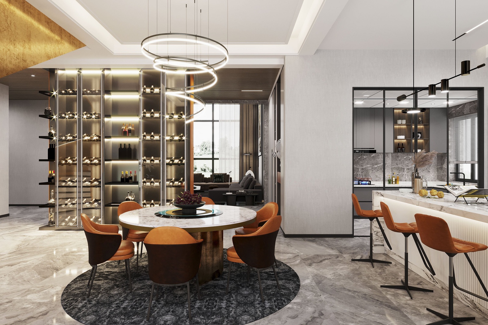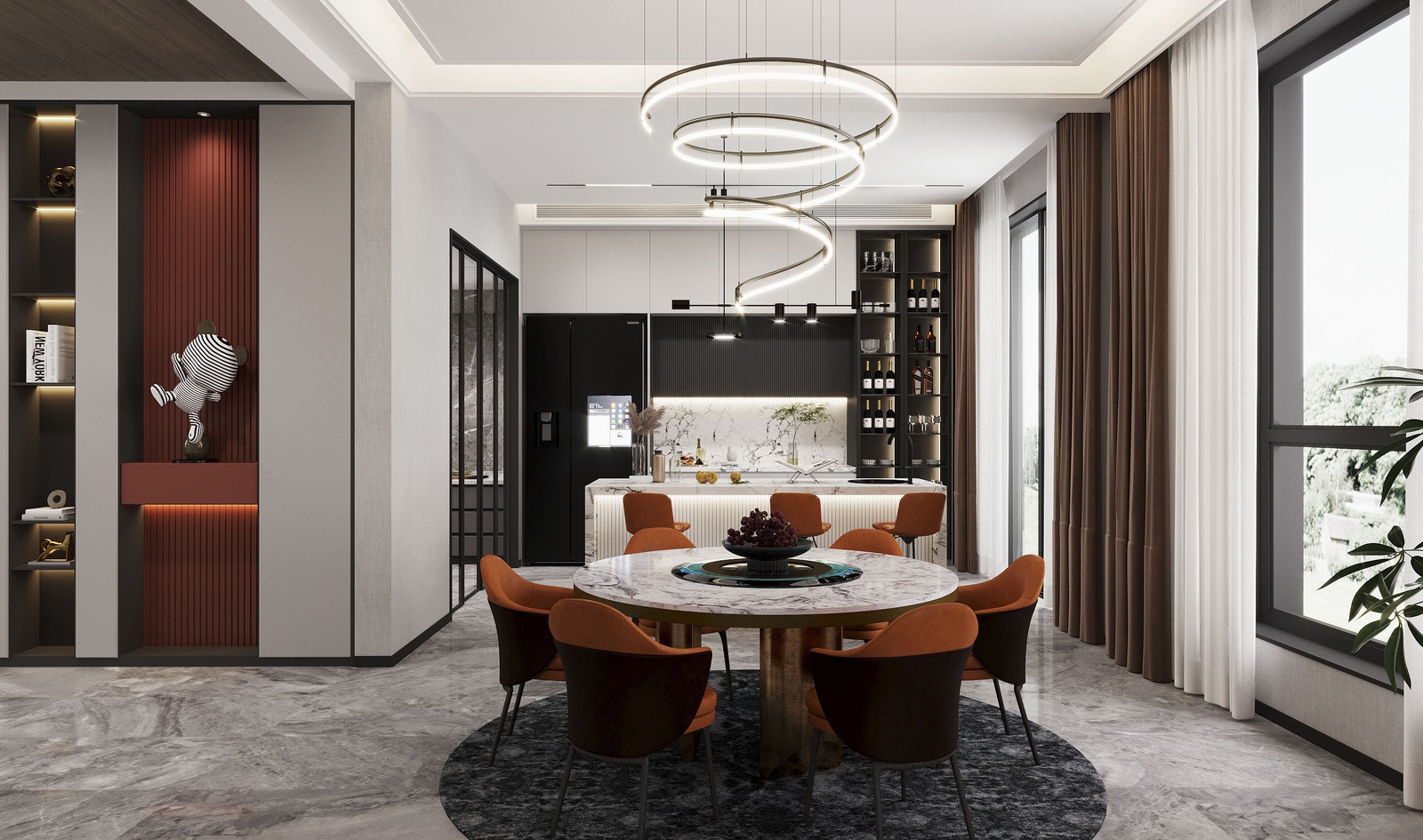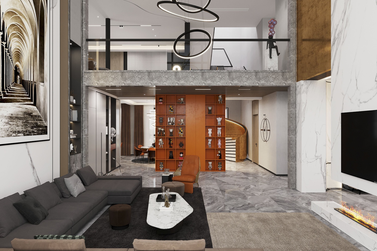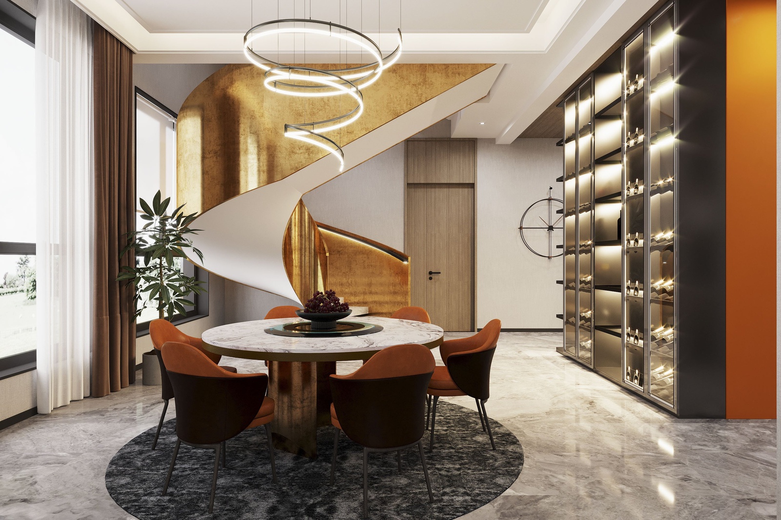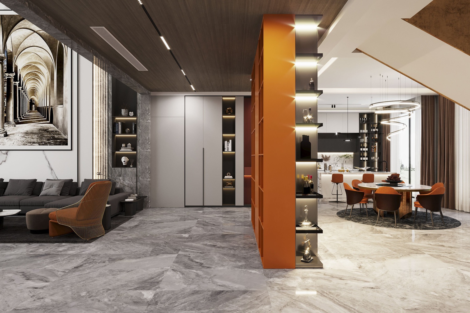 Thiết kế nội thất chủ trương nối tiếp vẻ đẹp hiện đại của kiến trúc. Tuy nhiên, nếu chỉ giữ đúng những đặc trưng vốn có của phong cách thì công trình sẽ thiếu sức hấp dẫn. Để khắc phục điều này, KTS đã mạnh dạn bổ sung thêm những khối màu nóng như cam, đỏ và màu đồng điểm xuyết xuyên suốt khắp cầu thang, bàn ghế, kệ trang trí… để không gian vừa phô bày được vẻ cá tính, sự linh hoạt trong cách phối trộn của phong cách vừa gây ấn tượng bởi bầu không khí sung túc hiện hữu trong mọi ngóc ngách của căn nhà.