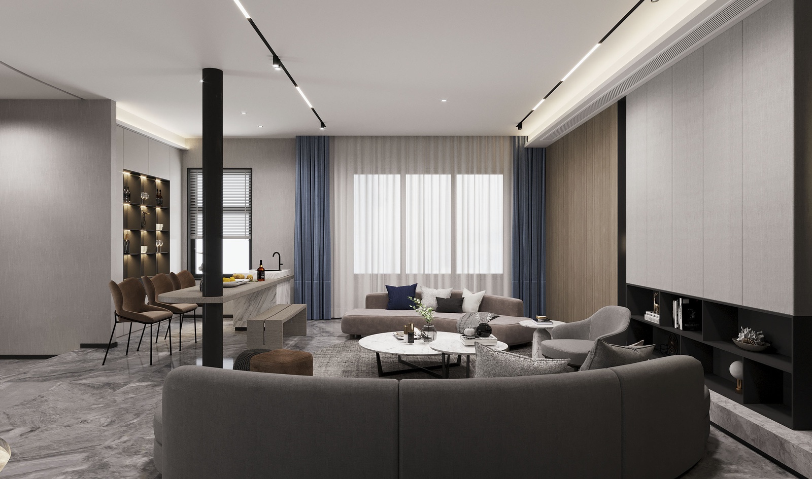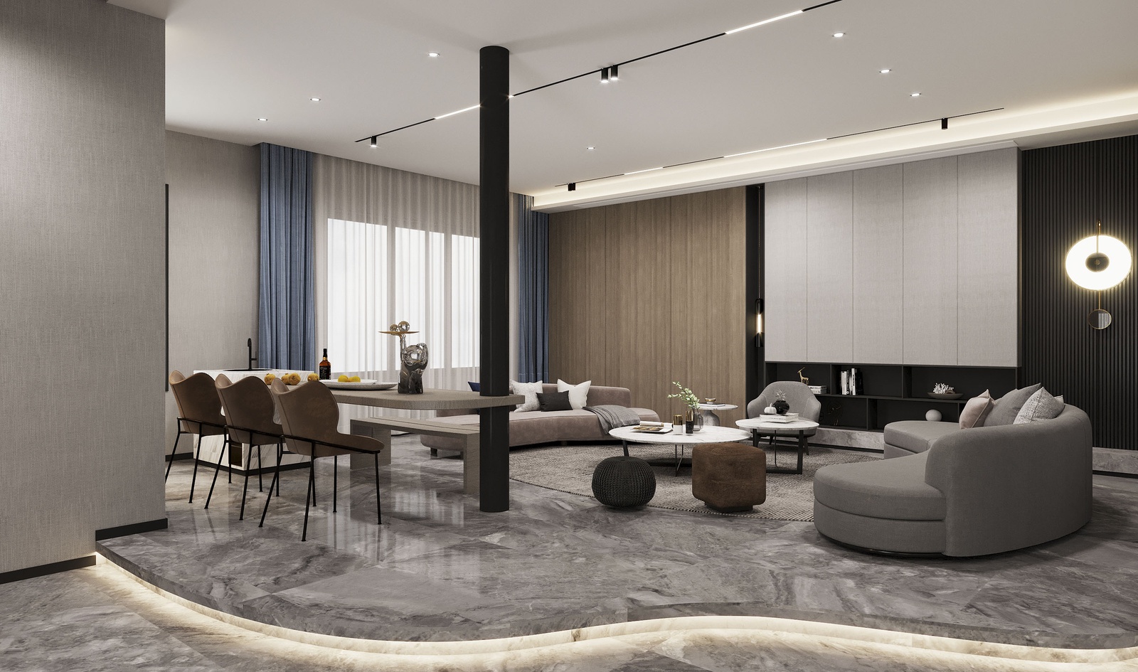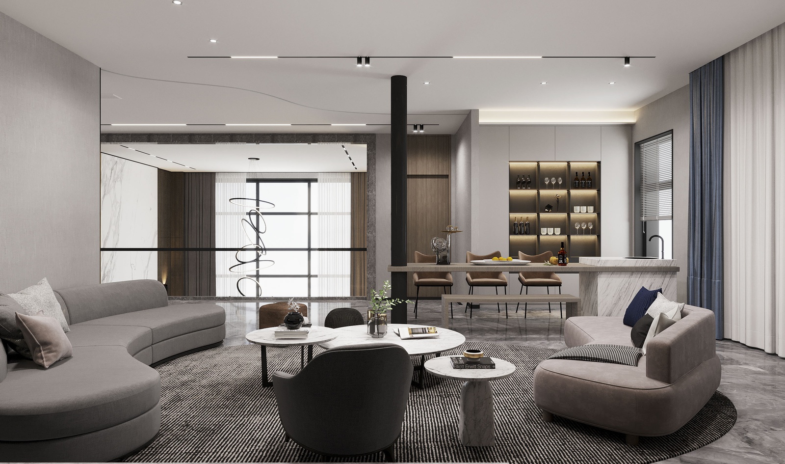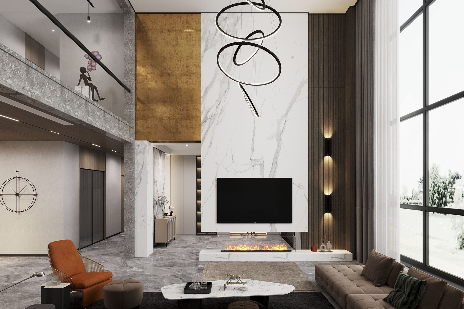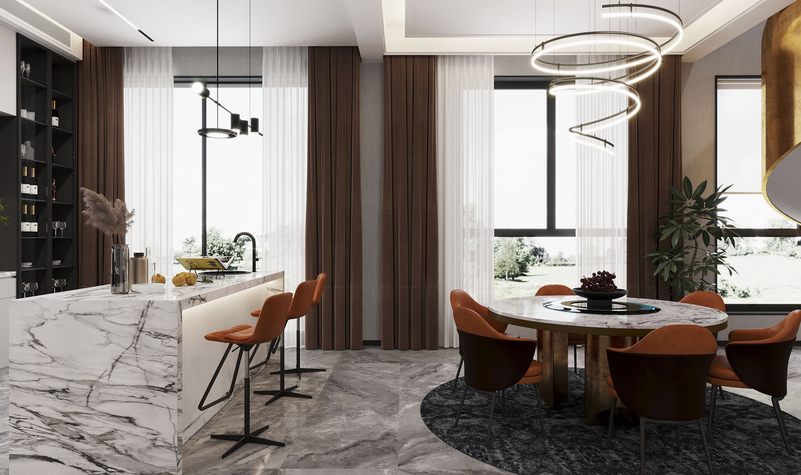 Thiết kế nội thất chủ trương nối tiếp vẻ đẹp hiện đại của kiến trúc. Tuy nhiên, nếu chỉ giữ đúng những đặc trưng vốn có của phong cách thì công trình sẽ thiếu sức hấp dẫn. Để khắc phục điều này, KTS đã mạnh dạn bổ sung thêm những khối màu nóng như cam, đỏ và màu đồng điểm xuyết xuyên suốt khắp cầu thang, bàn ghế, kệ trang trí… để không gian vừa phô bày được vẻ cá tính, sự linh hoạt trong cách phối trộn của phong cách vừa gây ấn tượng bởi bầu không khí sung túc hiện hữu trong mọi ngóc ngách của căn nhà.