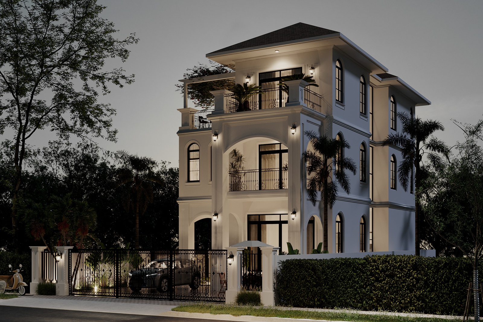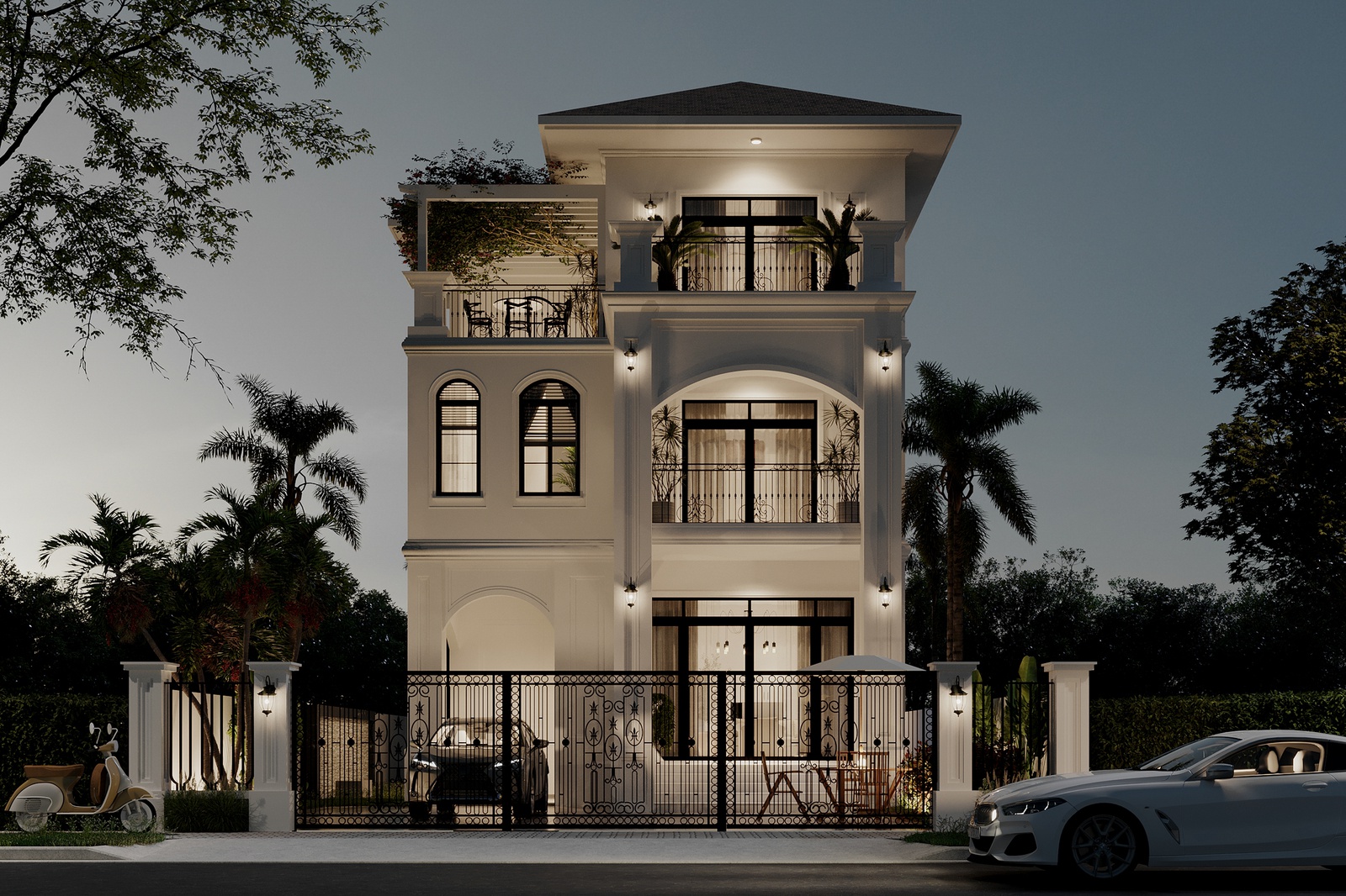 Đơn giản mà sang trọng nhờ nghệ thuật lấy màu sắc và chi tiết làm điểm nhấn, dự án The Classica Villa khoác lên mình vẻ đẹp thanh lịch, tinh tế và thời thượng. Lấy cảm hứng từ phong cách tân cổ điển căn biệt thự phố 3 tầng chọn lựa sử dụng tone trắng chủ đạo nhằm tôn lên sự mềm mại, uyển chuyển của những chi tiết trang trí như phào chỉ, cổng vòm, thức cột. Nền trắng còn góp phần tô điểm cho các chi tiết hoa sắt lan can, khung cửa sổ hay hệ cổng rào sơn đen thêm phần nổi bật. Điểm nhấn của thiết kế còn nằm ở chi tiết mái thái lợp ngói vừa mang hương vị cổ kính, truyền thống vừa tôn lên sự bề thế của công trình.