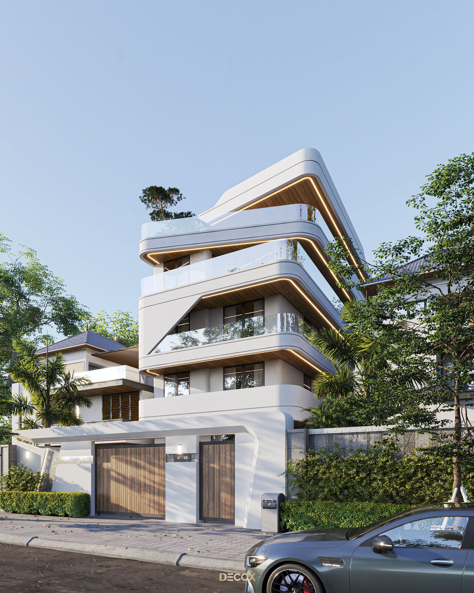 Đề bài mà Decox Design nhận được lần này là một không gian sống hiện đại, sang trọng và cá tính. Với diện tích lô đất lên đến 420m2, KTS của Decox đã mang đến một căn biệt thự có sân vườn với thiết kế ấn tượng lấy cảm hứng từ những chiếc du thuyền xa hoa, vượt qua thời gian và không gian với dáng dấp hiện đại nhưng cũng pha trộn một chút gì đó thuộc về tương lai.