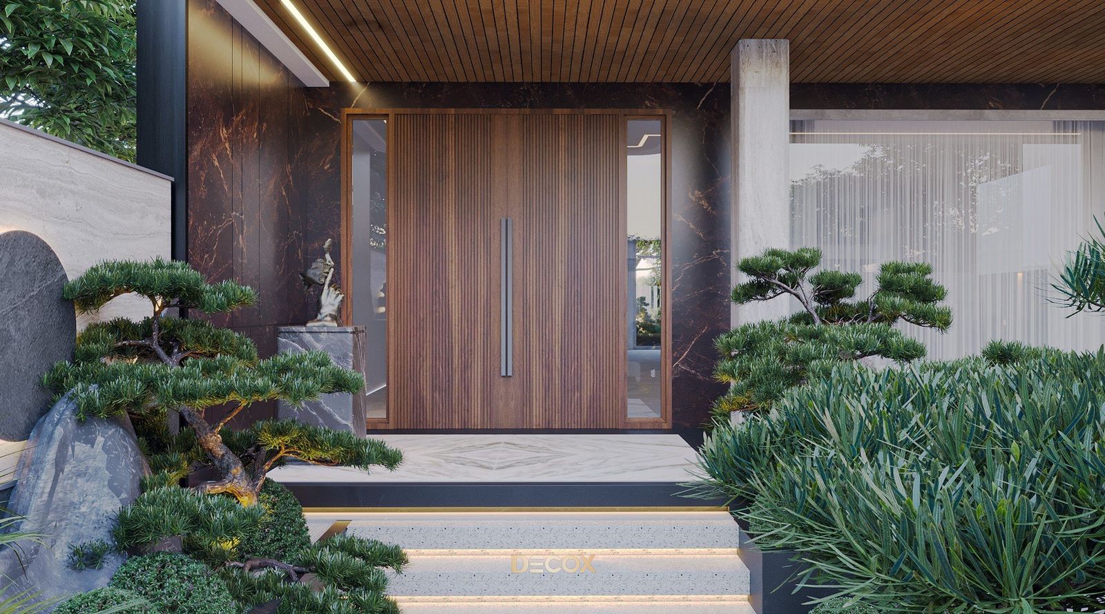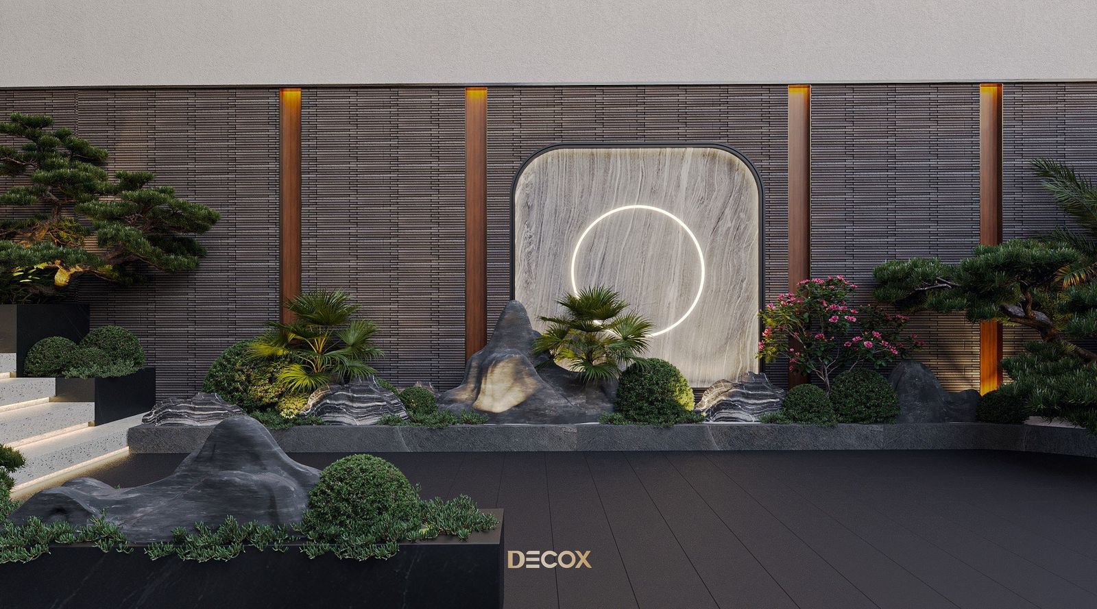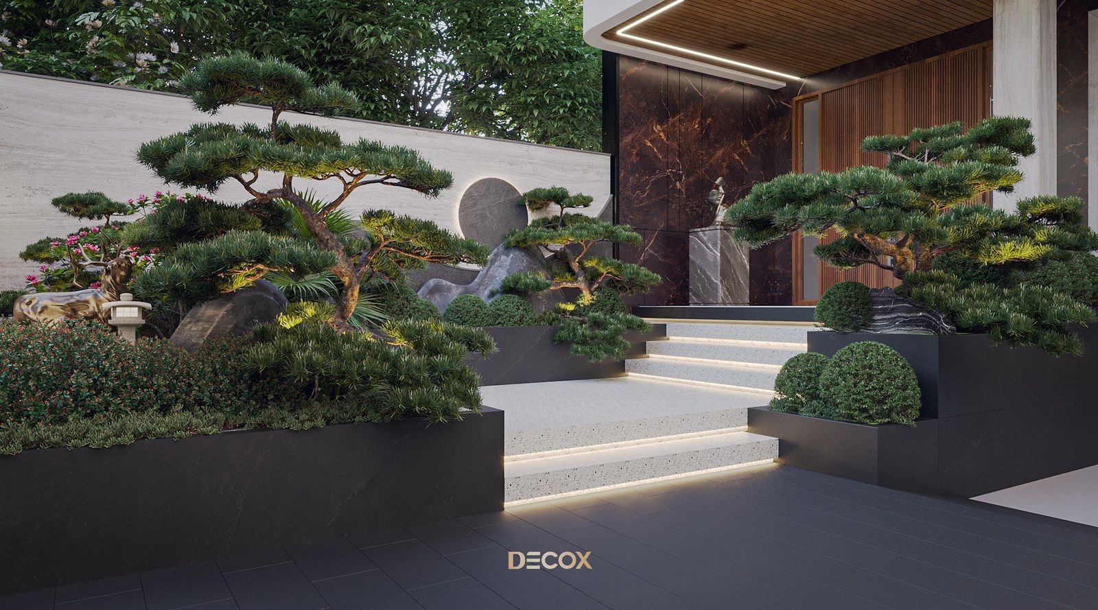 Tiểu cảnh sân vườn biệt thự cũng được chăm chút, tỉ mỉ. Lấy cảm hứng từ sân vườn kiểu Nhật với những phiến đá tự nhiên không qua xử lý kết hợp những chậu cây bonsai được tạo hình đầy nghệ thuật và hệ thống chiếu sáng phân bổ hợp lý, không gian sân vườn không chỉ có tác dụng trang trí mà còn là không gian tuyệt vời để gia chủ thường trà hay tìm lại sự tĩnh tại và cân bằng giữa tâm hồn và thể xác.