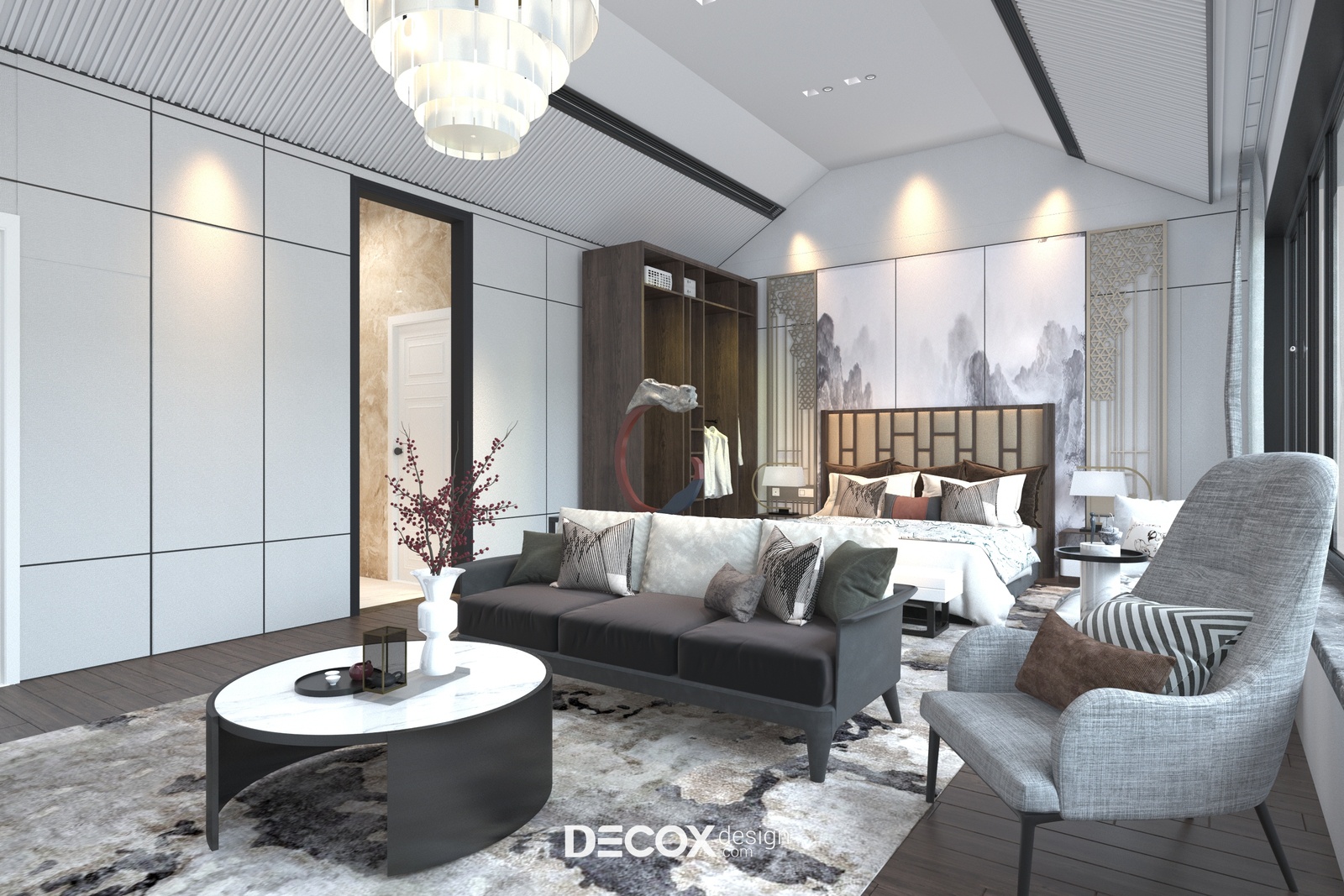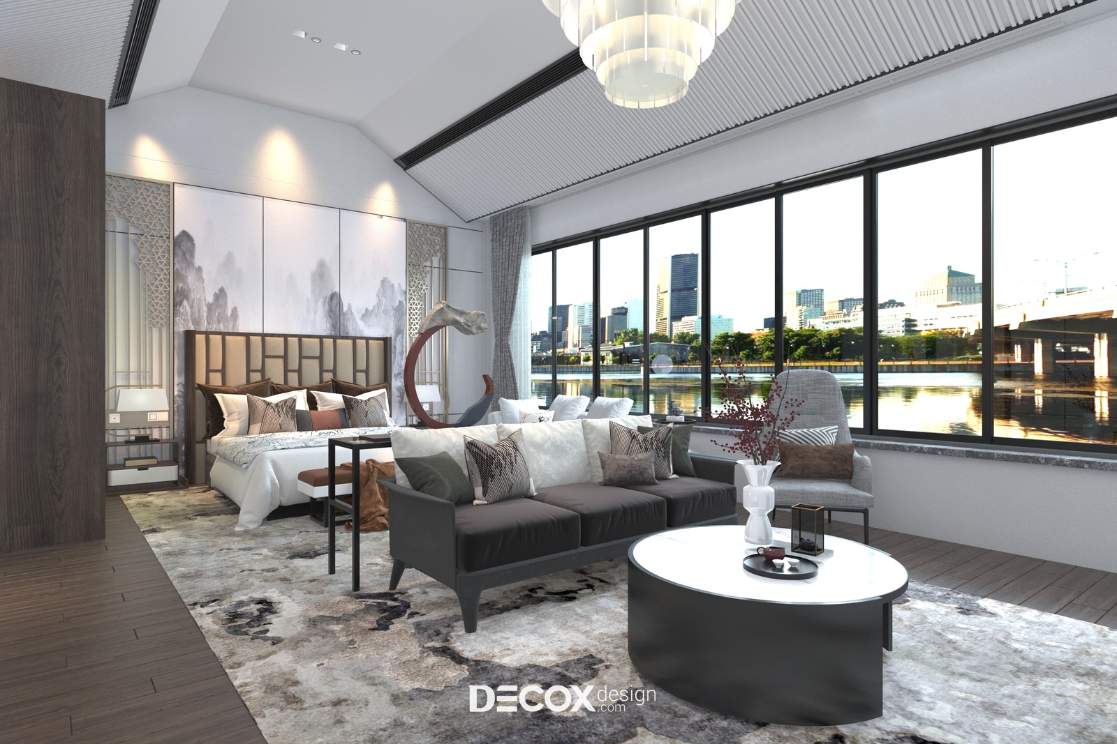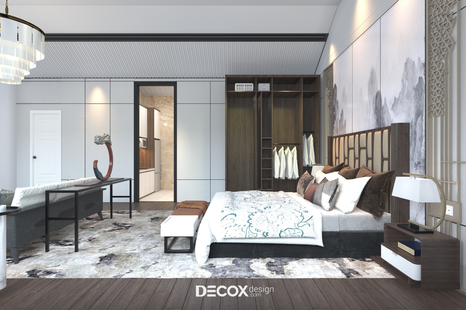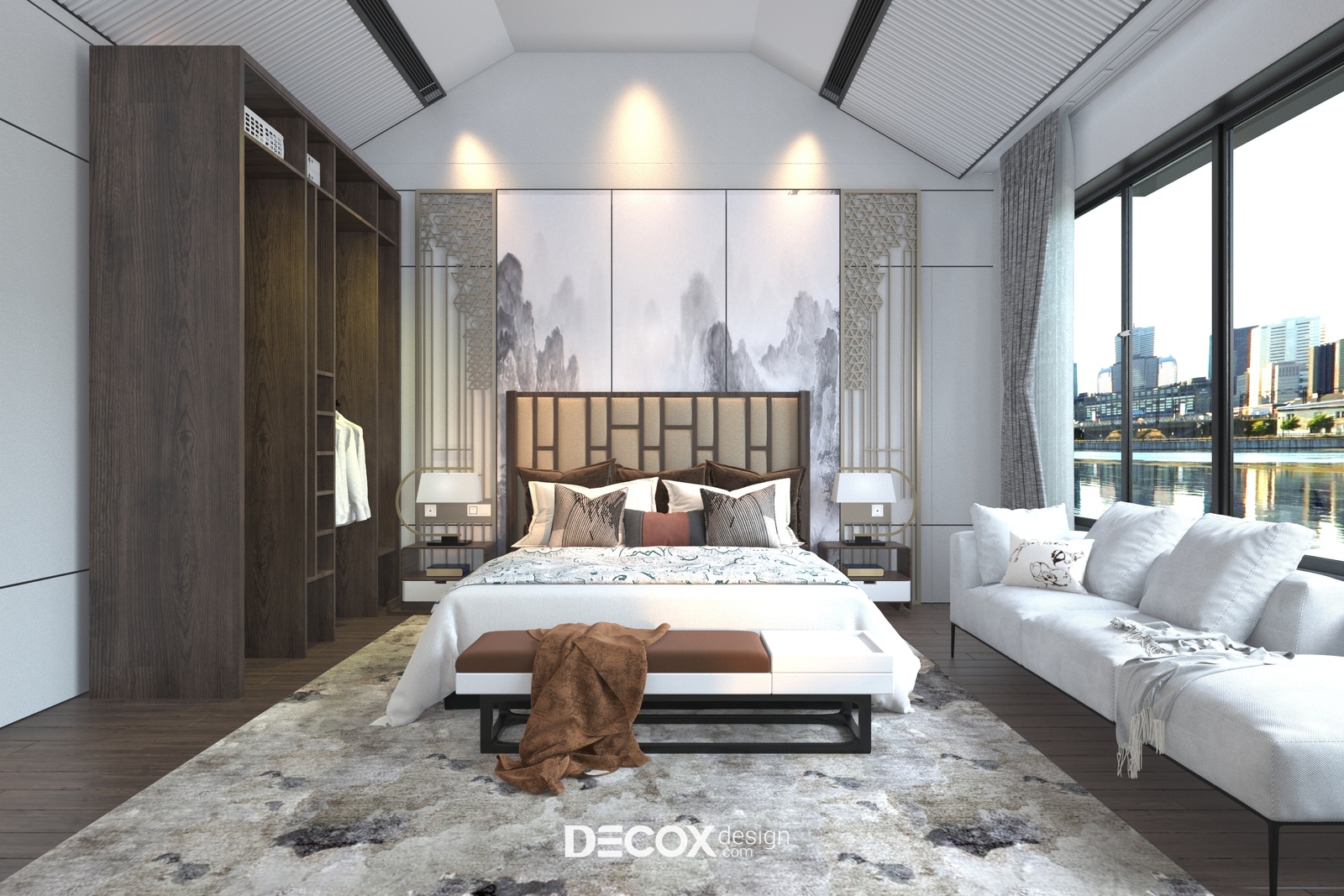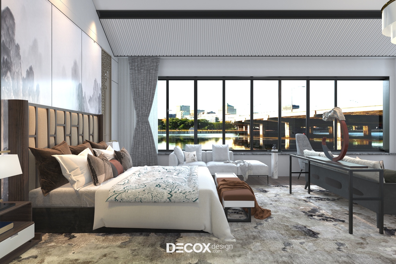 Không gian phòng ngủ hiện đại được điểm xuyết thêm một số chi tiết trang trí đậm chất truyền thống phương Đông như bức tranh sơn thủy đầu giường ngủ, họa tiết hình học trên vách ốp tường, đèn ngủ phá cách... Kết hợp cùng chất liệu gỗ và ánh đèn vàng dịu nhẹ sẽ đem đến cho khách hàng một không gian nghỉ ngơi ấm cúng, thoải mái và tiện nghi. Để tận dụng lợi thế tầm nhìn đẹp mà căn hộ dịch vụ sở hữu, ngoài hệ cửa sổ kính lớn trải dài theo chiều ngang căn hộ Decox Design còn bố trí thêm một chiếc ghế sofa thư giãn êm ái cạnh giường ngủ để khách hàng có thể dễ dàng thu trọn quang cảnh hồ nước xinh đẹp vào trong tầm mắt.
