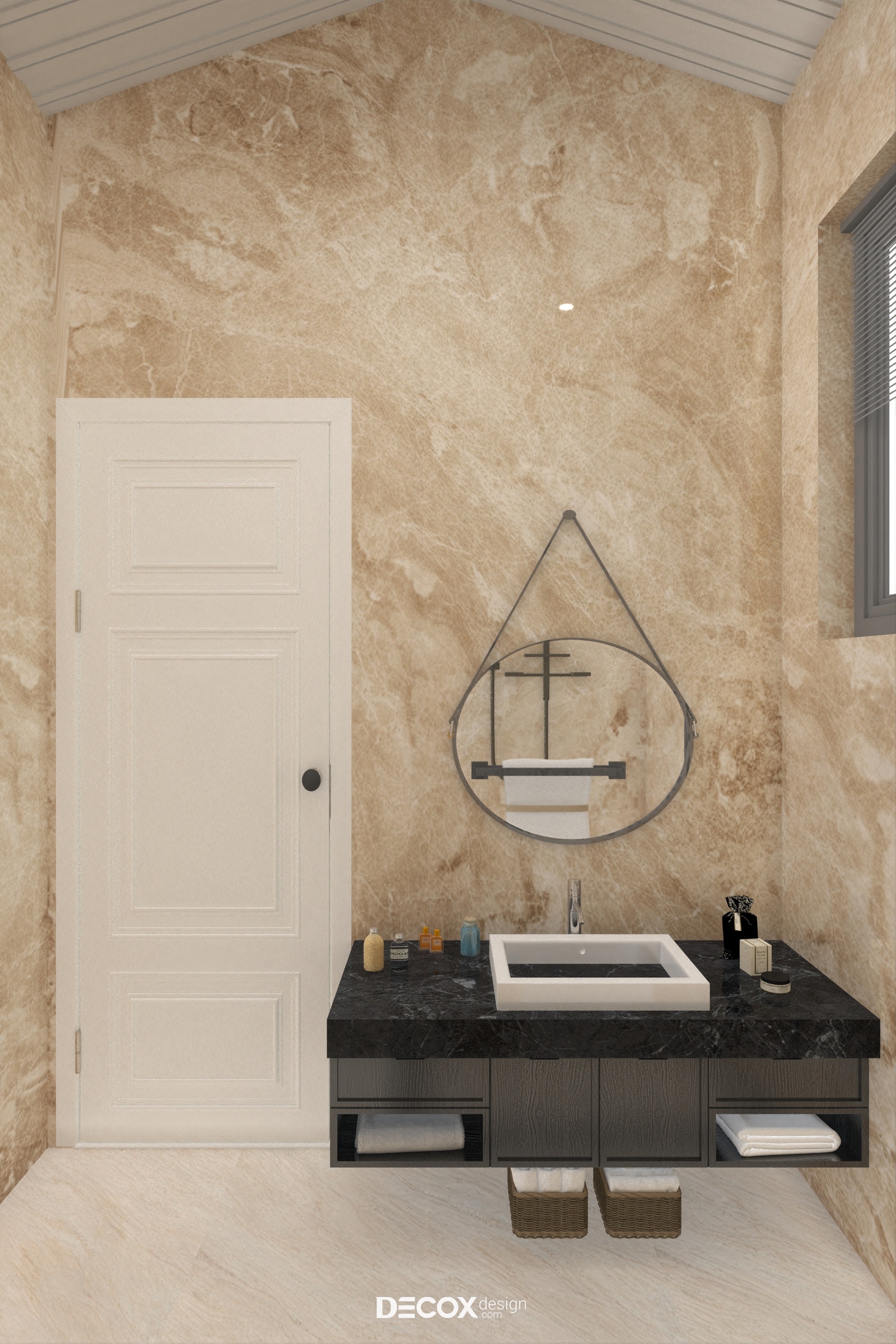 Thiết kế bếp dạng chữ I nhỏ gọn, đơn giản nhưng vẫn đảm bảo đầy đủ không gian lưu trữ nhờ hệ tủ bếp trên và tủ bếp dưới. Ở đây, KTS đã chọn lựa sử dụng tone màu trắng cho hệ tủ bếp nhấn điểm trên nền tường ốp đá marble vàng sang trọng. Khu vực WC đậm chất luxury với chất liệu đá marble cao cấp ốp lát toàn bộ các mặt tường. WC được thiết kế phân khu khô - ướt riêng biệt đảm bảo công năng cho người sử dụng.
