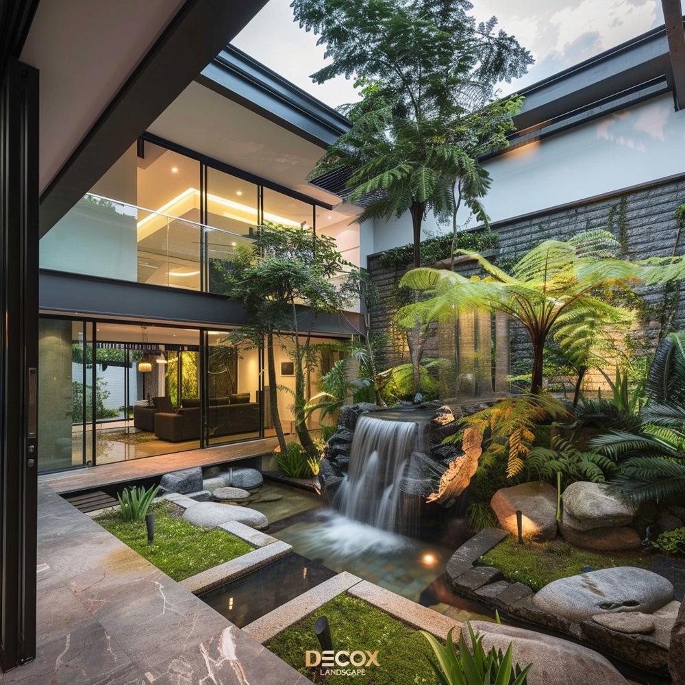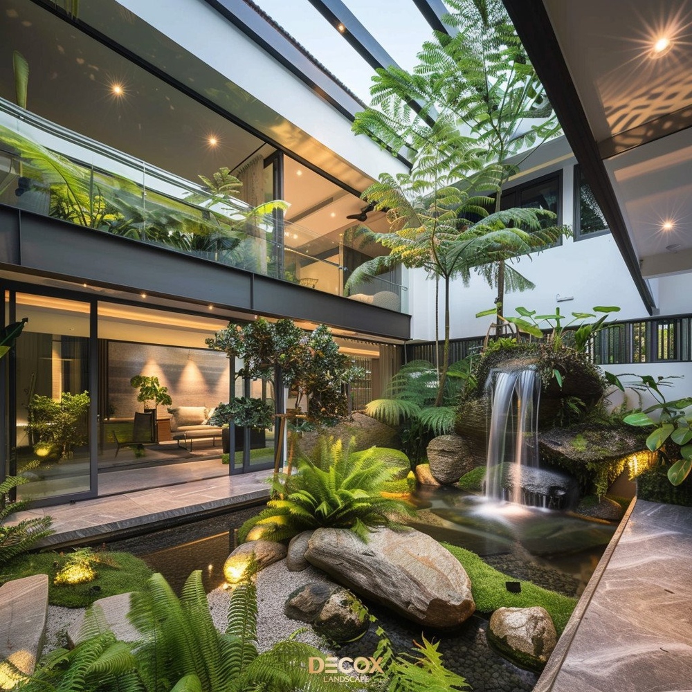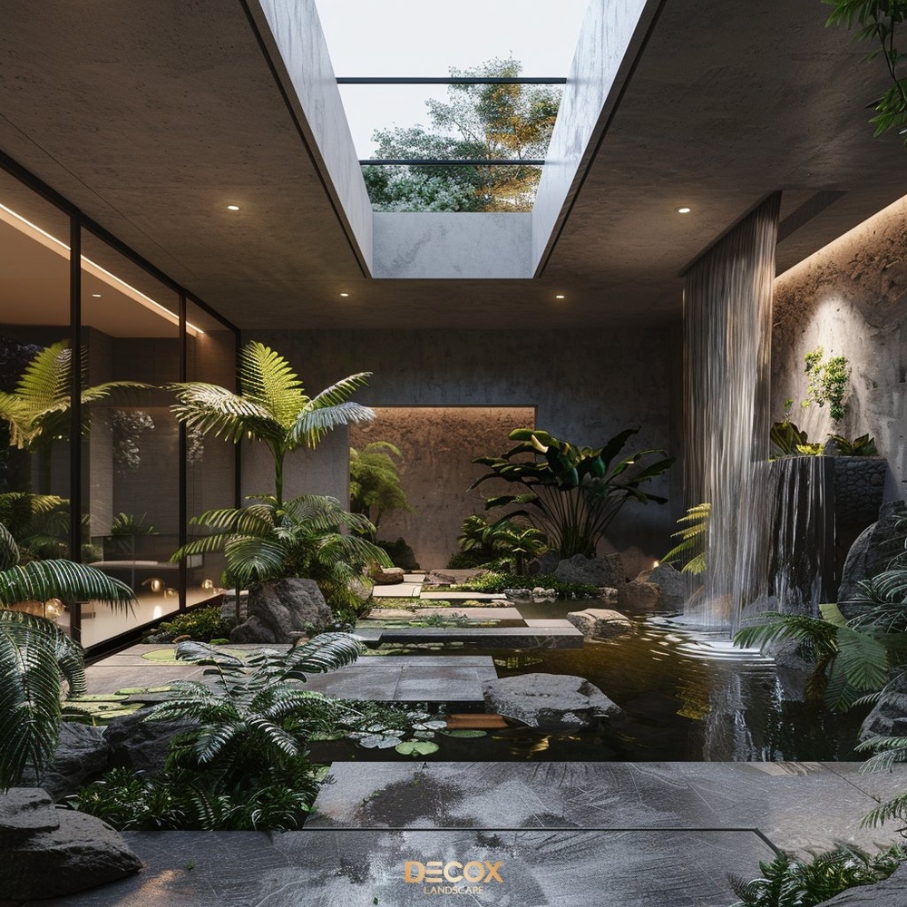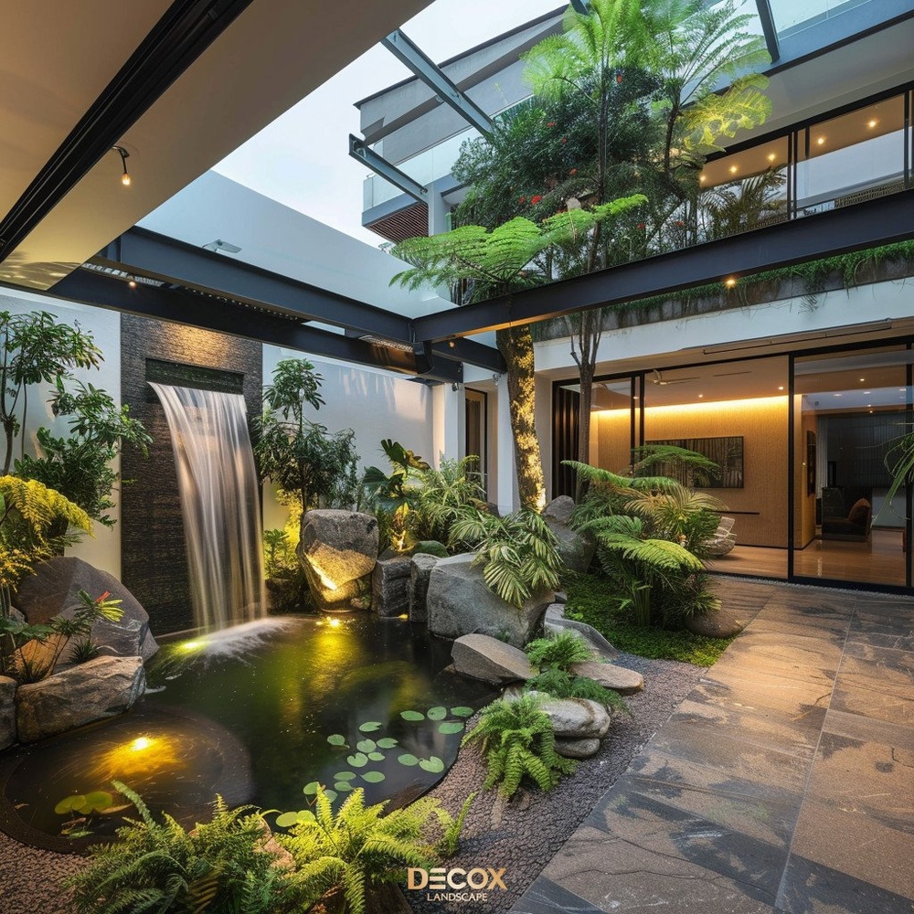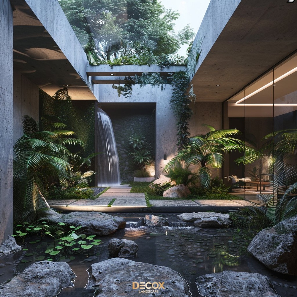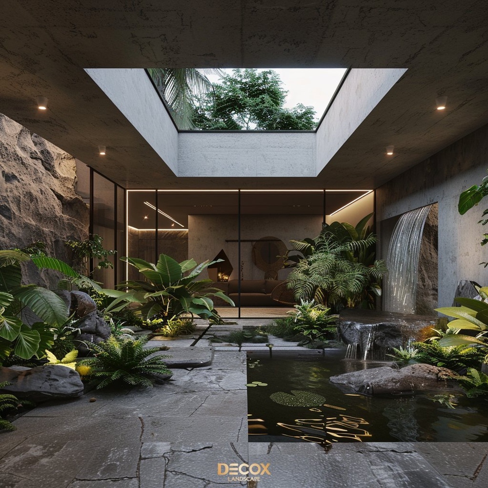 Một không gian sân vườn nhiệt đới đậm chất nghỉ dưỡng sẽ là tiền đề để bạn lấy lại tinh thần, xua tan mọi mệt mỏi ngay khi trở về nhà. Bằng cách vận dụng những loại cây vùng nhiệt đới kết hợp tiểu cảnh thác nước đầy sống động Decox đã mang đến một ốc đảo xanh ngay giữa những bức tường bê tông nơi thành thị.