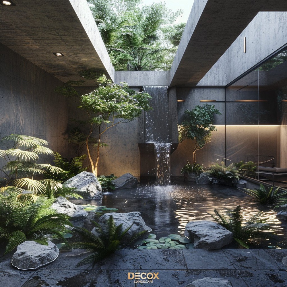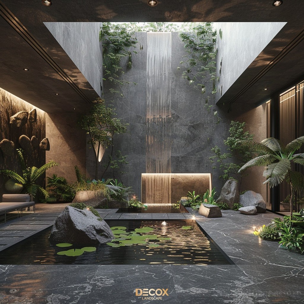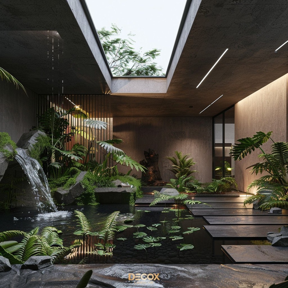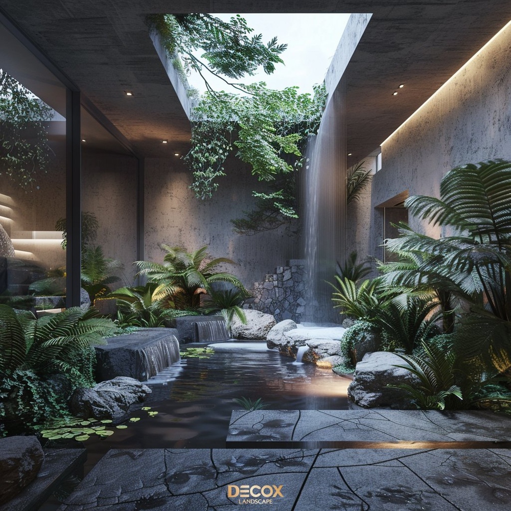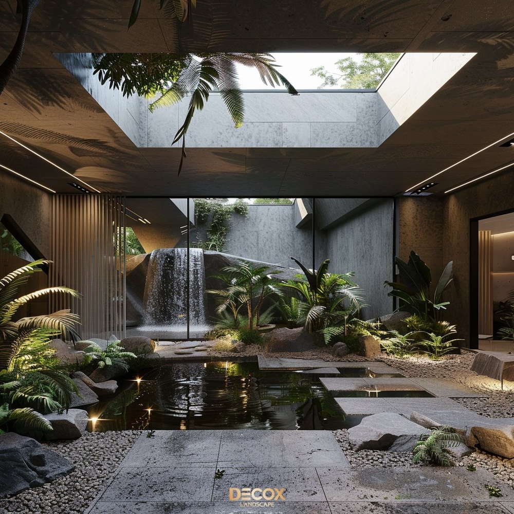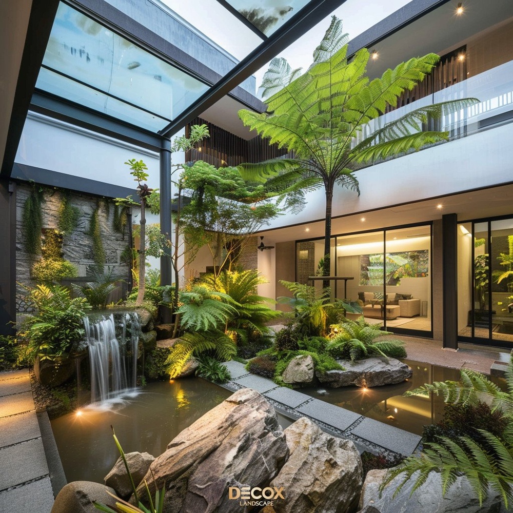 Một không gian sân vườn nhiệt đới đậm chất nghỉ dưỡng sẽ là tiền đề để bạn lấy lại tinh thần, xua tan mọi mệt mỏi ngay khi trở về nhà. Bằng cách vận dụng những loại cây vùng nhiệt đới kết hợp tiểu cảnh thác nước đầy sống động Decox đã mang đến một ốc đảo xanh ngay giữa những bức tường bê tông nơi thành thị.