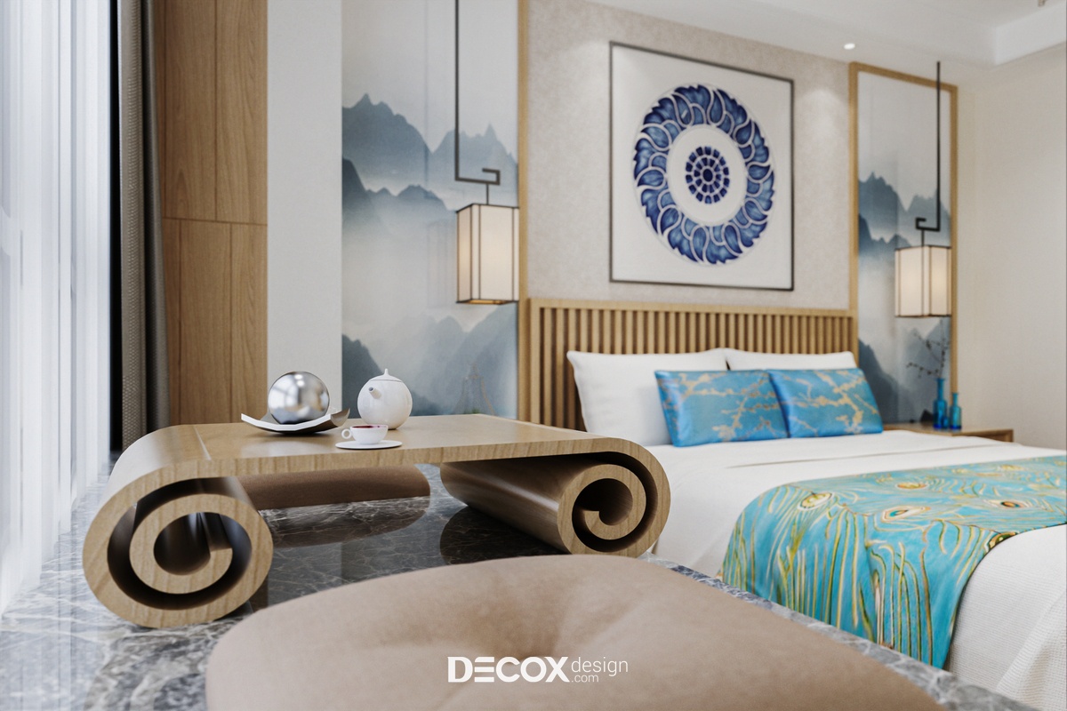 Văn hóa Trung Hoa đã từng khiến nhiều du khách ngỡ ngàng khi chiêm ngưỡng không chỉ bởi sự đồ sộ, tráng lệ, tinh tế trong cách kết hợp màu sắc cùng nội thất mà còn bởi những vật phẩm trang trí khiến người khác khó mà rời mắt tiêu biểu như đồ gốm sứ thượng hạng, lụa là, các bức họa sơn thủy, bình phong hay đèn lồng treo ấn tượng. Tất cả những chi tiết này đã được Decox Design dung hòa khéo léo trong thiết kế nội thất khách sạn Calandia nhằm mang đến một không gian ấm cúng nhưng không kém phần độc đáo, ấn tượng. Bên cạnh đó, văn hóa trà đạo truyền thống của đất nước này cũng sẽ được tái hiện tại dự án này.