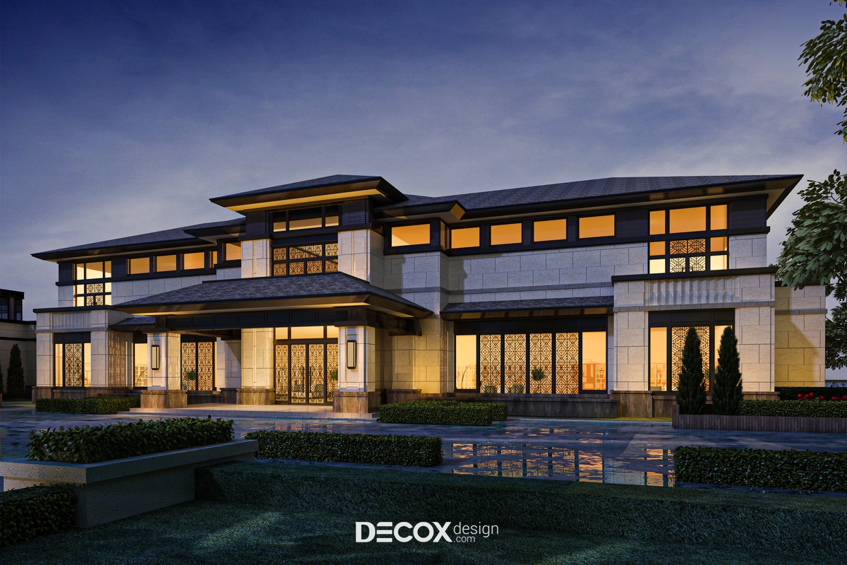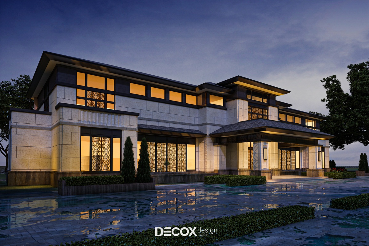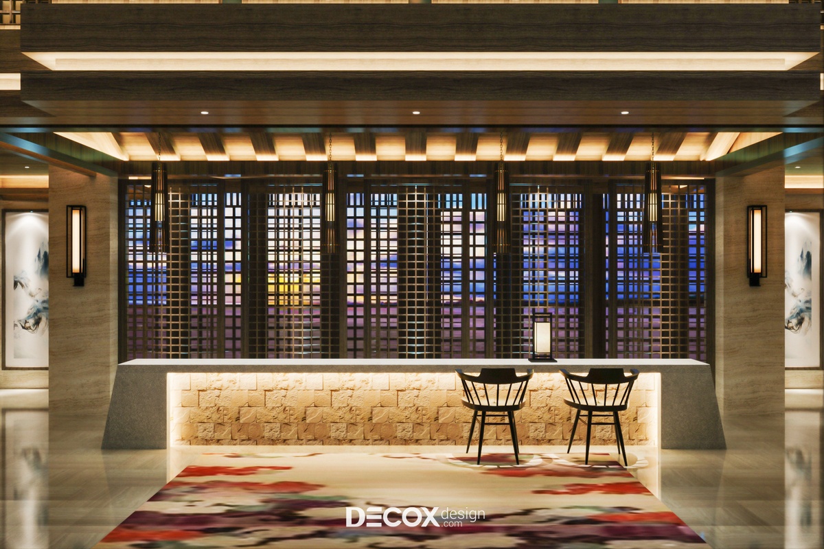 Thiết kế khách sạn ghi điểm ấn tượng nhờ kiến trúc đậm chất phương Đông. Khi nhìn vào tòa nhà bạn sẽ cảm nhận được một tổng thể ấn tượng với sự kết hợp từ nhiều chi tiết như thiết kế mái thái lợp ngói, những tấm bình phong chạm khắc họa tiết hình học, ánh sáng vàng hắt ra từ những khung cửa kính cùng vài chiếc đèn lồng treo tại khu vực lối ra vào....Tới đây chắc hẳn mọi người đã có thể dễ dàng liên tưởng đến những ngôi nhà Trung Hoa đã từng thấy qua khung ảnh nhỏ.