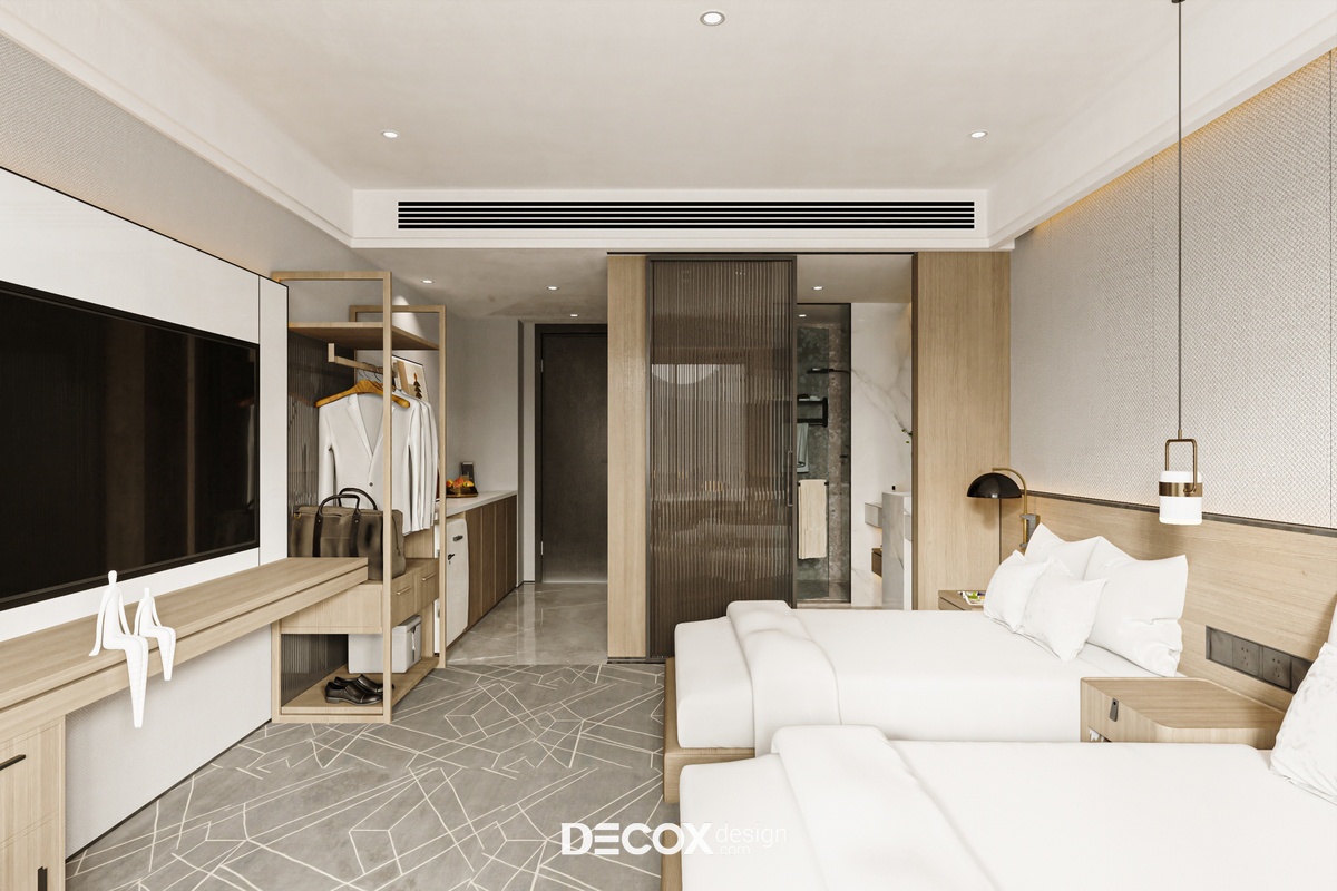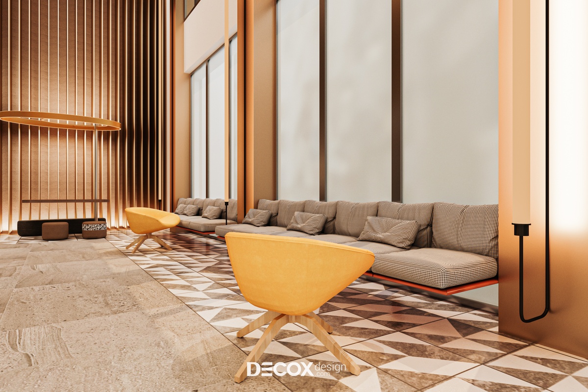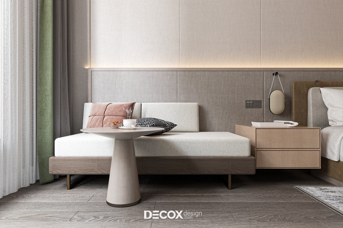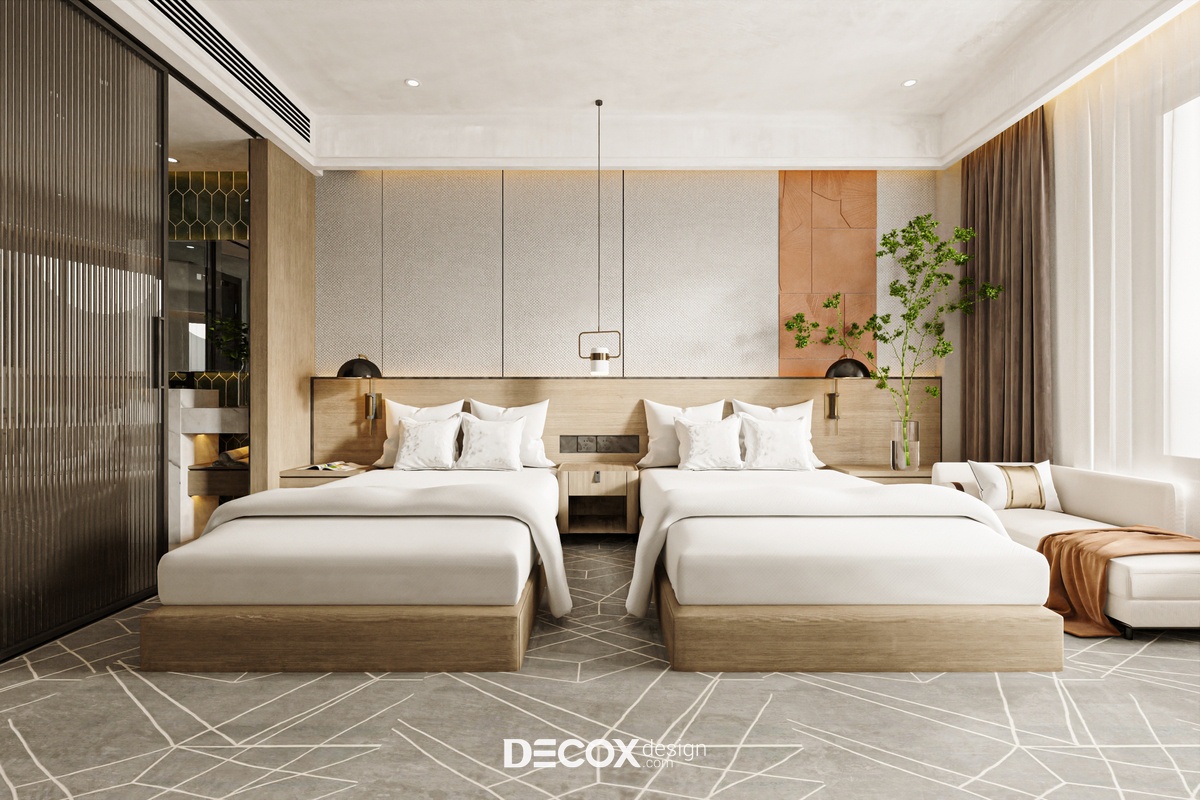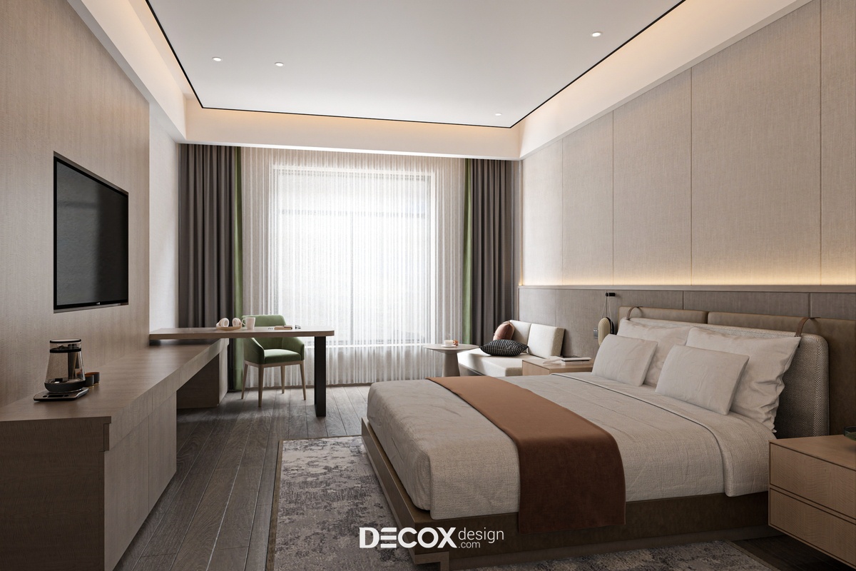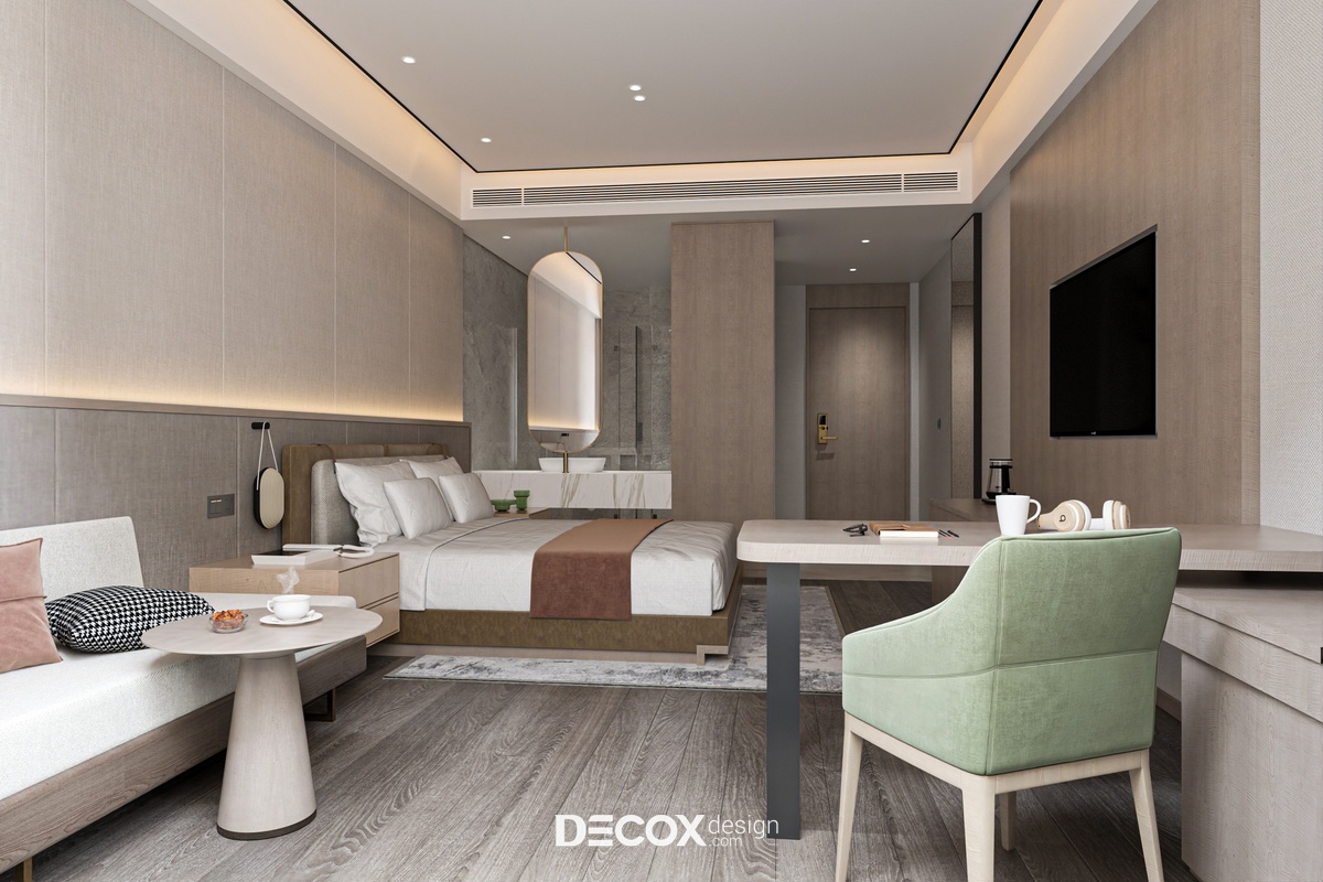 Nếu ngoại thất khách sạn mang đến cảm giác như một tòa thành đồ sộ, cổ kính thì không gian nội thất bên trong chắc hẳn sẽ khiến du khách bất ngờ với sự đối lập hoàn toàn. Nhằm đem đến một không gian nghỉ dưỡng hiện đại, cao cấp, đầy đủ tiện nghi nhưng vẫn tạo được sự ấm cúng, gần gũi với khách hàng thì ngoài những tone màu trung tính thanh lịch đóng vai trò chủ đạo KTS còn kết hợp thêm chất liệu gỗ cùng ánh đèn led vàng xuyên suốt từ khu vực tiền sảnh cho đến phòng ngủ khách sạn.