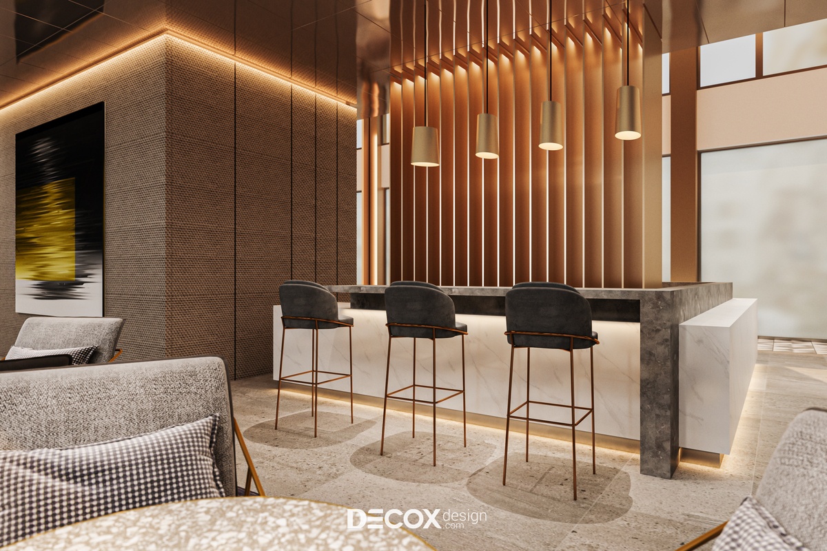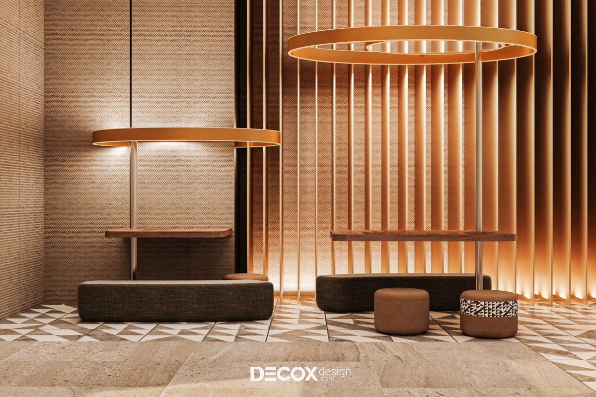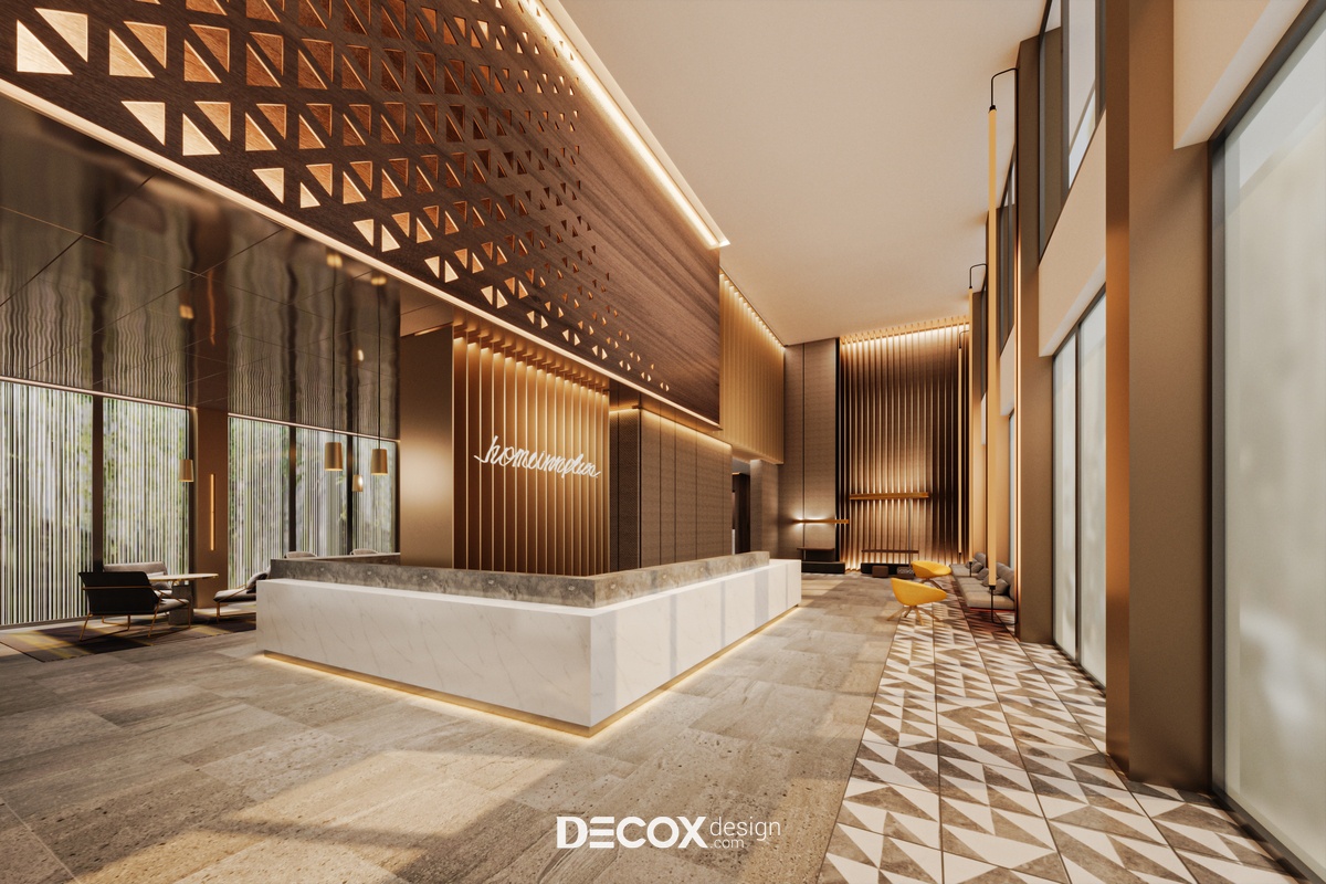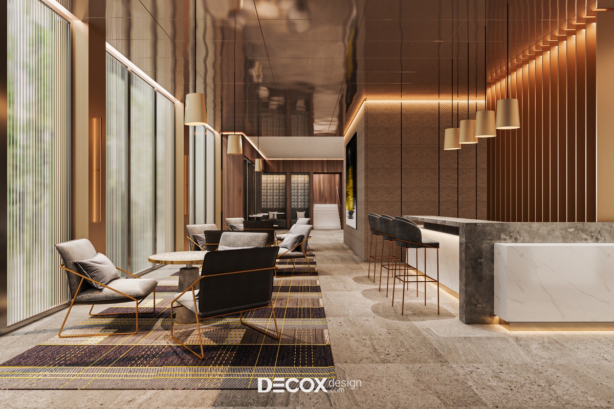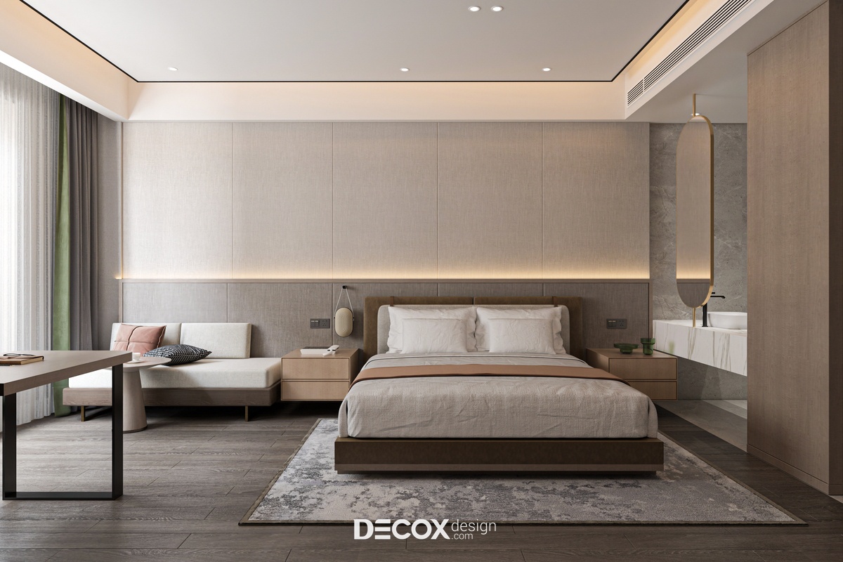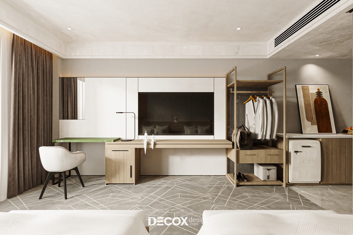 Nếu ngoại thất khách sạn mang đến cảm giác như một tòa thành đồ sộ, cổ kính thì không gian nội thất bên trong chắc hẳn sẽ khiến du khách bất ngờ với sự đối lập hoàn toàn. Nhằm đem đến một không gian nghỉ dưỡng hiện đại, cao cấp, đầy đủ tiện nghi nhưng vẫn tạo được sự ấm cúng, gần gũi với khách hàng thì ngoài những tone màu trung tính thanh lịch đóng vai trò chủ đạo KTS còn kết hợp thêm chất liệu gỗ cùng ánh đèn led vàng xuyên suốt từ khu vực tiền sảnh cho đến phòng ngủ khách sạn.