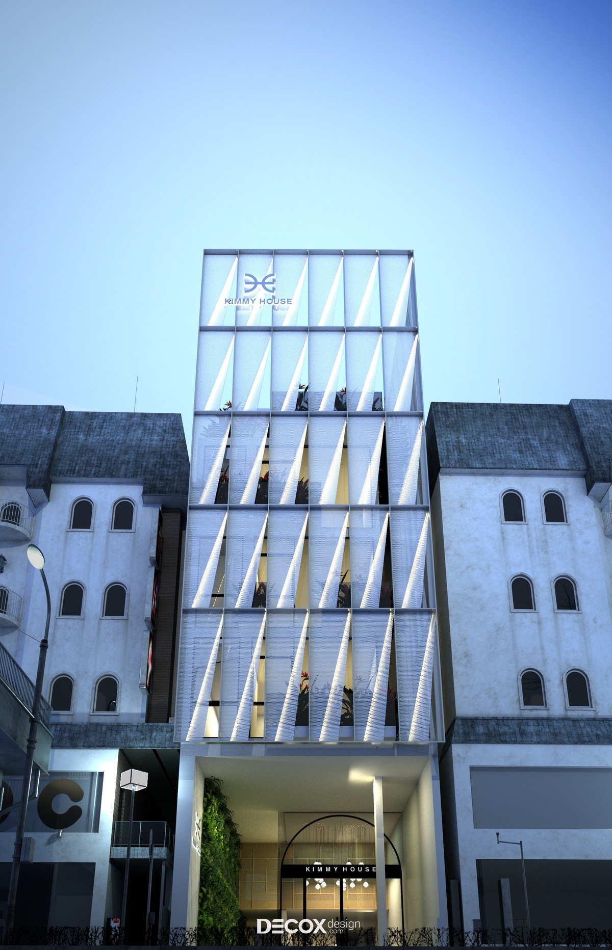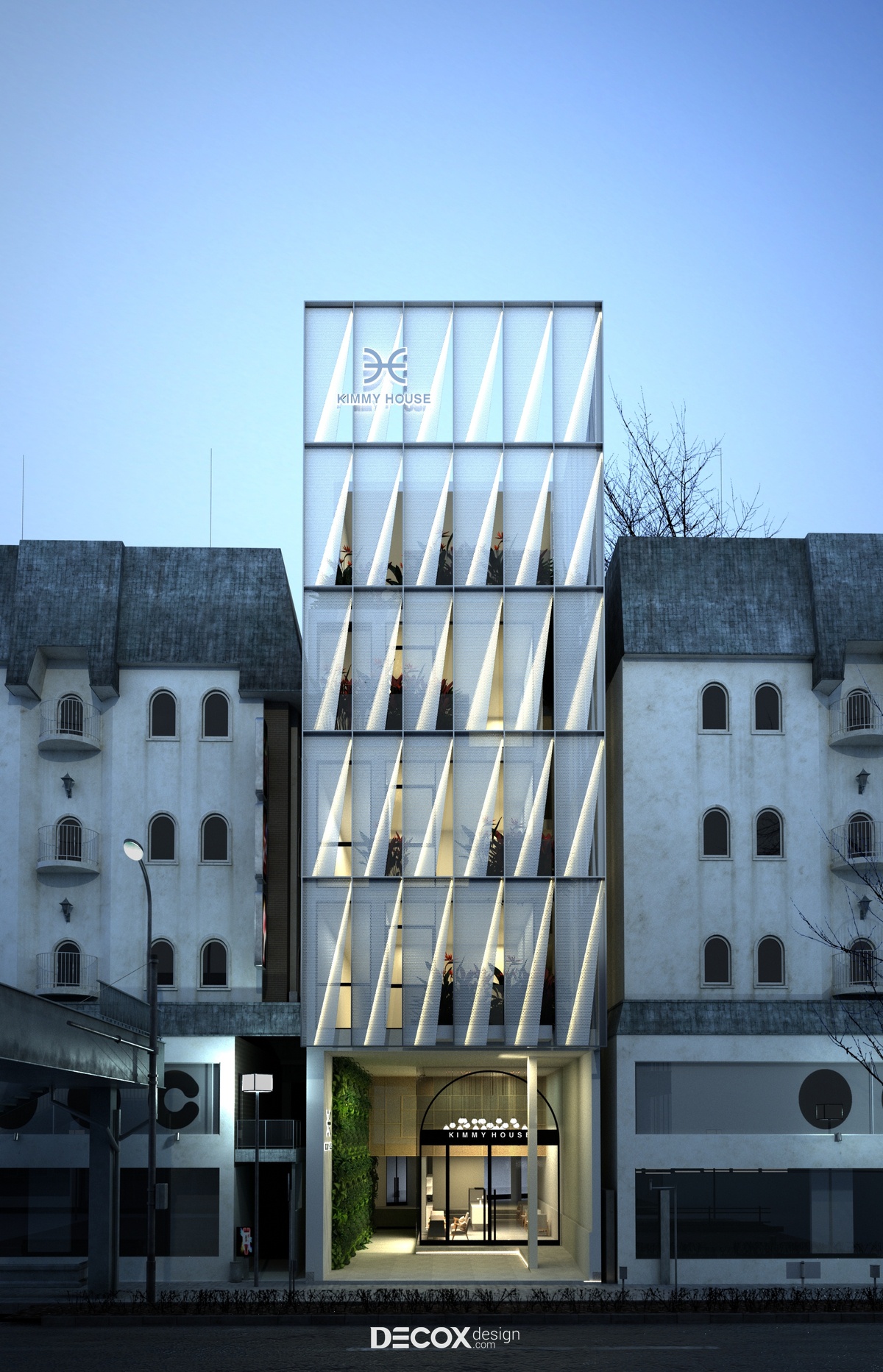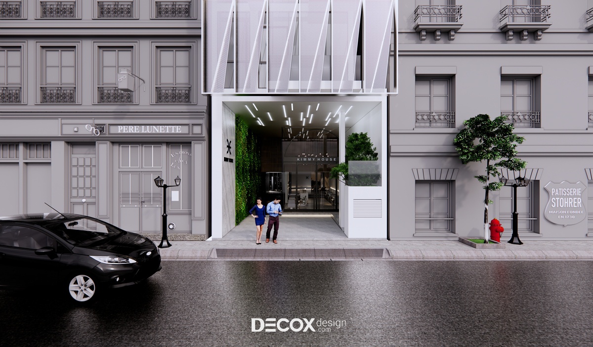 Nhằm mang đến một không gian tinh tế, năng động, trẻ trung và phù hợp với đại đa số đối tượng khách hàng, Decox Design đã chọn lựa phong cách hiện đại từ ngoại thất đến nội thất trong dự án khách sạn Kimmy House tọa lạc tại quận Phú Nhuận, Tp Hồ Chí Minh. Một trong những điểm đặc biệt của thiết kế khách sạn hiện đại có thể kể đến chính là sự linh hoạt trong lối kết hợp các loại chất liệu khác nhau nhằm tạo nên sự bứt phá riêng biệt. Và với dự án khách sạn này, các KTS đã chọn lựa chất liệu kính ốp toàn bộ mặt ngoài. Kính không chỉ tạo dựng không gian mở kết nối khách sạn với thành phố tấp nập mà còn gợi lên sự thời thượng, sang trọng và cao cấp.