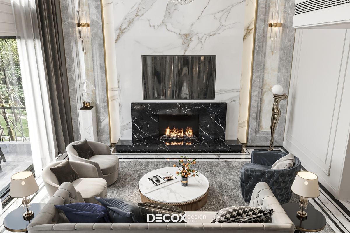 Thiết kế nội thất chủ yếu sử dụng tone trắng chủ đạo để những chi tiết khác được nổi bật hơn từ phào chỉ, chi tiết mạ vàng trên tường, đá cao cấp ốp tường, đèn chùm sang trọng cho đến đồ nội thất đậm chất bán cổ điển. Ngoài ra, biệt thự còn được trang bị rất nhiều cửa kính lớn nhằm đón bắt tối ưu nguồn sáng tự nhiên vào nhà. Ánh sáng sẽ là nhân tố bổ sung cho không gian thêm tính thẩm mỹ.